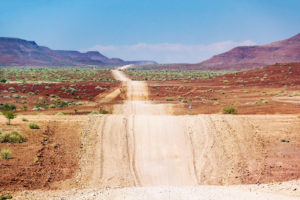 Der lange Weg hoch in den Norden nach Epupa führt uns durch die Weiten Namibias. Zwei Tage lang geht es oftmals geradeaus über hügelige Schotterpisten ohne Ende und was eintönig klingt ist doch spannender als gedacht. Immer wieder erleben wir Ausblicke über die riesigen Täler und ab und zu überraschen uns Erdhörnchen, Straußenbabys und Impalas.