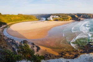 Dürfen wir vorstellen: Unser Lieblingsplatz an der Westküste. Er hört auf den komplizierten Namen Praia de Odeceixe und ist für uns definitiv der schönste Strand 🙂 Er kombiniert Felsabschnitte mit einem feinsandigen Strand – der wie eine Landzunge aussieht – einen glasklaren Fluss, hohe Klippen im Norden und ein hübsches Dorf am Südende. Das alles eingebettet in einem grünen Tal – traumhaft!