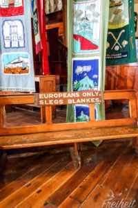 Bank mit der Aufschrift „Nur für Weisse“ in Englisch und Afrikaans