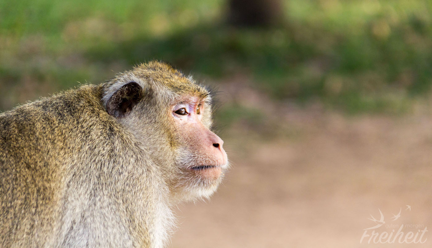 Schon oft haben wir von den gewitzten und Touristen beklauenden Affen in Südostasien gehört. Aber noch nicht so wirklich welche gesehen. Zumindest nicht in Thailand. Hier in Kambodscha entdecken wir nun endlich mal welche. Lieb und unschuldig hockt einer mit Banane auf einer Mauer, ein anderer sucht seinen Kameraden nach Flöhen ab und ein weiterer hockt auf einem Stein und schaut sich um. Scheinbar mögen die Parkmitarbeiter keine Affen, denn einer von ihnen nähert sich dem sitzenden Exemplar und macht drohende Wurfgebärden. Dieser reagiert mit fletschenden Zähnen und sucht dann sprunghaft das Weite. Entgeistert schaue ich den Parkwächter an. Dieser lacht dem Affen hinterher. Carsten sucht das Gespräch. Wie passt denn Buddhismus mit dieser Attacke zusammen? Sind nicht alle gleich? Er erfährt, dass das nicht auf Tiere zutrifft. Besonders Affen, die manchmal Touristen angreifen, sind deshalb nicht erwünscht. Dies entsteht dadurch, dass Touristen, die immer darauf hingewiesen werden die Affen nicht zu füttern, sich nicht daran halten. So verlieren die Affen ihre natürliche Scheu dem Menschen gegenüber und wollen eben immer mehr. Alles wie beim Menschen 🙂 Und wieder einmal sind die Leidtragenden die Tiere.