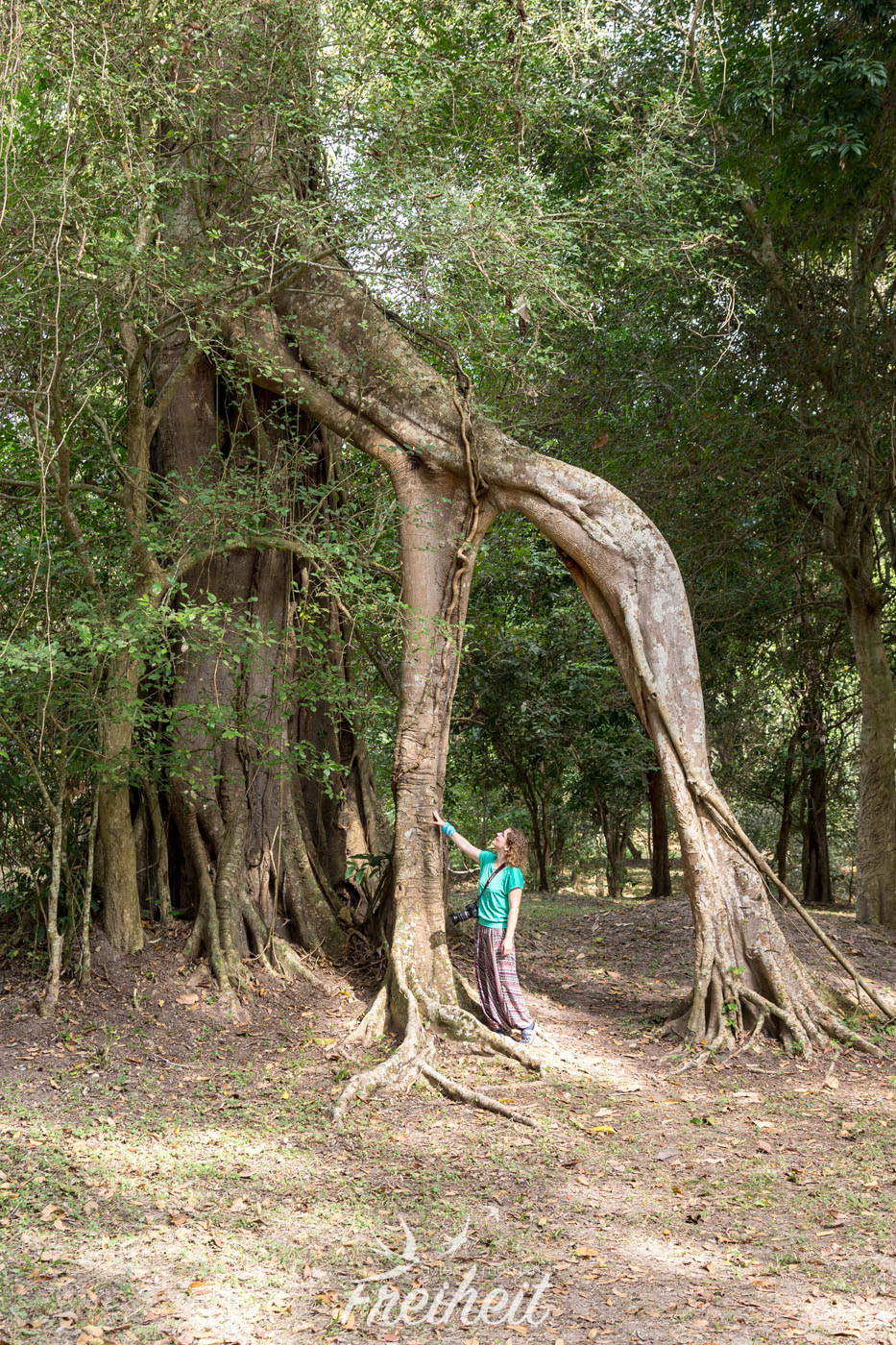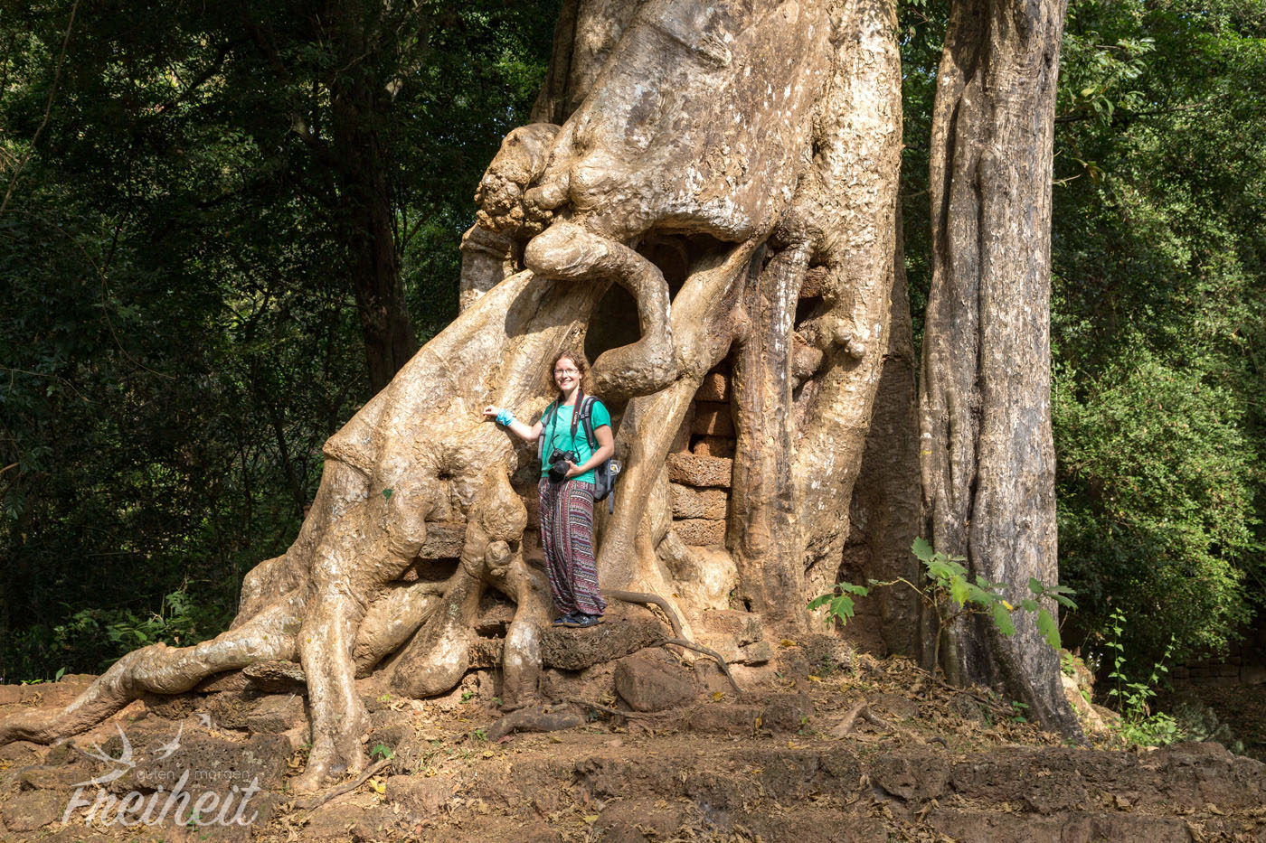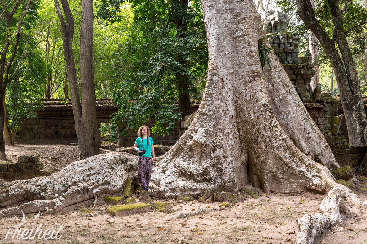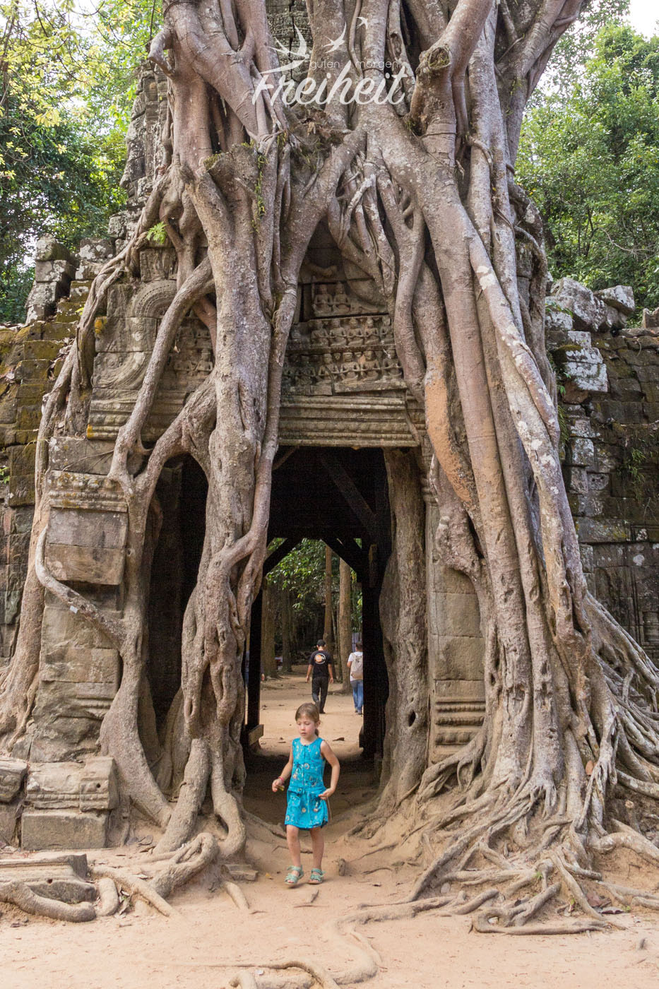 Nach Bayon starten wir heute die sogenannte „Große Runde“. Die Tour beinhaltet Tempel, die nicht ganz so überlaufen sein sollen, da sie weniger beliebt sind. Und nicht mehr ins Programm der Tagesticket Touristen passen. Wir erreichen Preah Khan, eine ehemalige Stadt im Angkor Reich. Auf dem Weg zum Tempel warten – wie bei jedem Tempel – Verkaufsstände von Souvenirs, Kleidung, Malereien u.v.m. auf Kundschaft. Wir sehen eine kleine Tribüne auf der Landminenopfer traditionelle Musik spielen und auf Spenden und CD Verkäufe hoffen. Landminen sind im geschichtlich stark gebeutelten Kambodscha noch immer ein großes Problem und außerhalb der Touristengebiete sollte man die Wege nicht verlassen. Zu viele Landminen kosten den Bewohnern Beine, Arme oder sogar das ganze Leben. Leider gibt es kaum Unterstützung für diese armen Menschen und so sind sie auf die Spenden der Besucher angewiesen. Auch wir spenden mehrfach. Die Tempelanlage ist beeindruckend – natürlich 😉 und auch hier lassen uns die riesigen Bäume staunend stehen. Ja, sie sind wirklich unglaublich faszinierend und wir können nur jedem empfehlen einmal nach Kambodscha zu reisen um sich das Angkor Reich anzuschauen. Dafür muss man nicht mal Kulturinteressierter sein. Versprochen, es lohnt sich. 😉