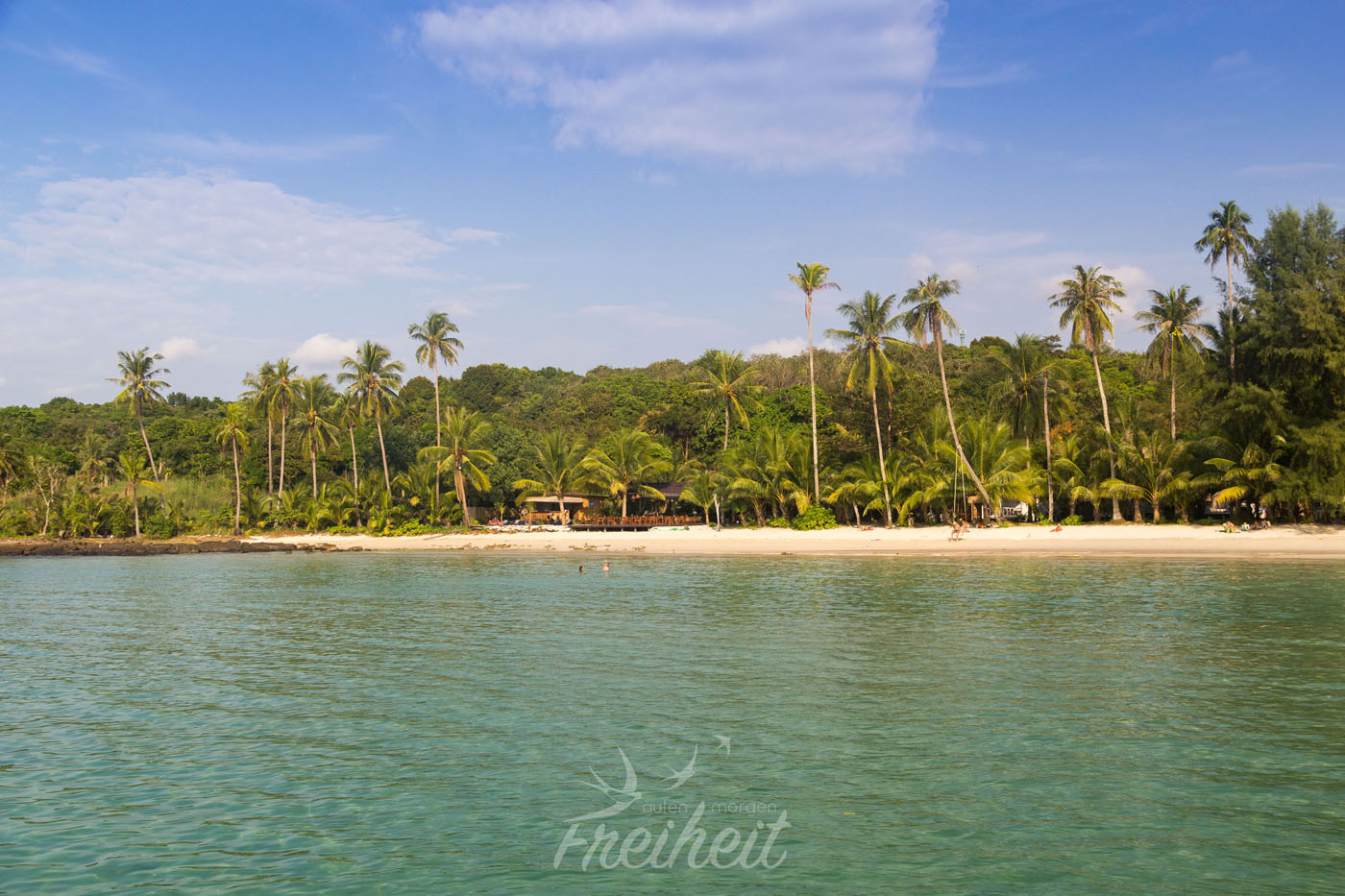Herzliches verabschieden. Ein Pick Up bringt uns zum gut gefüllten Speedboot. Ein paar müssen während der Überfahrt stehen, wir glücklicherweise nicht. Dafür sind nur noch Sitzplätze in der prallen Sonne übrig und der erste Sonnenbrand wird sich noch zeigen. Der Fahrtwind pfeift uns um die Ohren und dank glatter See ist die Fahrt nicht allzu ruppig. Fast jedes Strand Resort auf Koh Kood scheint einen eigenen Pier zu haben, so dass die Crew immer nur das entsprechende Resort als Anlegestelle ausruft. Nach 45min kommen wir an einem Traumstrand an und steigen aus.