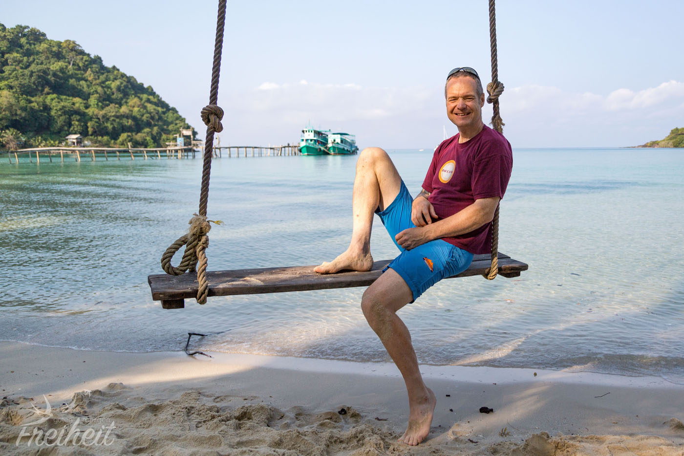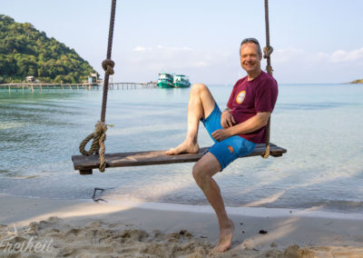 Wir hoffen hier eine Unterkunft für sechs Tage zu finden. Gebucht haben wir nichts, aber von einem anderen Reisenden diesen Tipp hier bekommen. Wird schon klappen. Über den brüchigen und irgendwie wellenförmigen Pier erreichen wir Siam Beach. Wir fragen uns durch und erfahren, dass unser anvisiertes Resort nur noch was für drei Tage hat. Schade. Wir gehen weiter – mit unserem gesamten Gepäck geht es den Strand dem südlichen Ende entgegen. Da ganz hinten gibt es doch auch noch ein paar Hütten.