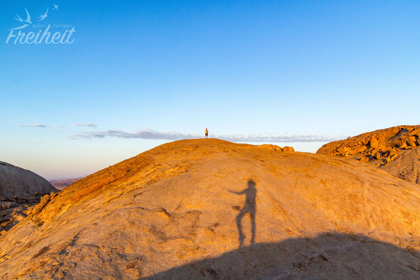Nach gefühlt hundert geknipsten Panoramafotos steigen wir ab, Carsten setzt sich wieder ins Auto und ich stehe als Wendehilfe draussen bereit. Plötzlich ruft jemand von hinten laut „hello!“ Ich drehe mich um und sehe einen Namibier in zerrissener Kleidung von der anderen Seite des Zauns auf uns zu laufen. Im ersten Moment denke ich noch „Ach verdammt, der will uns bestimmt anpampen, weil es doch nicht erlaubt ist hier hochzufahren“, aber dann verstehe ich, dass er uns das Eingangstor aufmachen will, damit wir dahinter besser wenden können. Wir kommen mit ihm ins Gespräch und erfahren, dass er den Sende- und Kommunikationsturm bewacht und hier oben auch lebt. Komplett allein. Dafür könne er jeden Tag den Sonnenauf- und Sonnenuntergang sehen. Und hätte eine geniale Aussicht. Nur wenn er wieder Lebensmittel bräuchte, müsse er in die nächste Stadt trampen. Ein Tagesausflug. Vorallem weil hier auch so oft Autos vorbeikommen….Einfach vollkommen unvorstellbar für uns. Wir bedanken uns bei ihm und hoffen wir konnten seinen heutigen Tag mit dem netten Gespräch bereichern.