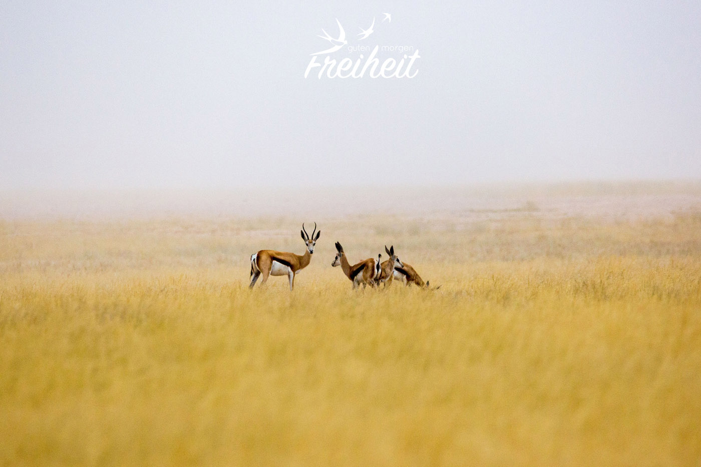 Noch bevor die Sonne durch den Nebel durchbricht dürfen wir eine riesige Springbock Herde beobachten, die wie auf der Flucht in hohem Tempo durch die Graslandschaft galoppiert und dabei zum Teil riesige Sprünge macht. Das sieht richtig komisch aus, denn die Sprünge gehen nicht nur in die Horizontale sondern auch in die Vertikale. Springböcke können ja unglaubliche 90km/h schnell werden und bis zu 10m weit springen. Und das obwohl diese Antilopenart eher zu den kleineren Tieren gehört! Einen Fressfeind haben wir übrigens nicht gesehen. Allerdings sollen Springböcke wohl ab und an aus purer Lebensfreude durch die Luft springen. Freudensprünge eben 🙂