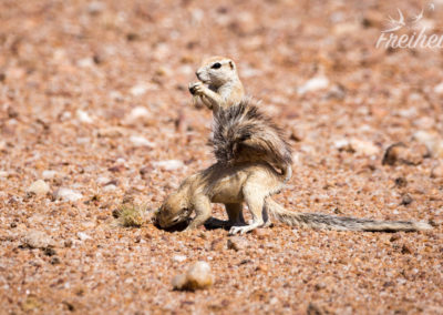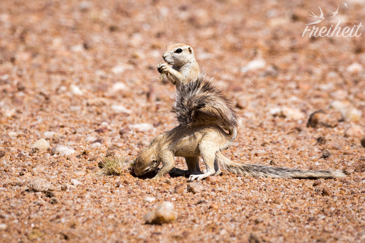 Zwei süße Erdhörnchen (nicht zu Verwechseln mit Erdmännchen). Ihren langen Schwanz nutzen sie oft als Schirm um sich vor der Sonne zu schützen.