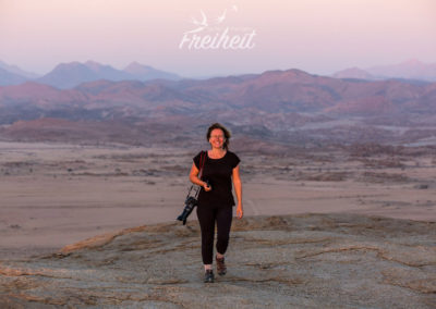 Die Blutkuppe macht nun ihrem Namen alle Ehre und wechselt ihr sandfarbenes Kleid zu einem orange-rotem Outfit. Der Sonnenuntergang taucht die Namib unter uns in ein sanftes Pastell-Lila und lässt uns breit grinsend am Gipfel stehend zurück. Dass die Wüste so viele Farben und Gesichter haben kann, begeistert uns schwer!
