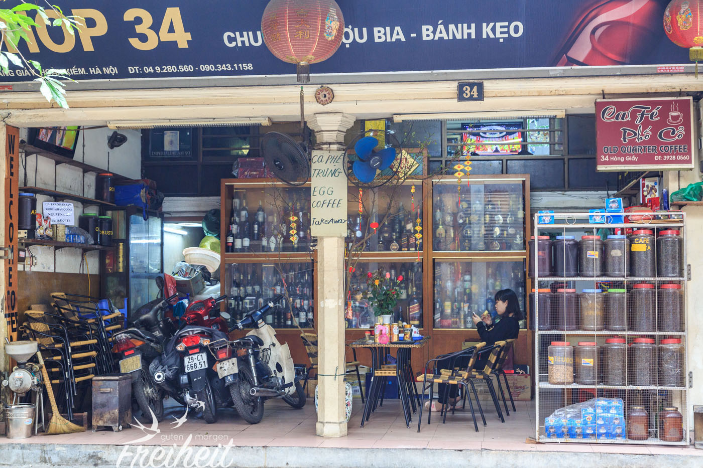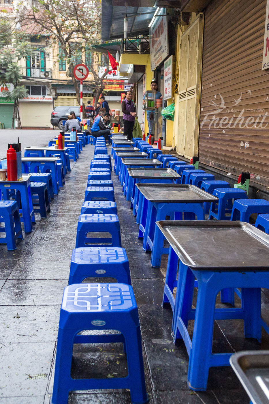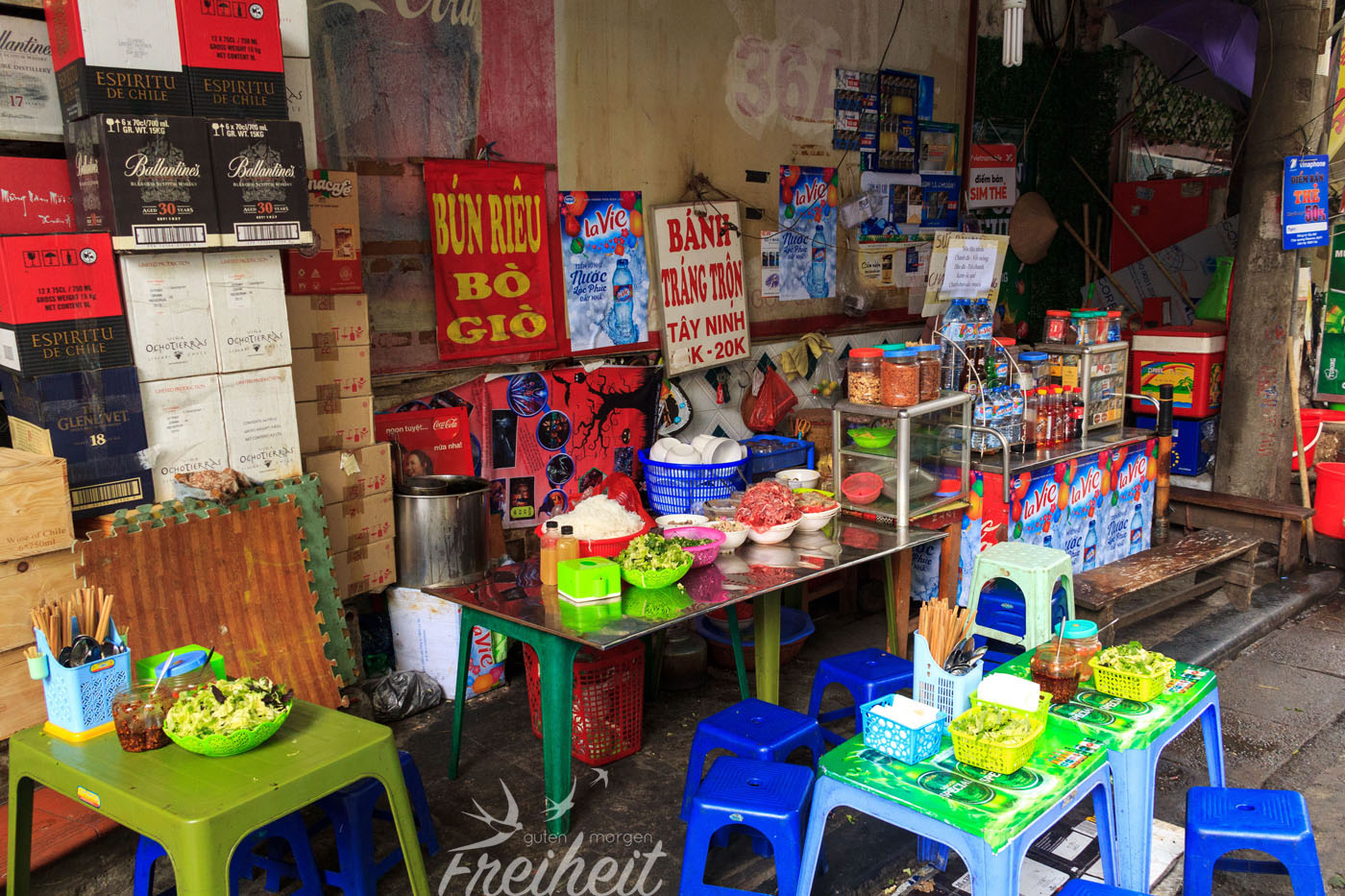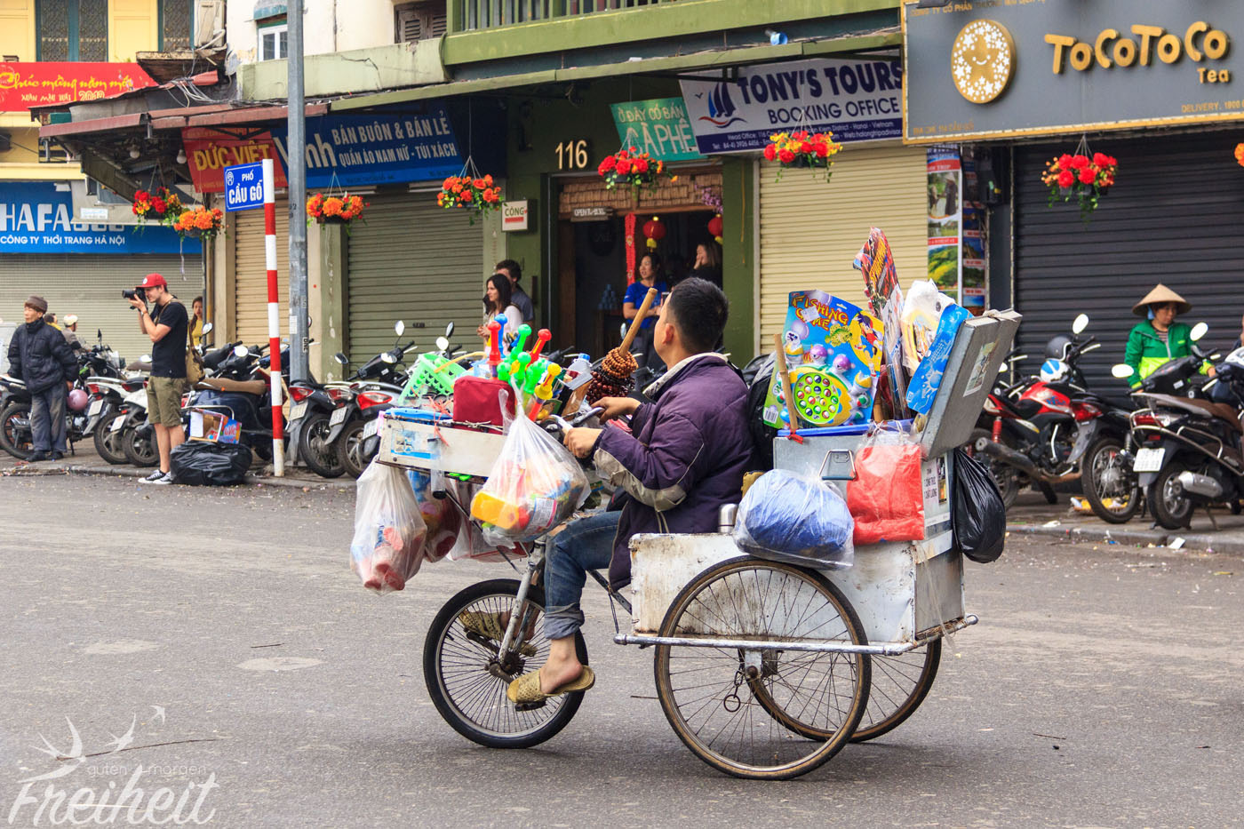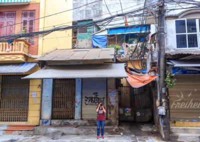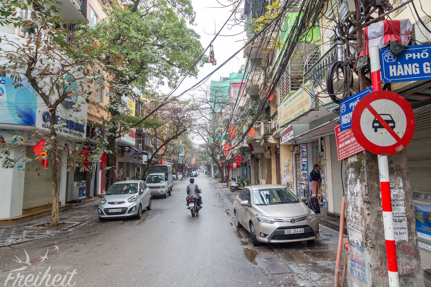 Nun gut, unser Hunger und unsere Neugier treibt uns durch die Altstadt und direkt wieder zurück ins Hotel. Hier ist es heute noch genauso wie am 13.2. und keinen Deut angenehmer! Hoffentlich wird es morgen an Neujahr ruhiger. Von der Silvesternacht bekommen wir in unserem Zimmer kaum etwas mit und am nächsten Morgen gehen wir gespannt vor die Hoteltür. Unfassbar, kaum Verkehr, wenig Menschen, nur diverser Glitter liegt noch zusätzlich auf den Straßen. Wir frühstücken im Hotel und gehen mit unseren Kameras durch die sonst so überfüllte Altstadt. Es ist toll, wir können in Ruhe, naja fast ;-), auf der Straße stehen bleiben und sogar auf den Gehwegen gehen. Wir treffen auf einige Gleichgesinnte, die ebenfalls mit ihren Kameras auf der Suche nach tollen Motiven sind. Andere wiederum shooten ihre Motorräder, oder Freundinnen und Fotografen machen Auftragsarbeiten andere wiederum fahren mit laufender Kamera auf dem Moped durch die Gassen. Es ist schon eine bizarre Stimmung in dem sonst so hektischen Hanoi.