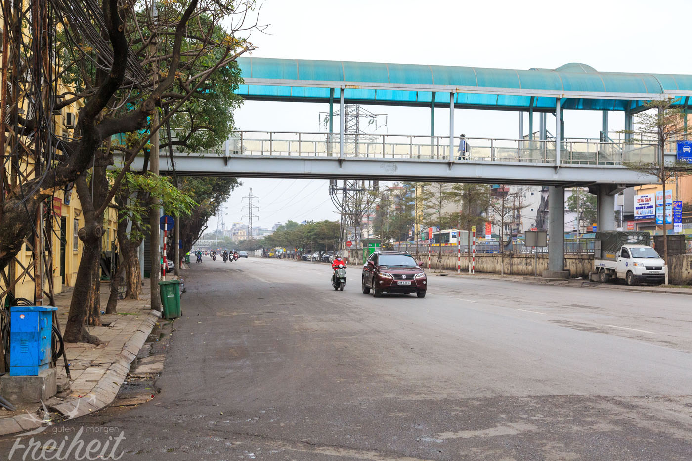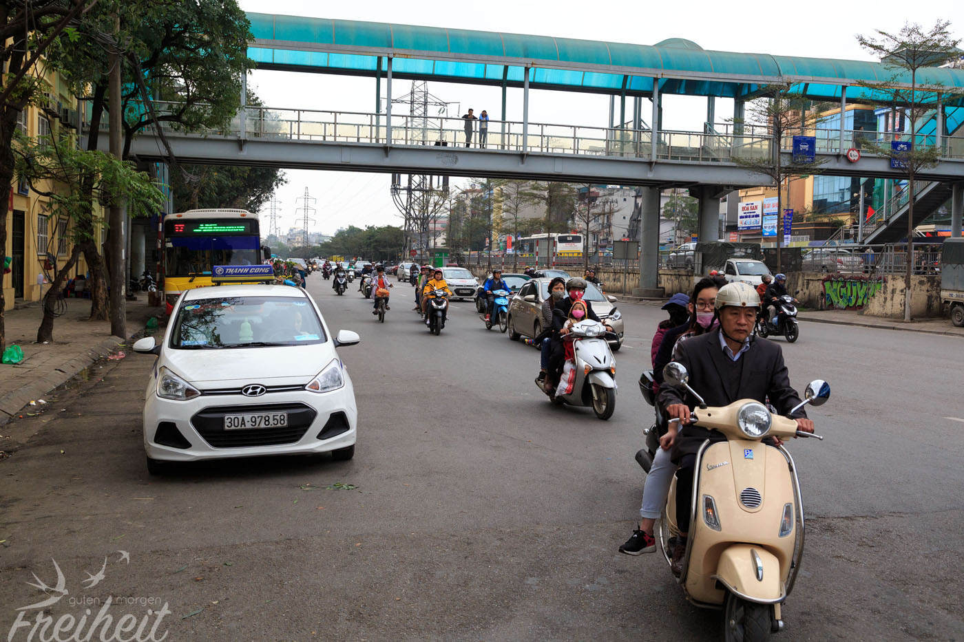 Die meisten Menschen sehen wir am Hoan Kiem See und dort herrscht eine freudige Neujahrsstimmung mit vielen Hunde-Luftballons (es ist das Jahr des Hundes), traditionellen Kleidern und jeder Menge Paaren und Familien, die sich gegenseitig fotografieren und die Uferpromenade entlang bummeln. Hier ist die Straße auch schon wieder stärker befahren und es heißt wieder Augen auf beim Überqueren.