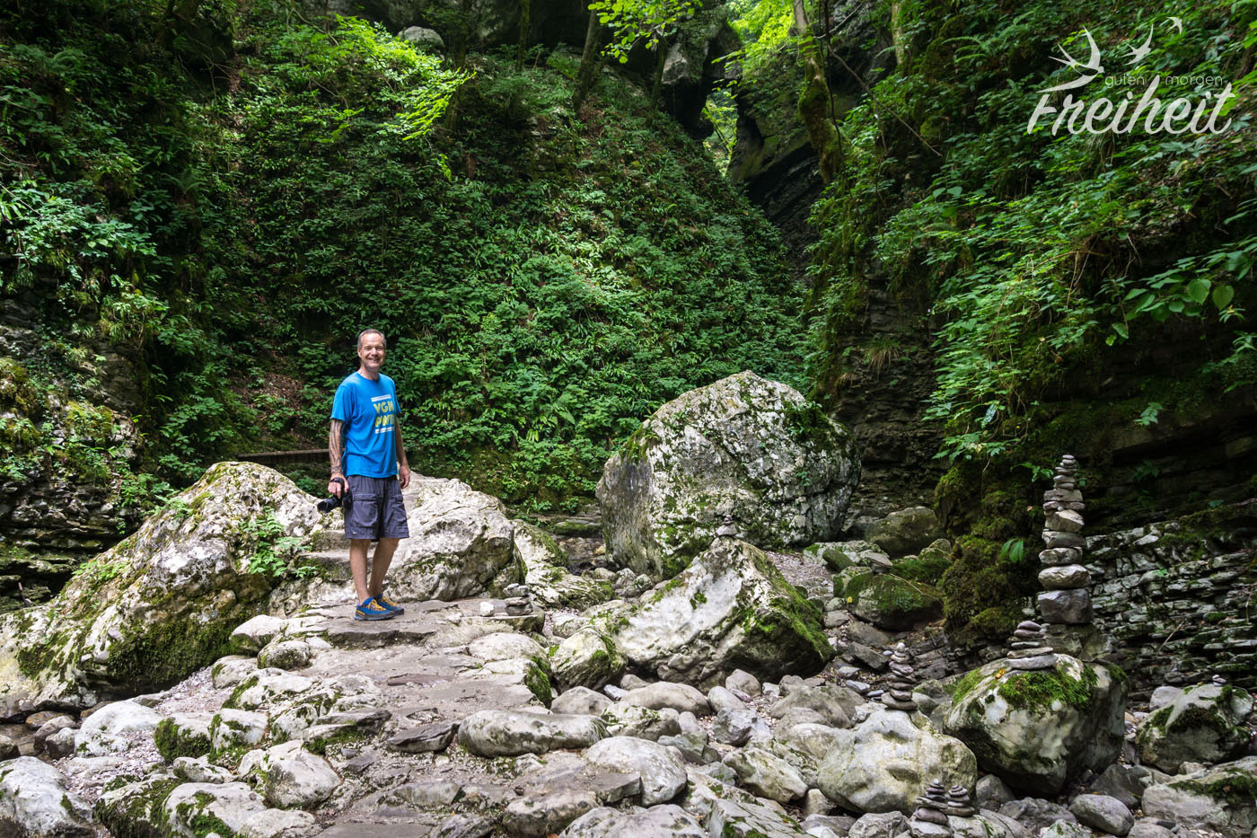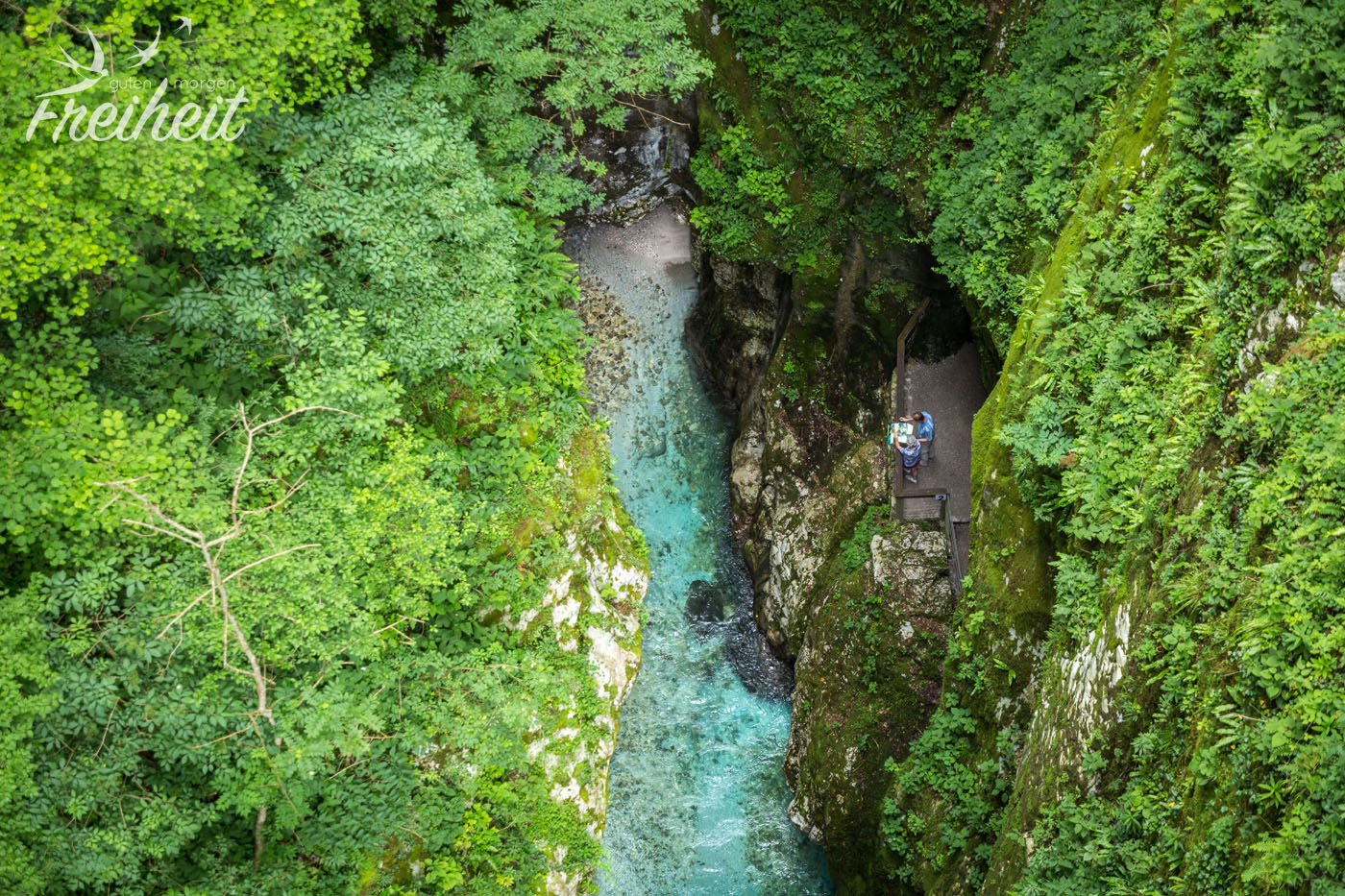 Ein 4km langer Rundweg führt uns zu den Hot Spots der Klamm. Zu Beginn ist der Weg noch harmlos und führt auf Höhe des Flusses entlang, bis uns später dann ordentliche Wadenarbeit in Form von verdammt vielen Treppen und Aufstiegen erwartet. Da hilft es dann nicht viel, dass in der Klamm feucht-kühle Temperaturen herrschen. Hier kommt man ganz gut ins Schwitzen 🙂 Zur Belohnung gibt es aber einen Blick aus der Vogelperspektive hinab in die Tolminer Klamm. Die unfassbar klare Wasserqualität lässt uns selbst von hier oben bis auf den Grund blicken.