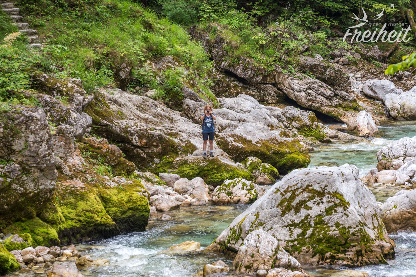 Nach der Soča folgt nun das Flüsschen Kozjak und schon nach einer dreiviertel Stunde stehen wir am Wasserfall, der sich in ein dunkelgrünes Becken ergießt. Wir stehen in einer Art Höhle, die nach oben hin geöffnet ist und neben dem Wasserfall auch Tageslicht hineinfließen lässt. Traumhaft schön. Baden ist auch möglich – aber nichts für Warmduscher 😉 Wir sind nicht die einzigen hier und Fotoshootings vor dieser Kulisse finden vermutlich nicht nur heute statt 🙂