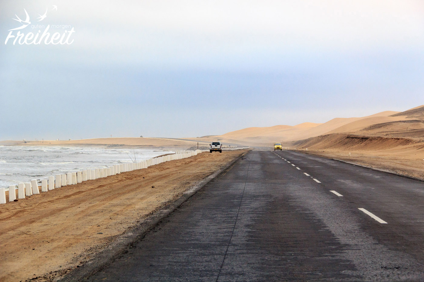 Der Morgen ist recht dunstig und bewölkt. Nicht ungewöhnlich für diese Gegend. Schuld hat der kalte Benguela Strom aus der Antarktis, der hier vor der Küste seine Bahn zieht. Die Nebelfelder sind oft so dicht und undurchdringbar, dass hier früher wie heute immer wieder Schiffe auflaufen. Dank der vielen Schiffsgerippe bekam die Küste den Namen Skeleton Coast. Dabei bezieht sich der Name auch auf die Skelette, die von den armen Schiffsbrüchigen kommen. Haben sie zwar das Unwetter und Auflaufen vielleicht überlebt, so waren ihre Überlebenschancen in der direkt angrenzenden lebensfeindlichen Wüste gleich null. Bis heute ist die Skeleton Coast ein gefährliches Gewässer für die Schifffahrt. Um die Wracks sehen zu können muss man in den nördlichen Teil der Skeleton Coast – dafür braucht man allerdings eine Erlaubnis, die man sich in der Hauptstadt abholen muss.