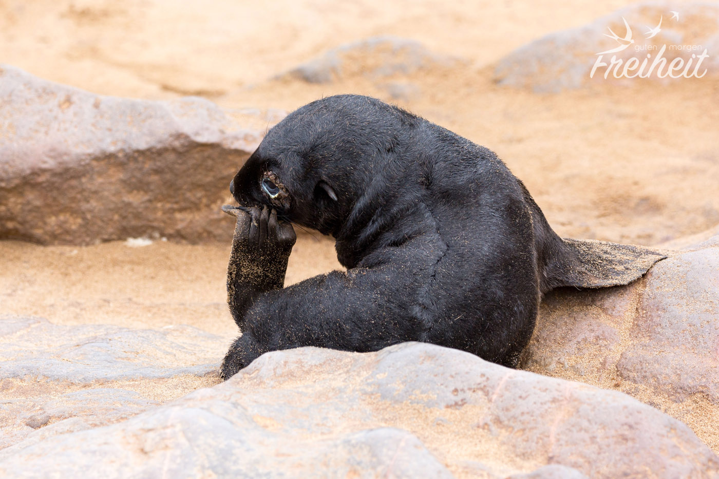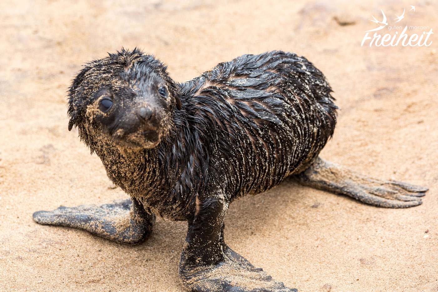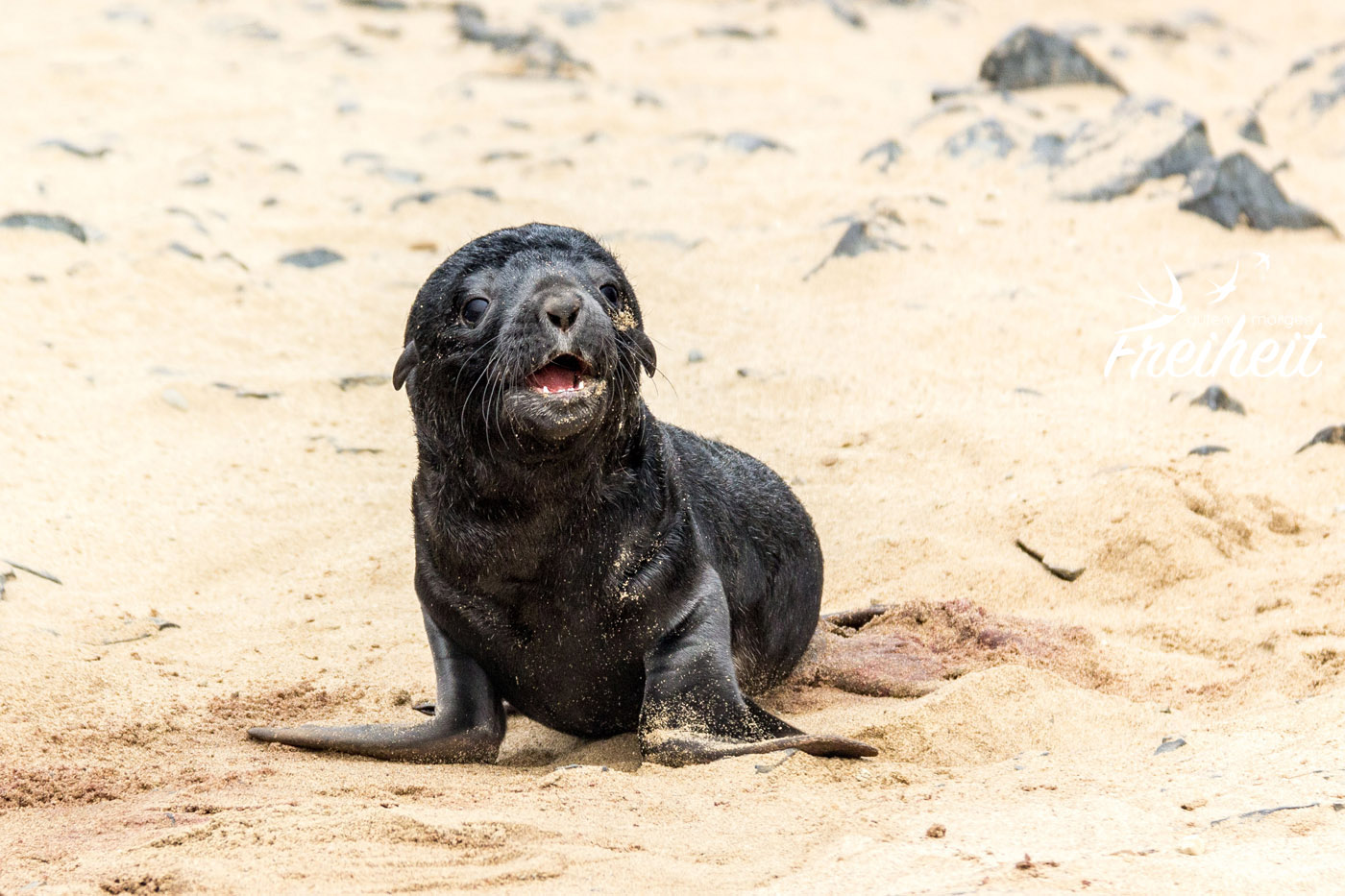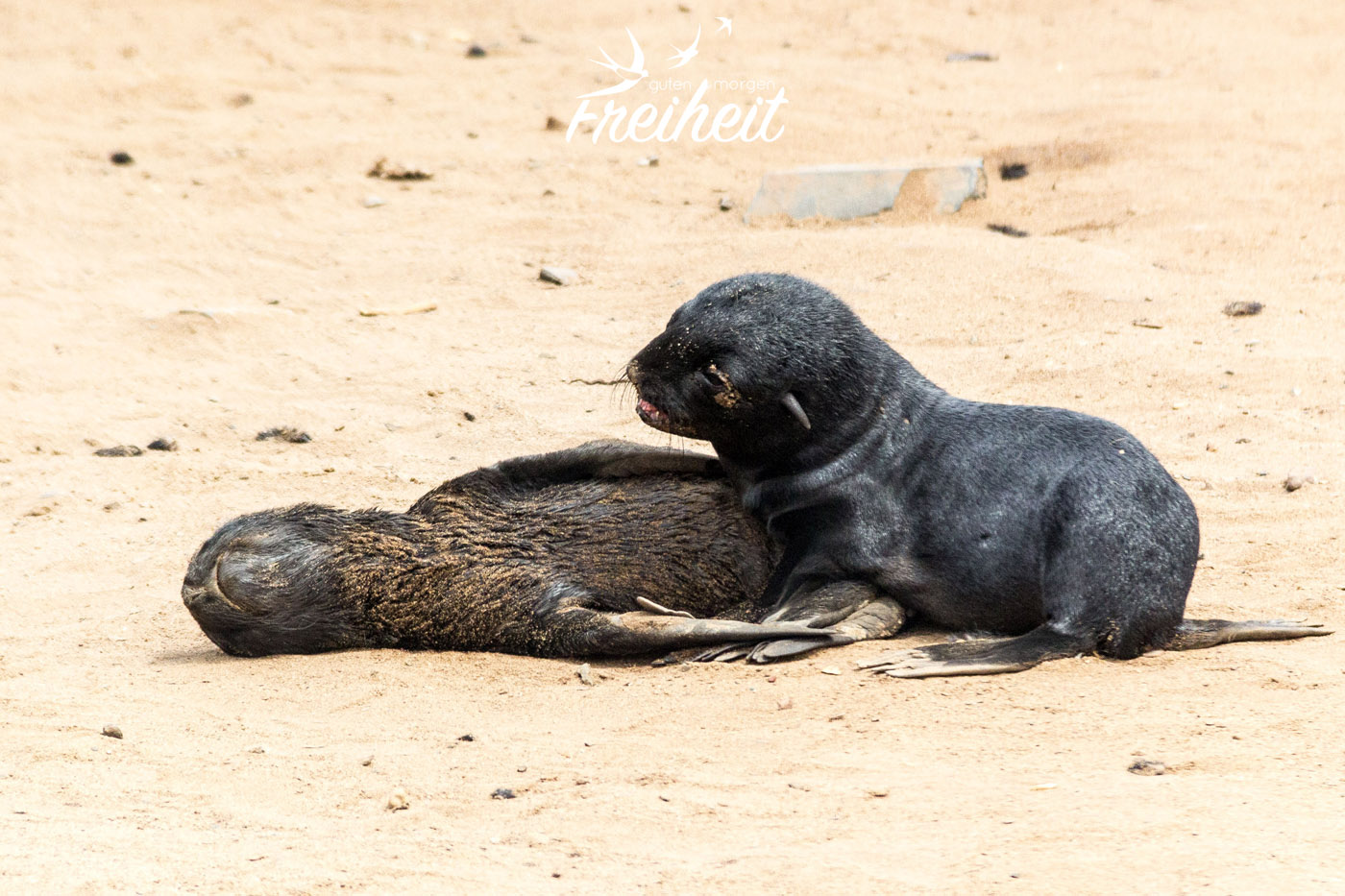 Als eins der Babys auf mich zurobbt, stehen bleibt und mich mit traurigen Augen anschaut, wünsche ich mir nichts mehr als das ich ihm helfen könnte. Eben lag es noch in einer bizzarren Position im Sand, so dass ich dachte, es wäre schon tot. Und nun blickt es mich mit sandverkrusteten Augen an und wartet. Hätte ich den Zettel schon vorher komplett durchgelesen, hätte ich lesen können, dass Mütter ihre Jungen manchmal tagelang allein lassen um auf Nahrungssuche zu gehen. Sie finden ihr Junges mittels ihrer Rufe wieder. Jede Robbe hat ihren eigen Ruf. Zu wissen, dass von diesem Robbenbaby vor mir die Mutter vielleicht gerade etwas zu Futtern auftreibt, hätte mich ein bisschen trösten können. Aber wer weiß es schon? Hier liegen so viele Jungtiere rum. Bei keinem ist die Mutter da. Die liegen fast alle nahe am Wasser. Unterstützendes säugen gibt es bei Robben nicht. Jede Mutter stillt nur ihr eigenes Baby. Fast ein ganzes Jahr lang. Bereist ab dem 4. Monat können sie aber auch schon feste Nahrung zu sich nehmen.