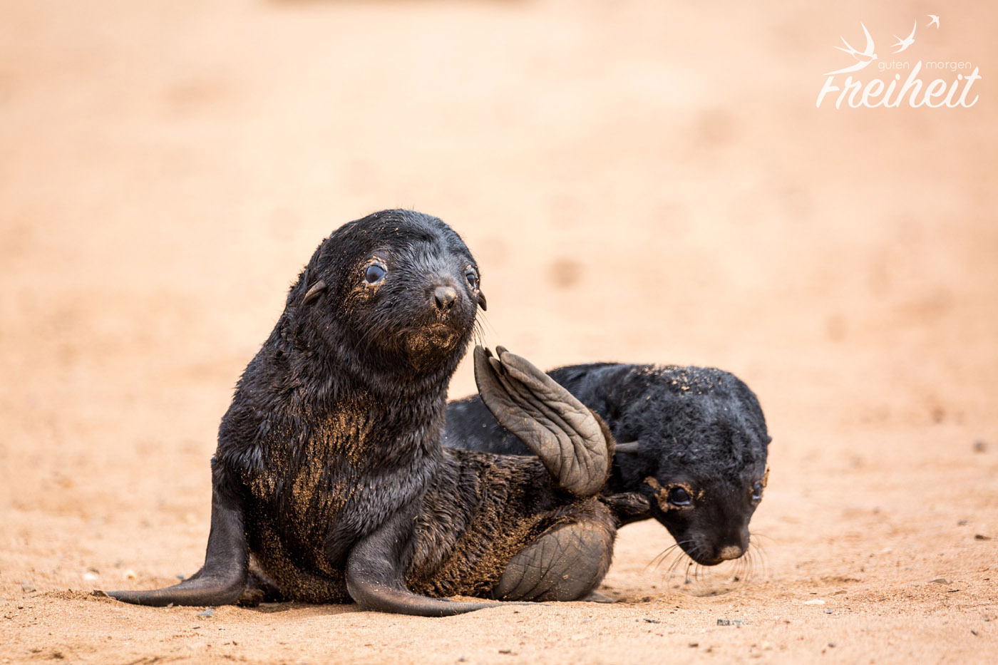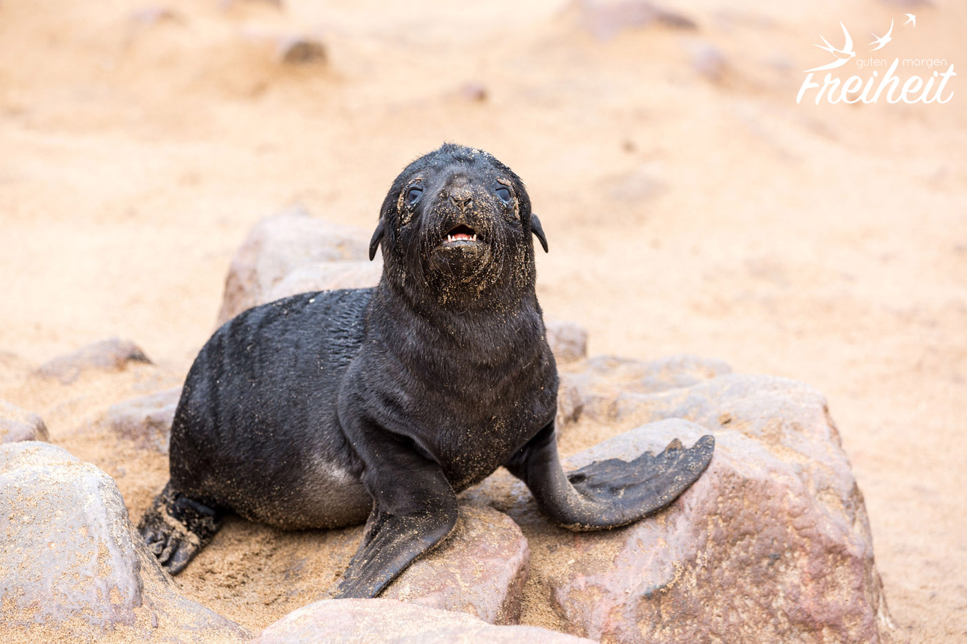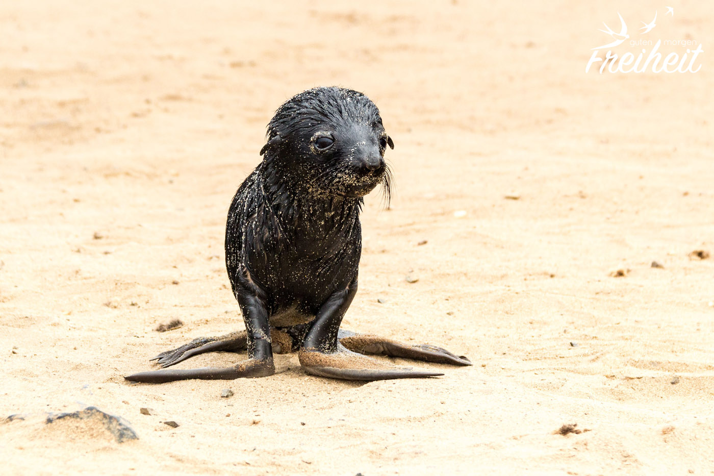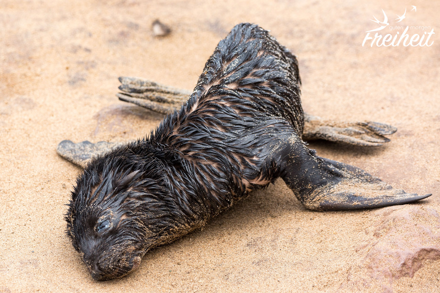 Als eins der Babys auf mich zurobbt, stehen bleibt und mich mit traurigen Augen anschaut, wünsche ich mir nichts mehr als das ich ihm helfen könnte. Eben lag es noch in einer bizzarren Position im Sand, so dass ich dachte, es wäre schon tot. Und nun blickt es mich mit sandverkrusteten Augen an und wartet. Hätte ich den Zettel schon vorher komplett durchgelesen, hätte ich lesen können, dass Mütter ihre Jungen manchmal tagelang allein lassen um auf Nahrungssuche zu gehen. Sie finden ihr Junges mittels ihrer Rufe wieder. Jede Robbe hat ihren eigen Ruf. Zu wissen, dass von diesem Robbenbaby vor mir die Mutter vielleicht gerade etwas zu Futtern auftreibt, hätte mich ein bisschen trösten können. Aber wer weiß es schon? Hier liegen so viele Jungtiere rum. Bei keinem ist die Mutter da. Die liegen fast alle nahe am Wasser. Unterstützendes säugen gibt es bei Robben nicht. Jede Mutter stillt nur ihr eigenes Baby. Fast ein ganzes Jahr lang. Bereist ab dem 4. Monat können sie aber auch schon feste Nahrung zu sich nehmen.