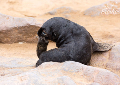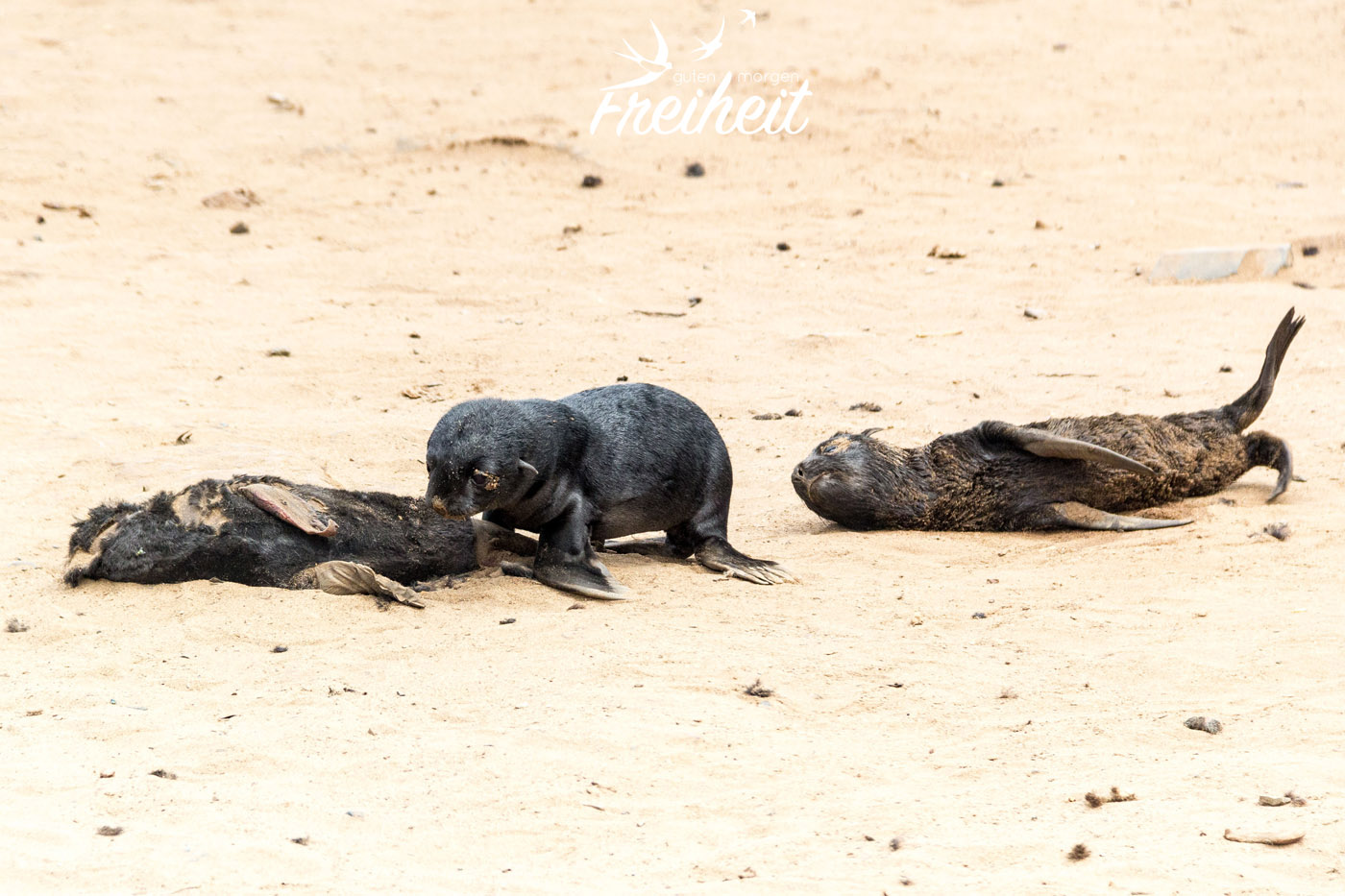 Wir haben Glück – es gibt gerade Nachwuchs unter den Robben! Ende November bis Anfang Dezember bringen die trächtigen Weibchen jeweils ein ca. fünf Kilogramm schweres Junges auf die Welt. Schon auf dem Weg zu den großen Robbengruppen, treffen wir auf die ersten Jungen. Allesamt tot. Oftmals schon runtergeknabbert bis auf die Knochen. Die Schakale waren also schon da. Wir nähern uns langsam und bedacht den schreienden Robbenbabys – nicht ohne ständig auf irgendwelche Knochen zu treten. Naja, nicht irgendwelche. Robbenbabyknochen natürlich. Gruselig. Aber damit können wir noch umgehen. Tot ist tot. Aber was danach passiert, bricht uns das Herz. So viele Babys, die allein und verlassen halb tot im Sand rumliegen, die leidend und wehklagend nach ihren Müttern rufen. Diese Schreie gehen durch Mark und Bein. Das kann niemanden mit auch nur ein bisschen Herz kalt lassen. Natürliche Selektion hin oder her.