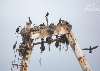 Während wir so gemütlich dahinrollen, checke ich unsere Route auf MapsMe, zoome immer wieder nahe in die Karte herein und bemerke einen Punkt auf dem „Zeila Wrack“ steht. Da kommen wir quasi fast dran vorbei! Klar, dass wir da mal abbiegen und zum Strand fahren. Schon von weitem sehen wir die „Zeila“. Düster liegt sie in der Meeresbrandung, wird immer wieder von den hohen Wellen umspült. Meeresvögel fliegen zu den Masten, wo sie sich große Nester gebaut haben. Mit frischen Zweigen im Schnabel erweitern sie ihre Brutstätten. Perfektes Wetter für so ein Wrack 🙂
