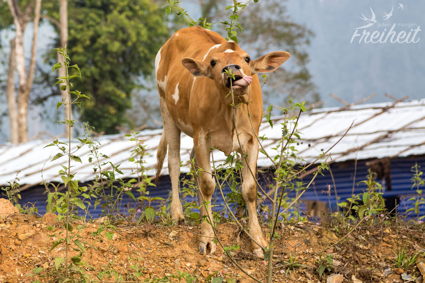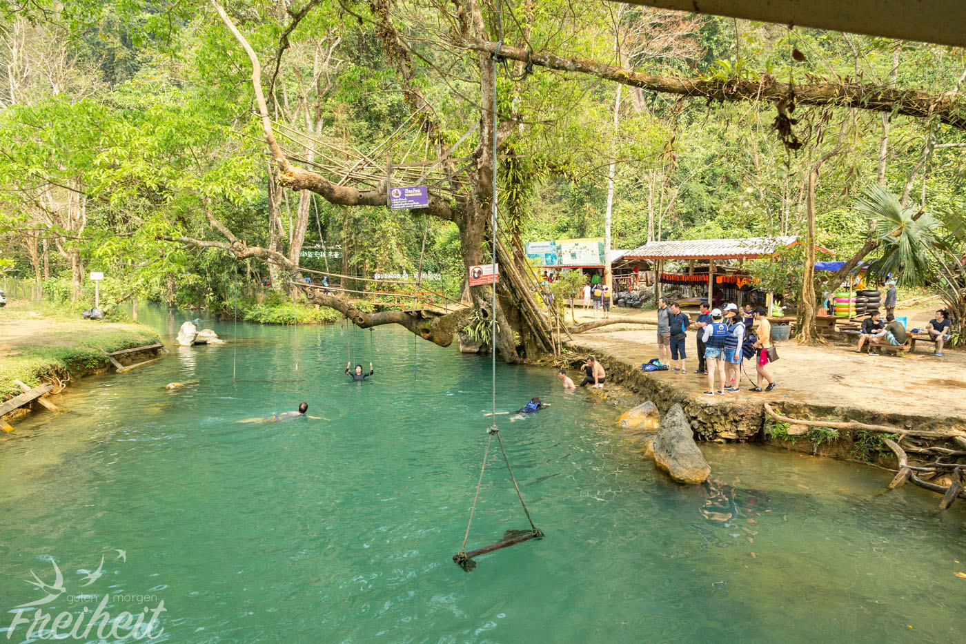 Zurück am Scooter, kommt uns ein Laote entgegen, der uns zulächelt. Er zeigt in einen Weg rein und sagt etwas auf laotisch. Oder sollte es Englisch sein? Wir verstehen kein Wort, aber natürlich sind wir neugierig und fahren in die gezeigte Richtung. Keine 5 Minuten später stehen wir vor dem Eingang zu einer blauen Lagune. Badesachen haben wir nicht mit, aber von weitem sieht es toll aus und so zahlen wir einen kleinen Obulus. Wirklich sprachlos sind wir als wir an der Lagune ankommen. Keine Menschenseele zu sehen und das bei der genialen Lage? Und die Farbe erst! Ein Traum für alle Türkisliebhaber wie uns 🙂