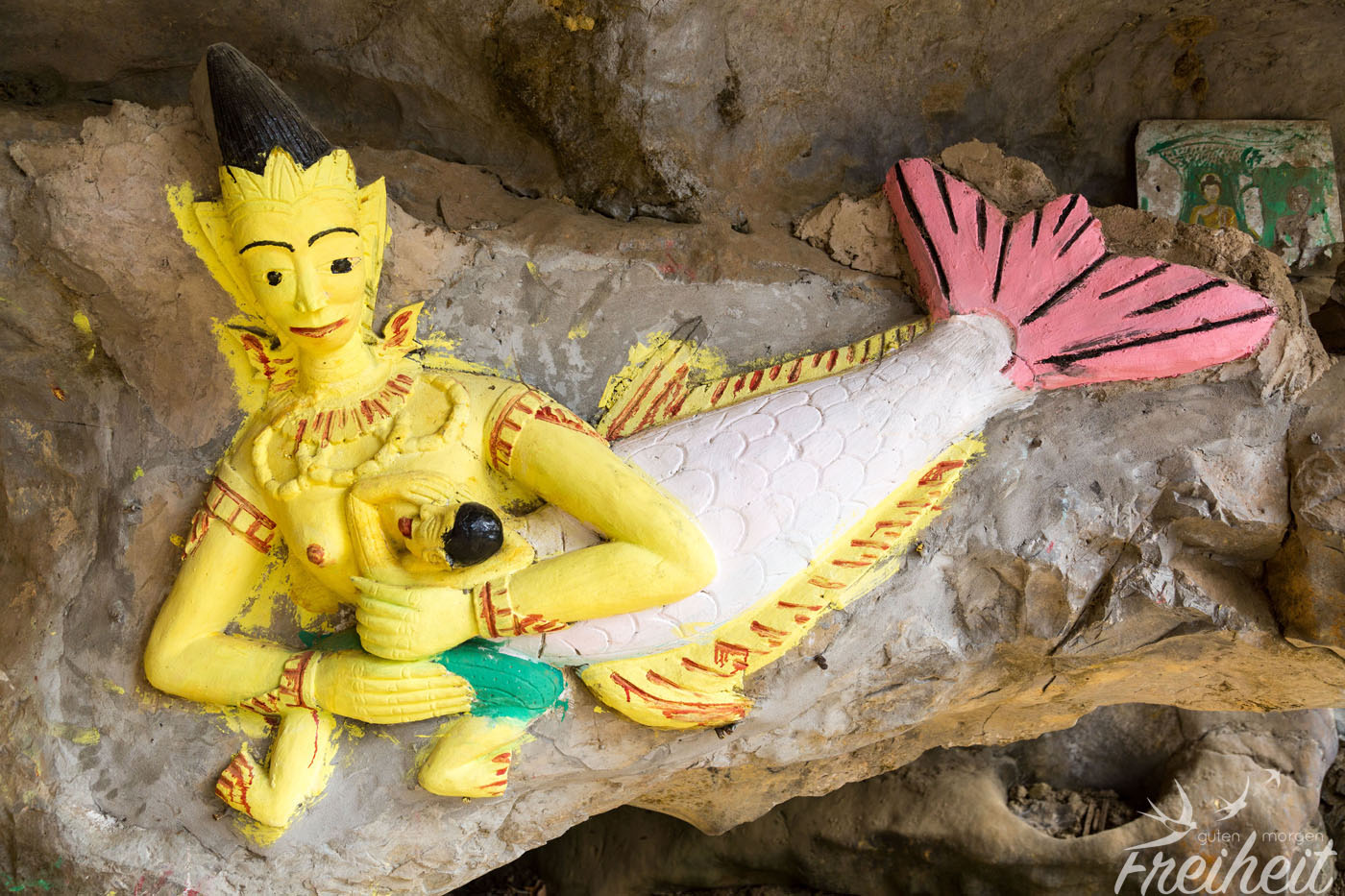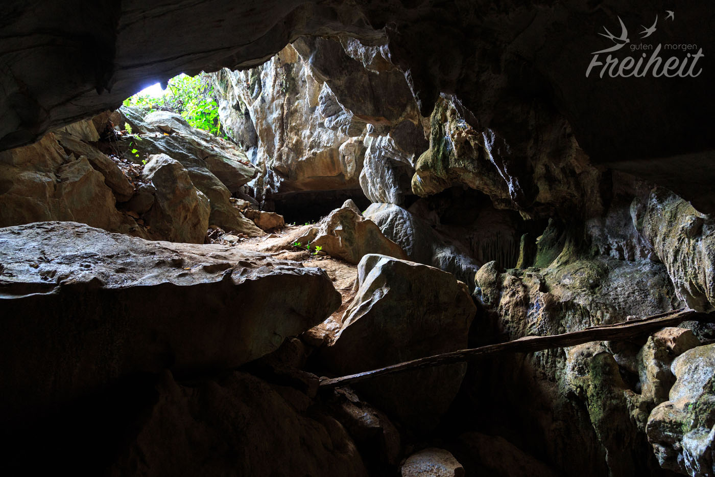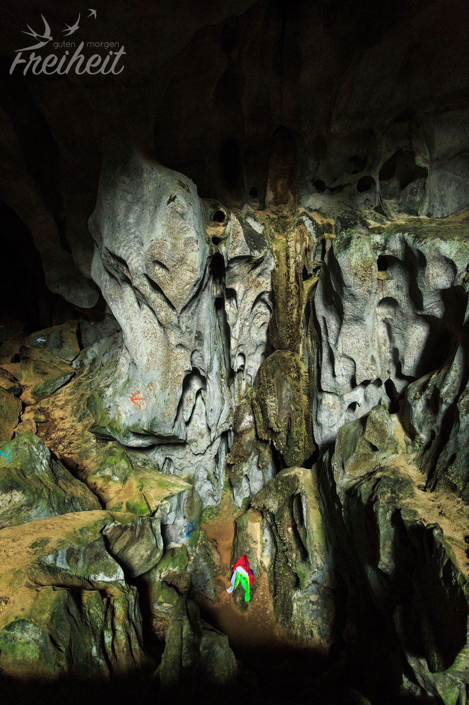 Nach den steilen Treppen geht man nur ein paar Meter durch den Höhleneingang und steht direkt vor einem liegenden Buddha, der durch einfallendes Licht wunderschön in Szene gesetzt wird. Davor glimmen etliche Räucherstäbchen und die Gaben der Gläubigen. Unter anderem eine Orange, die so grün verschimmelt und „duftend“ ist, dass wir uns wundern, warum sie noch keine Beine ausgebildet hat. Schnell weiter. Rund um den Buddha liegen riesige Felsblöcke und man kann sich einen Weg in eine zwei Meter tiefer liegende Ebene bahnen. Hier gibt es auch noch genügend Licht von draußen. Immer wieder leuchte ich mit der Stirnlampe unter dunkle Felsblöcke und sehe, dass es zum Teil sehr tief abwärts geht.