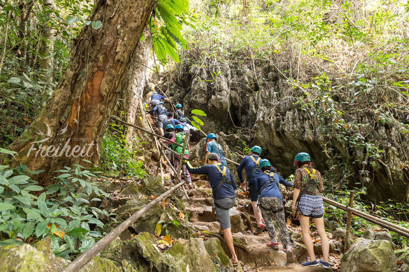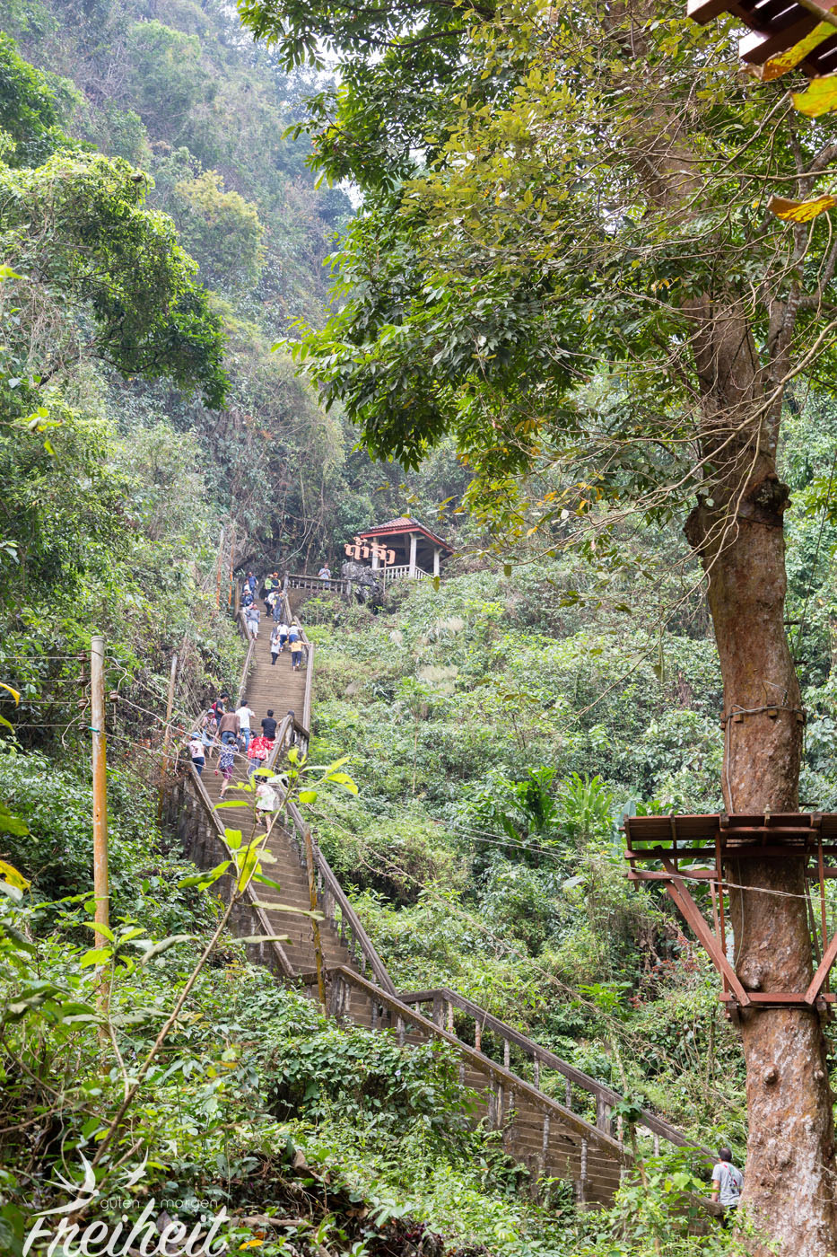 Unsere erste Höhle fängt aber harmlos an. Die sogenannte Krabbenhöhle (Tham Pou Kham) wird gern in Scharen von chinesischen Gruppen angefahren. Aber nicht wegen der Höhle sondern wegen dem ganzen Drumherum. Es gibt eine blaue Lagune mit Schwingen, Seilen und Plattformen zum Hineinspringen, es gibt Ziplines durch die Wipfel des Regenwaldes, jede Menge Souvenirs und Restaurants und auch für Kinder ist vorgesorgt. Die dürfen in diesen ulkigen durchsichtigen Bälle übers Wasser kullern. Für die Höhle interessieren sich dann komischerweise hauptsächlich westliche Touristen 😛 Ob es am sehr steilen Aufstieg liegt? Soll uns nur recht sein. Chinesen in Gruppen sind echt laut und aufdringlich. Leider können wir dieses Klischee nur bestätigen.