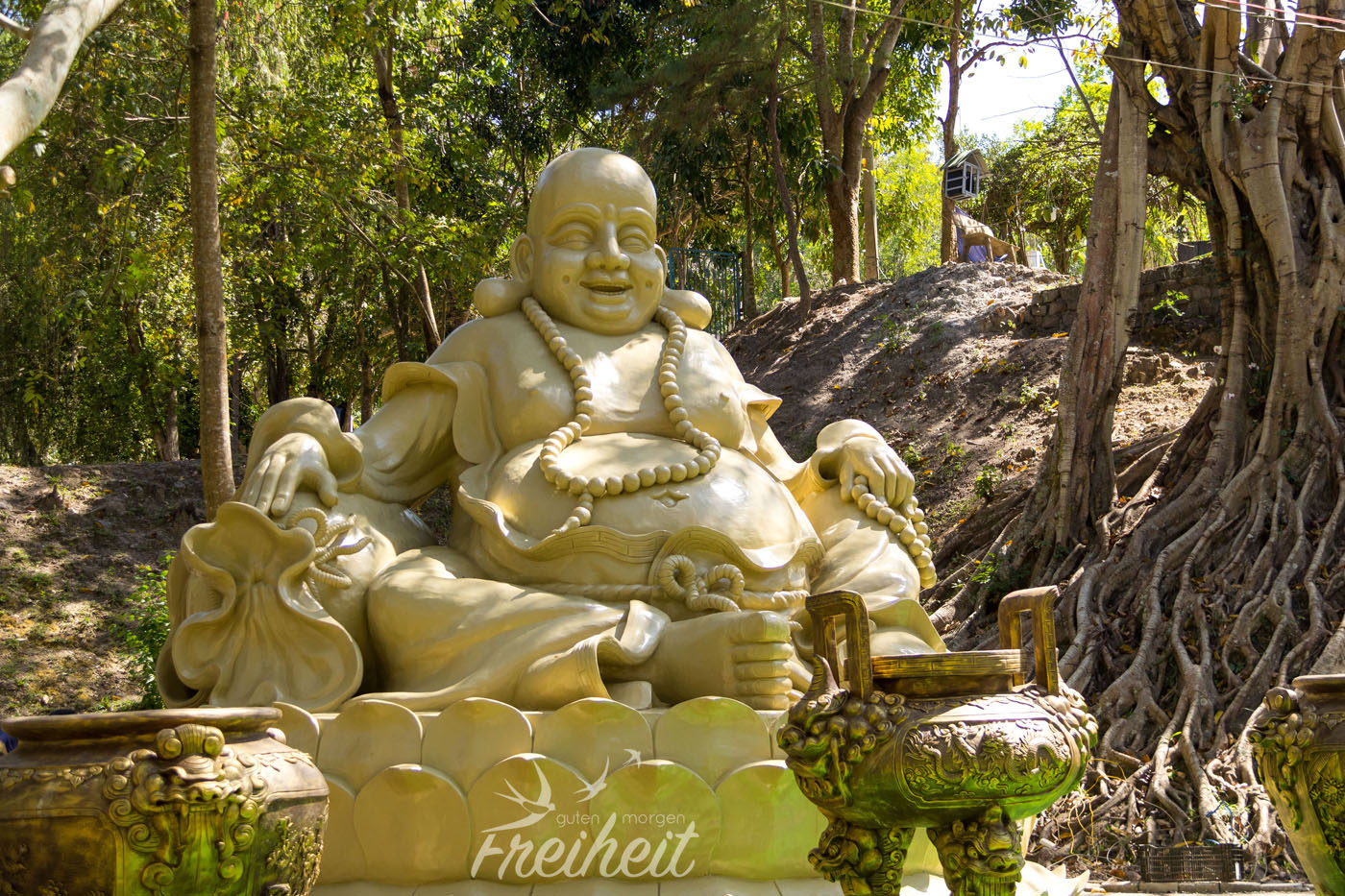 Nicht toll für Carstens Rücken, aber auch ich als Beifahrerin stelle die Anstrengung fest durch Schlaglöcher gespickte Straßen zu fahren und nicht nach hinten abzurutschen oder nach vorne geschnellt zu werden. Man mag es kaum glauben, aber das in Kombination mit dem Verkehr kann einen ganz schön fertig machen! Und das nach einem Erholungstag, den sich Carsten ganz unspektakulär gestern zu seinem Geburtstag gewünscht hat! Ja, wir haben nichts „Besonderes“ gemacht an seinem Geburtstag, außer am Stadtsee Baguette mit Erdnussbutter und Banane zu frühstücken und abends lecker Essen zu gehen. Einfach mal nichts planen und organisieren müssen tut gut. Okay, nicht ganz. Da war dann „nur“ noch das Kaufen der Bustickets für einen Nachtbus nach Da Nang. Da wollen wir zwar nicht hin, ist aber die einzige Lösung um von da aus nach Hoi An zu kommen, wohin wir eigentlich reisen wollen. Reisen kann anstrengend sein. Das können alle bestätigen, die länger unterwegs sind und keine Pauschalreise gebucht haben 😉