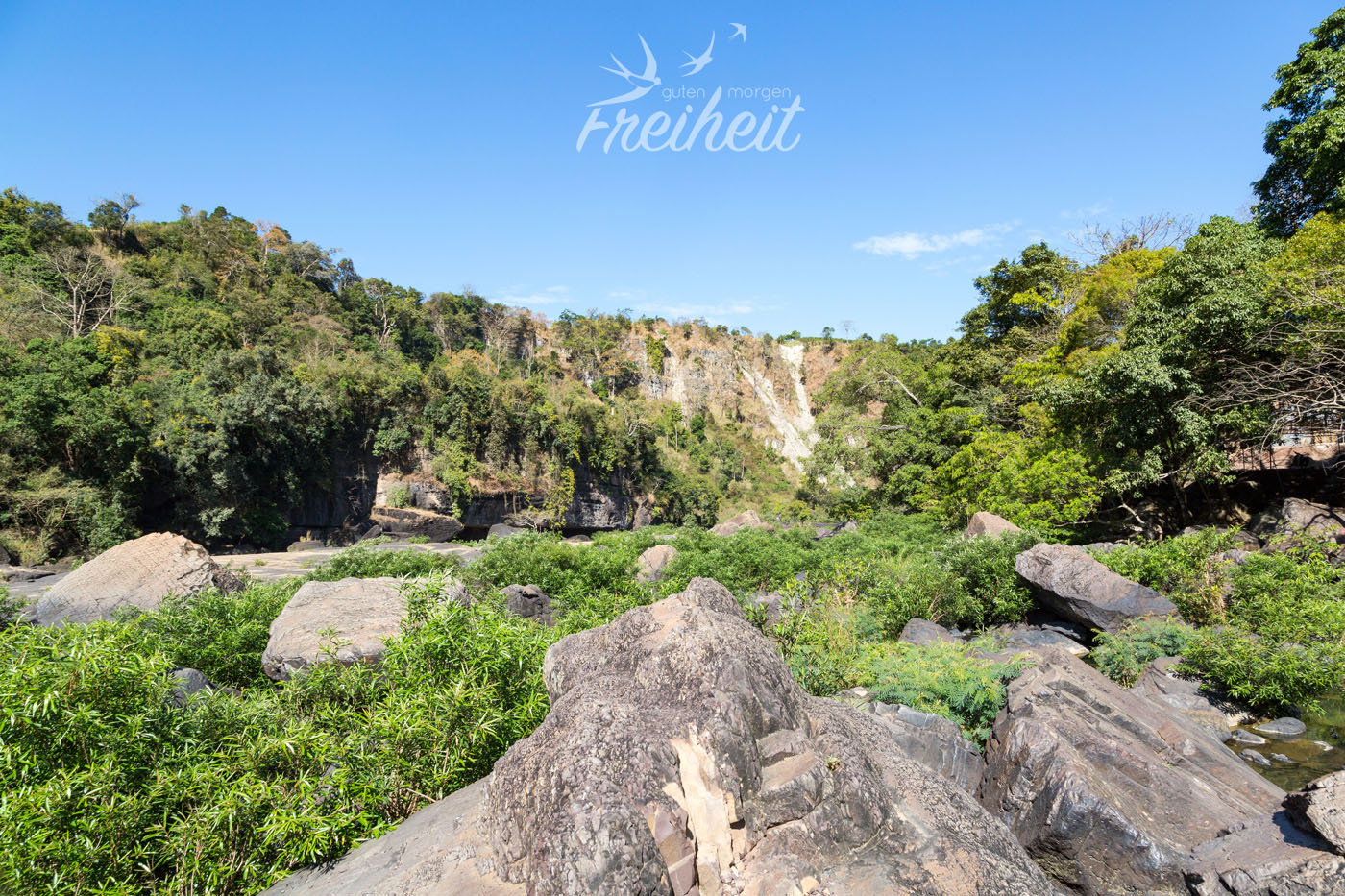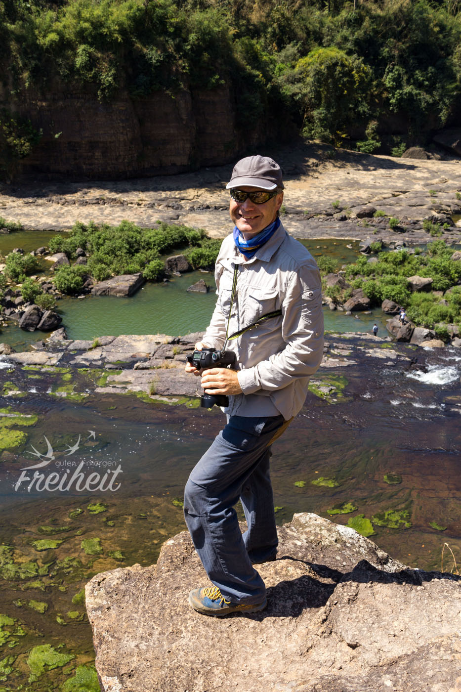 Neben dieser Wasserfallstufe, kann man noch eine zweite besichtigen. Dafür müssen wir nur wieder die steile Treppe nach oben und einem anderen Weg folgen, der uns direkt an eine 20m tiefe Abbruchkante bringt, wo aktuell noch gebaut wird und demnächst vermutlich auch ein Geländer stehen wird. Auch dieser Blick ist beeindruckend und wir stellen uns vor wieviel Wasser hier wohl zur Regenzeit durchrauschen muss. Immerhin ist der Fluss dann an die 100m breit.