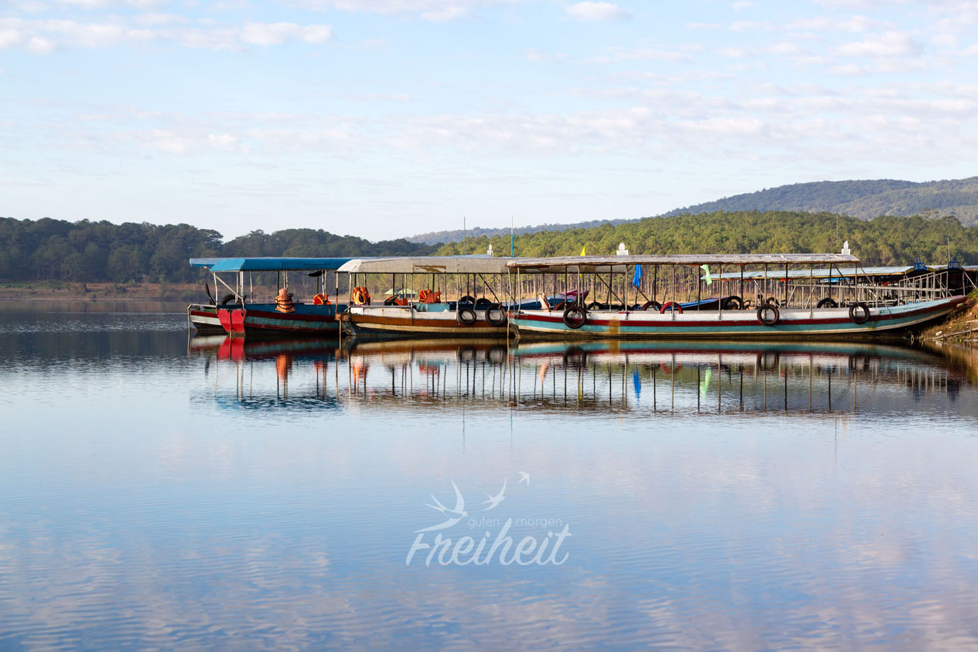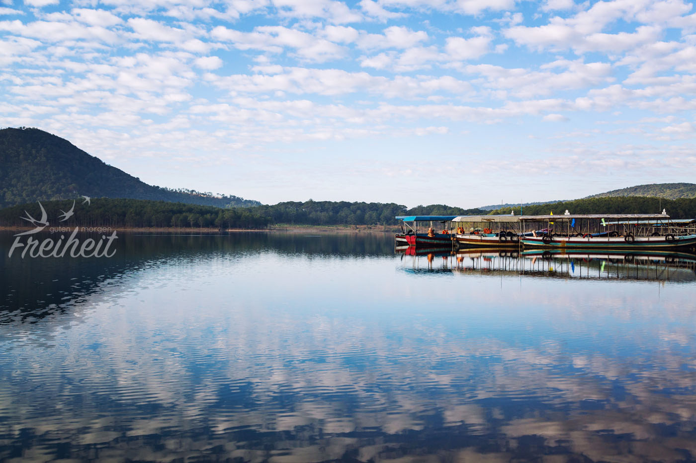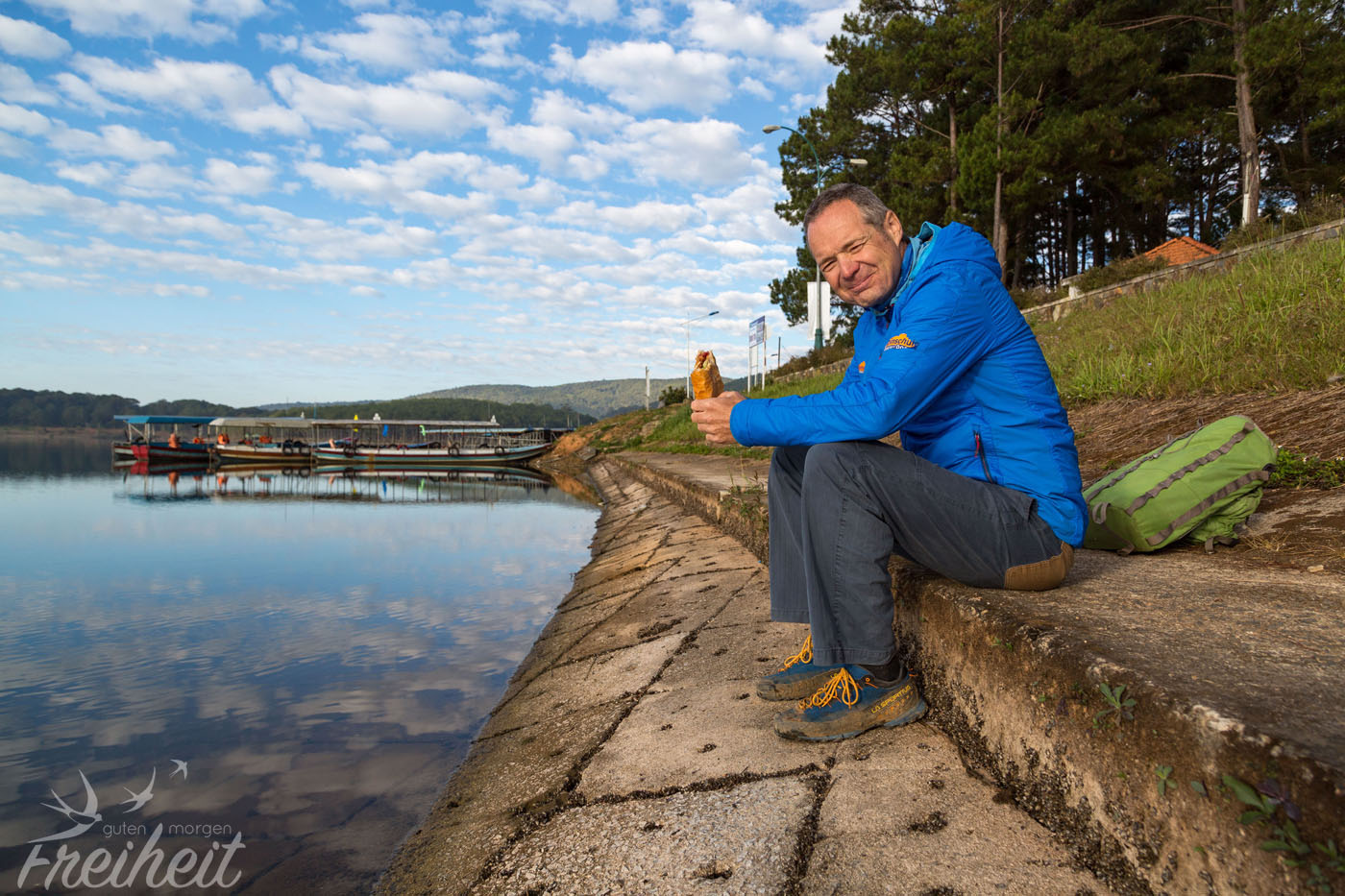 Die ersten Sonnenstrahlen tauchen hinter den Bergen auf und wir halten an um uns in der Sonne etwas aufzuwärmen. Wir umrunden fast den halben See auf der Suche nach einer schönen Stelle für ein Fotomotiv, aber leider ist der Blick meist verbaut. So drehen wir nach einer Weile wieder um und fahren direkt ans Ufer neben einen Bootsanleger, von dem schon bald die ersten Gruppen über den See gondeln werden. Denn auch der Tuyen Lam See wird von Touristengruppen geflutet. Nur in den Morgenstunden findet man hier noch Ruhe. Wir packen unser Frühstück aus und beobachten die Schäfchenwolken am Himmel ziehen.