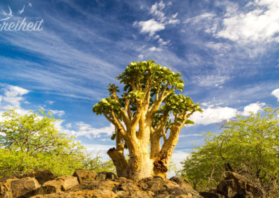 Weiter geht es auf einem schmalen Pfad, vorbei an dornenbewachsenen Sträuchern und Bäumen, dessen Rinde sich abpellt, wie die Haut nach einem schlimmen Sonnenbrand. Von Zebras, Antilopen oder anderen Bewohnern des Erongo Gebirges gibt es leider keine Spur. Nur das Rascheln und Schnaufen von einem davonspringenden Tier können wir hören. Die Aussicht am Anfang war zwar sehr schön, aber den Rest vom Weg hätten wir uns eigentlich auch sparen können. Landschaftlich passiert da nichts Aufregendes mehr und es bleibt dabei, dass wir keine Tiere zu Gesicht bekommen. Schade, dabei sind wir extra früh losgegangen, mit dem Wissen, dass die Tiere besonders in den Morgenstunden noch aktiv sind. Aber das Gebiet ist riesig und ein bisschen Glück braucht man eben schon 😉
