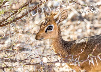 Das wir ein Dik-Dik so nah sehen können, ist ein echter Glücksfall. Die Zwergantilope (nur 40cm groß und zwischen 3-7kg leicht) hat leider viele Feinde, neben den üblichen Verdächtigen wie den Wildkatzen sogar Schakale, Adler und Riesenschlangen. Deshalb flieht es bei jeder noch so kleinen Bedrohung. Bei der Flucht geben sie alarmierende Rufe wieder, die durch ihre Nase wie ein Pfeifen erklingen und dem Tier seinen Namen Dik-Dik gab. Durch ihre geringe Größe und die passende Fellfärbung fallen sie im Gebüsch kaum auf. Sie sind hauptsächlich nacht- und dämmerungsaktiv und fressen Laub, Gräser, Blüten und Früchte. Trinkwasser brauchen sie normalerweise nicht, da sie Wasser aus der Nahrung zu sich nehmen. Und noch eine Besonderheit: Dik-Diks leben nicht wie andere Antilopenarten in Herden, sondern mit ihrem lebenslangen Partner zusammen. Romantisch, oder? 🙂