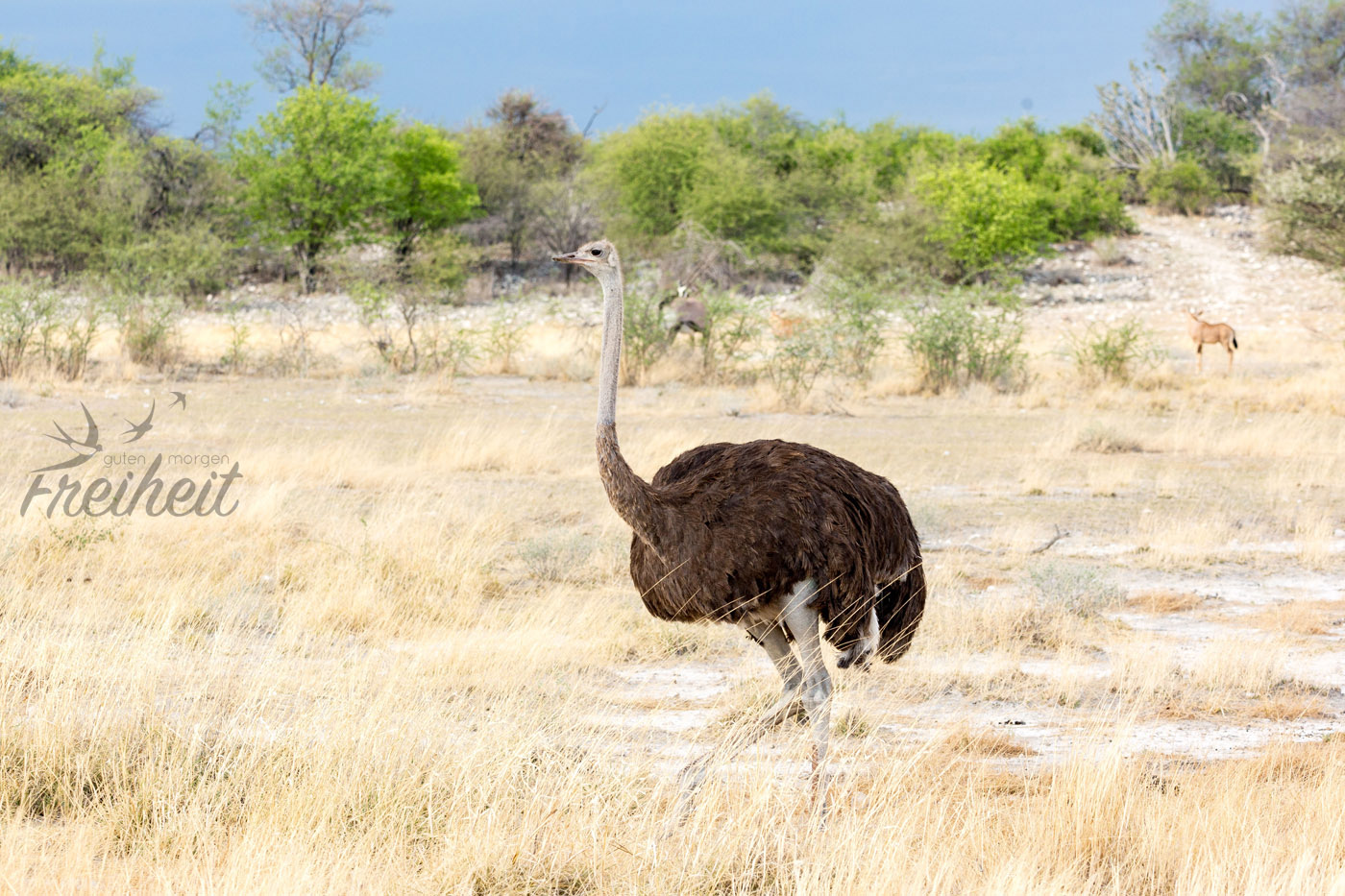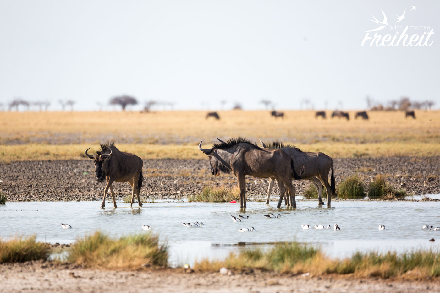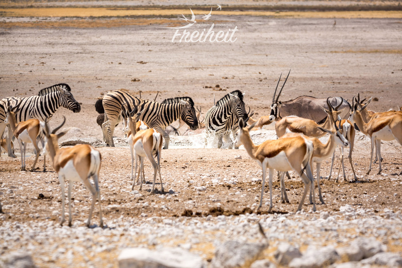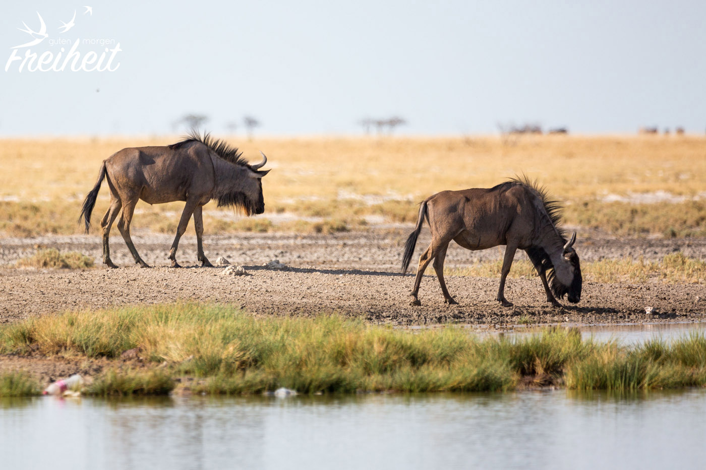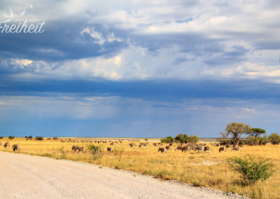Heute am frühen Morgen starten wir aufgeregt zum Nordeingang des Etosha. Noch vor dem Nationalpark ist ein großes Wasserloch, wo uns jede Menge Tiere begrüßen. Wir sind schon jetzt aus dem Häuschen und machen reichlich Fotos 🙂 Leider zeugt jede Menge Picknick-Müll von der Beliebtheit dieser schönen ungeschützten Aussicht. Wir fahren weiter an großen Gnu-Herden vorbei und kommen zum Eingang. Nun heisst es Formulare ausfüllen, unsere Ladung unter anderem auf Waffen kontrollieren lassen und dann können wir alleine über jede Menge Staub- und Sandpisten rollen und uns auf die Suche machen.