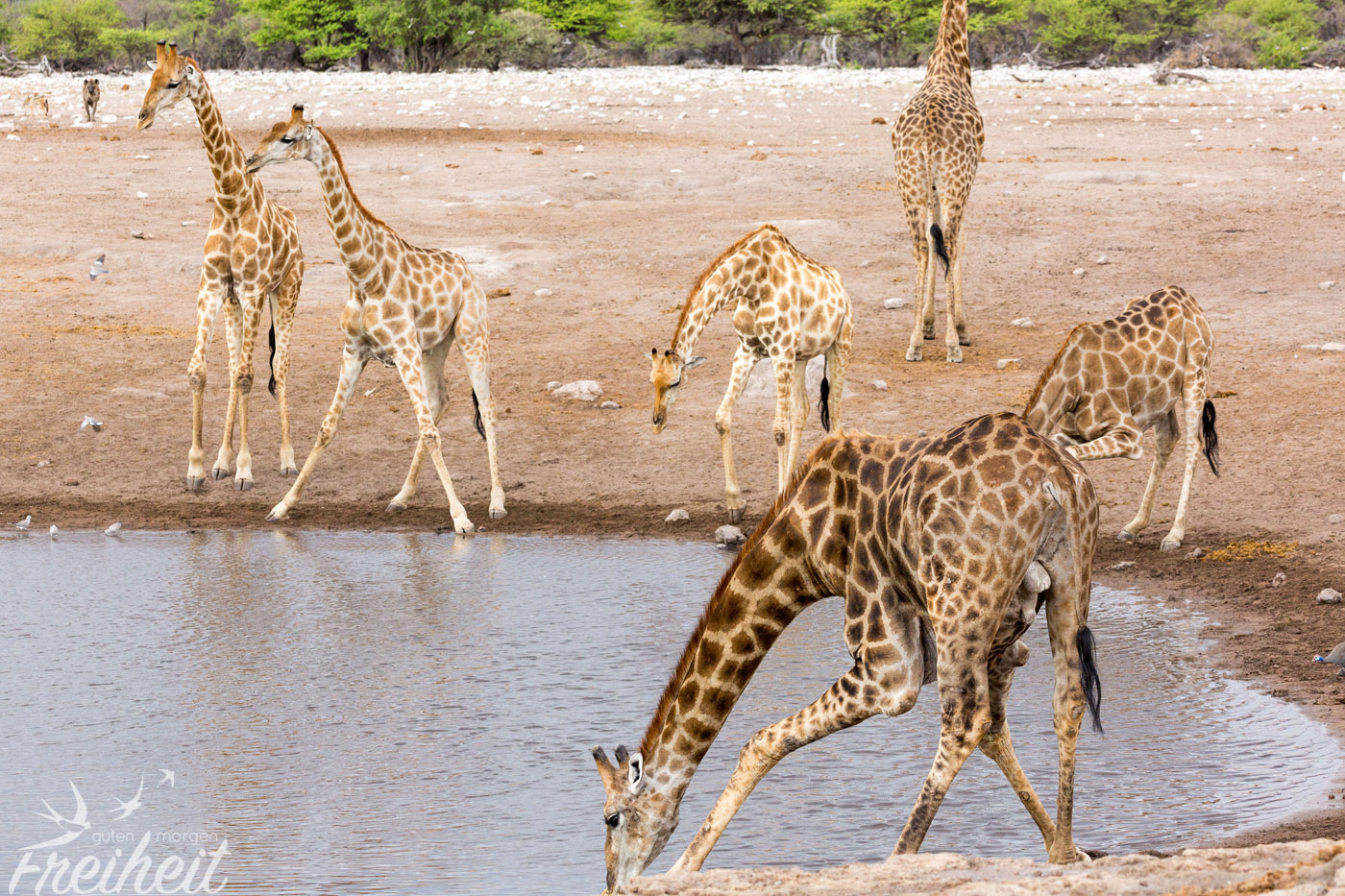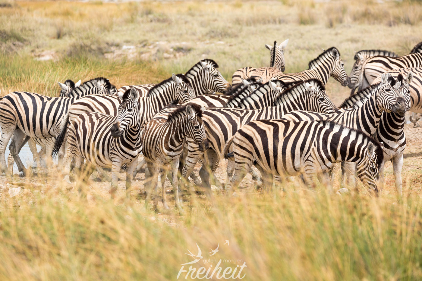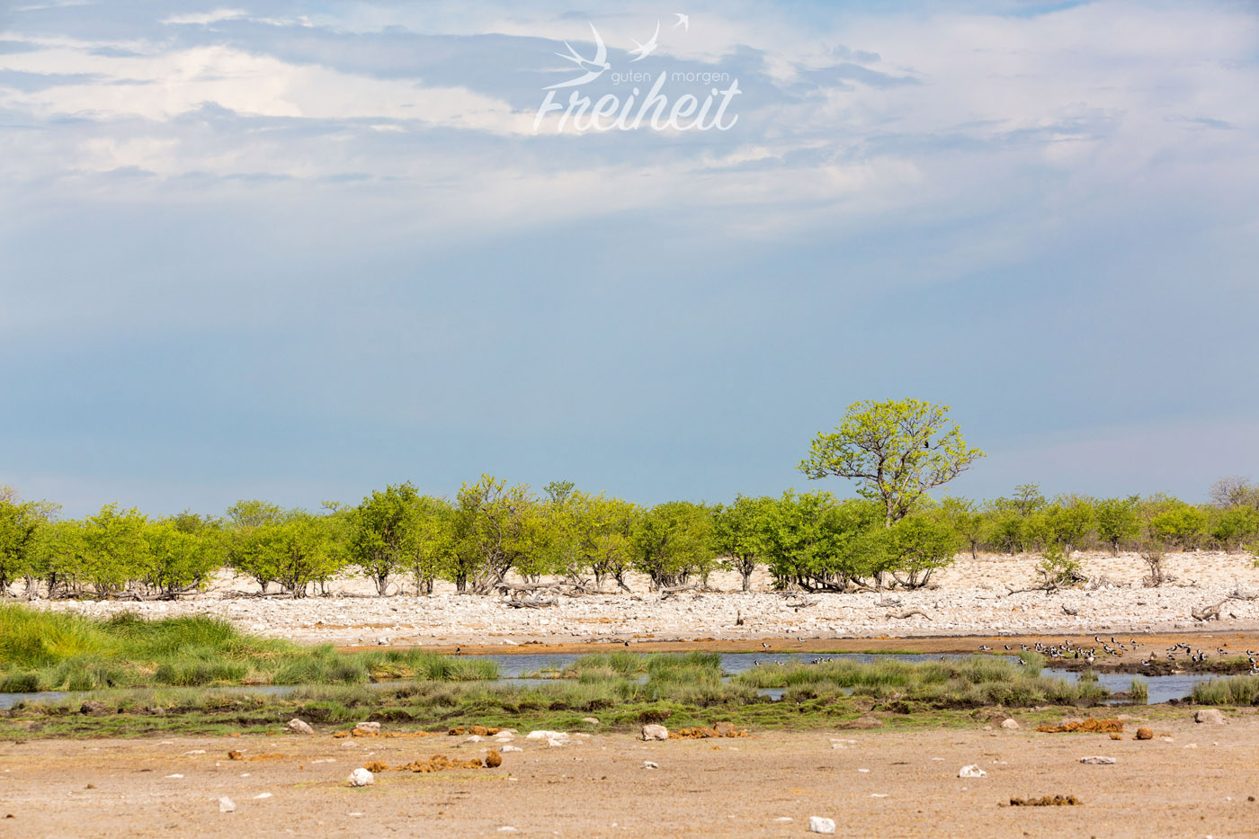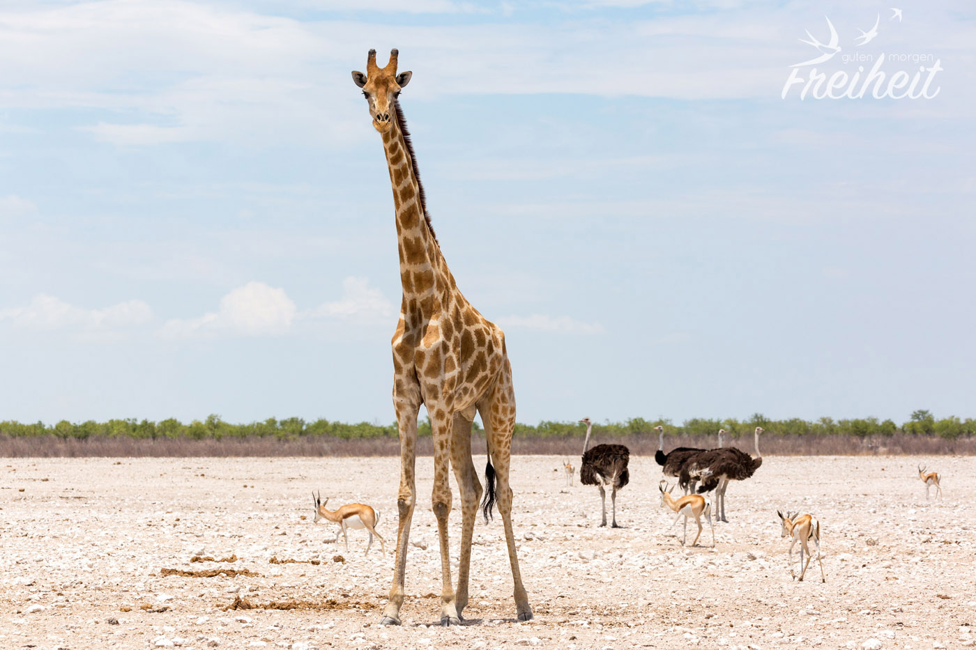 Heute am frühen Morgen starten wir aufgeregt zum Nordeingang des Etosha. Noch vor dem Nationalpark ist ein großes Wasserloch, wo uns jede Menge Tiere begrüßen. Wir sind schon jetzt aus dem Häuschen und machen reichlich Fotos 🙂 Leider zeugt jede Menge Picknick-Müll von der Beliebtheit dieser schönen ungeschützten Aussicht. Wir fahren weiter an großen Gnu-Herden vorbei und kommen zum Eingang. Nun heisst es Formulare ausfüllen, unsere Ladung unter anderem auf Waffen kontrollieren lassen und dann können wir alleine über jede Menge Staub- und Sandpisten rollen und uns auf die Suche machen.