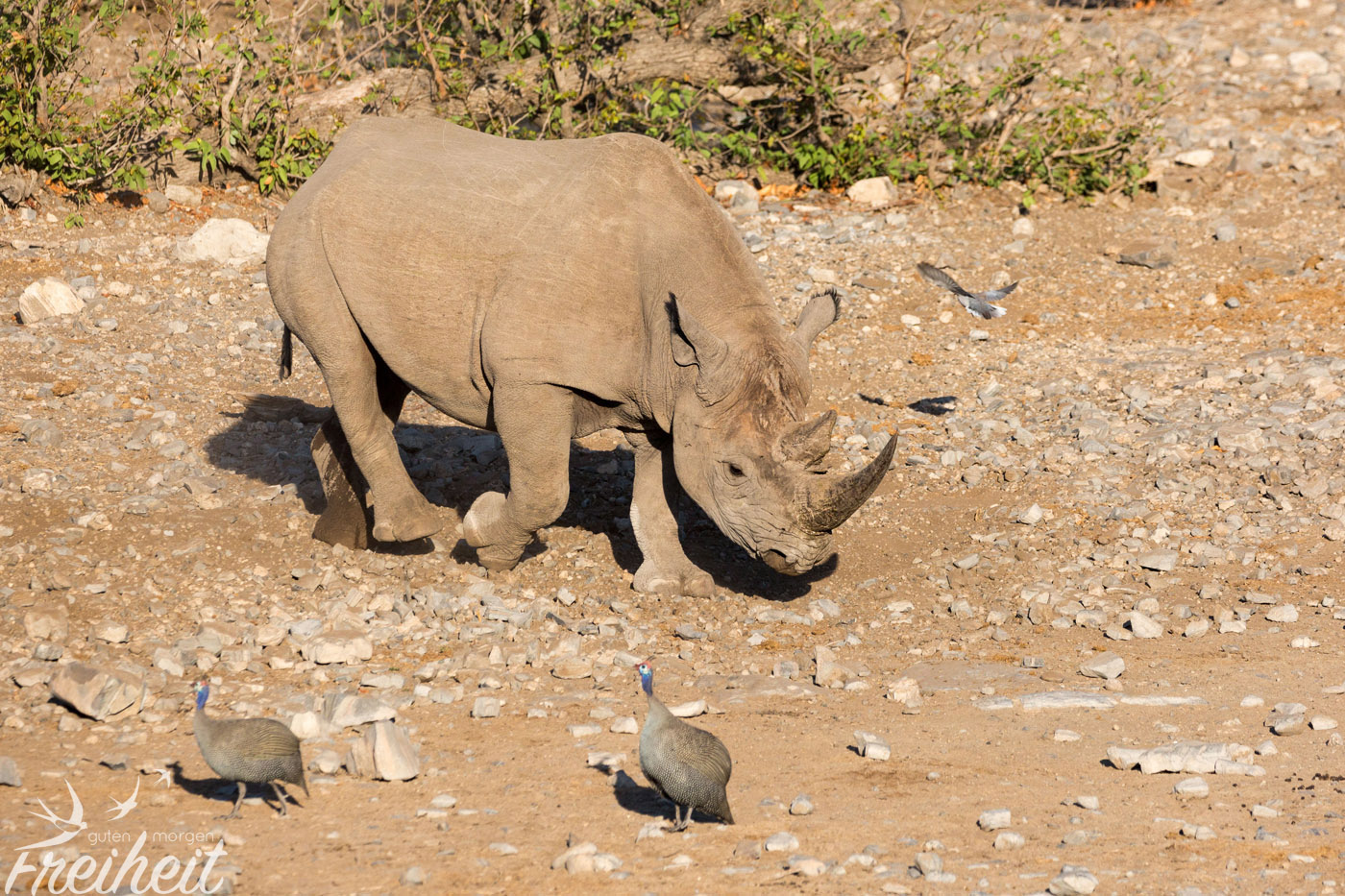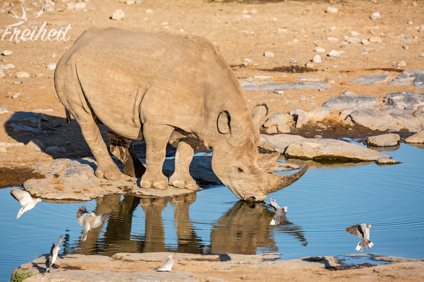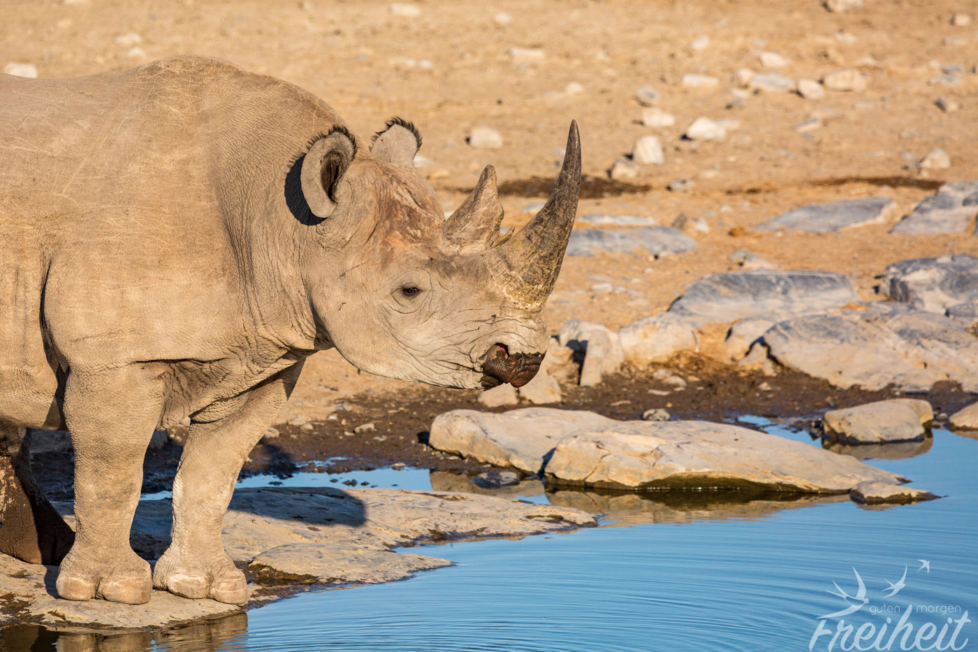 Die Dickhäuter waren eigentlich mal ausgestorben im Etosha Gebiet. Ab 1995 hat man versucht sie wieder einzuführen. Mit Erfolg! Mittlerweile kann man sie wieder antreffen und ihre Population hat sich erholt. Trotzdem sind Nashörner, die ein Gewicht zwischen 500 – 3000kg erreichen können, weltweit vorm Aussterben bedroht. Und das alles für ihr Horn, das besonders in China und Vietnam oft wertvoller als Gold gehandelt wird. Man sagt dem pulverisierten Horn wunderheilende (und auch potenzfördernde) Kräfte nach. Das alles ist nichts weiter als purer Wahnsinn, denn das Horn besteht aus den selben Substanzen wie Nägel und Haare und kann wissenschaftlich untersucht nichts gegen Krebs oder andere Krankheiten bewirken. Aber der Glaube versetzt Berge und in dem Fall löscht es eine weitere Spezies auf der Erde aus. Mit den Untersuchungen der Wissenschaft braucht man diesen Menschen aber nicht zu kommen. Es ist eben Tradition. Und nichts ist härter und langlebiger als Tradition.