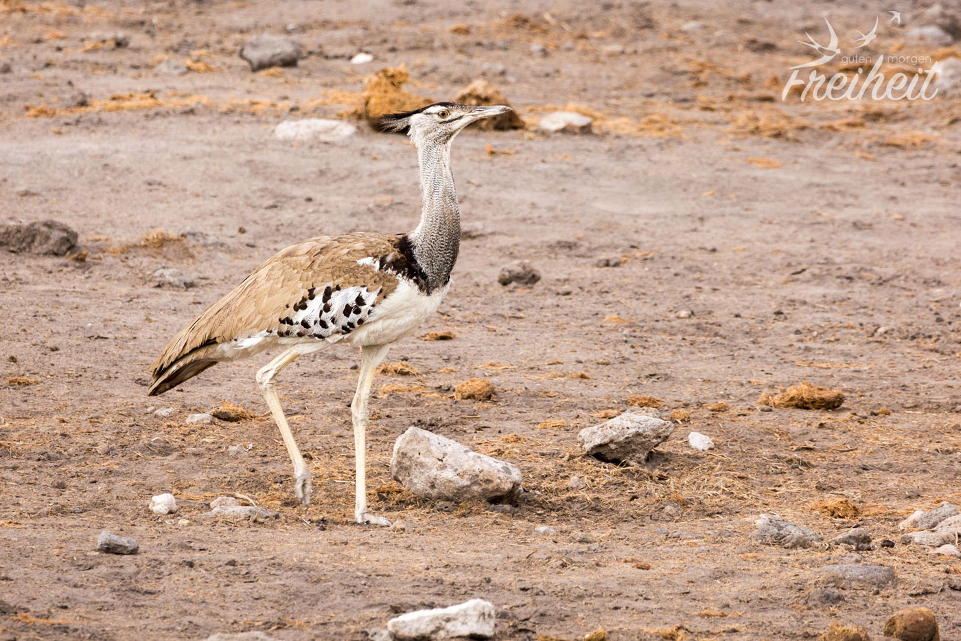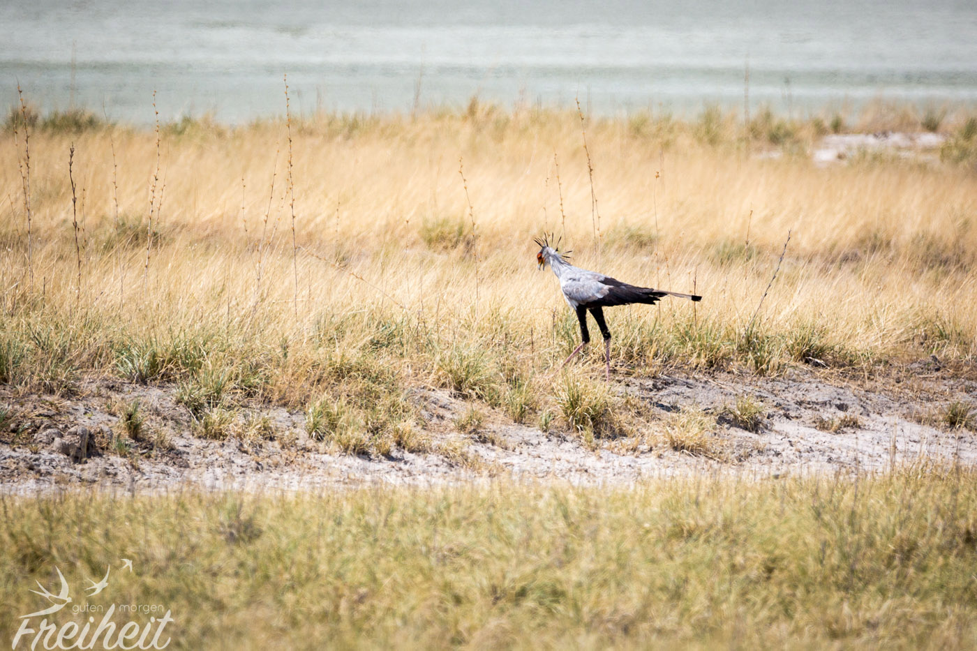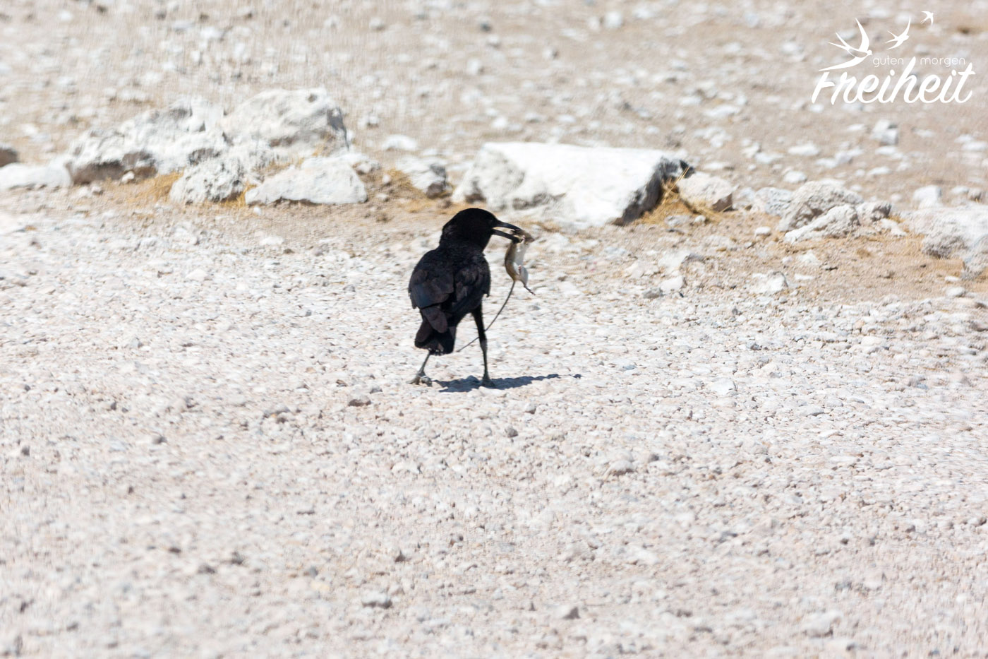 Es gibt natürlich neben den großen Säugetieren auch reichlich verschiedene Vogelarten zu beobachten. Besonders imposant sind natürlich die Raubvögel und die großen Geier, die lauernd in der Luft schweben und nur darauf warten, dass was für sie übrig bleibt. Aber auch die Riesentrappe mit ihrem stolzen Gang und der Sekretär, der eigentlich zu den Greifvögeln gehört, obwohl er mit seinen langen Beinen eher an einen Kranich erinnert, sind Vögel, die man immer wieder zu Gesicht bekommt. Aber ausgerechnet ein eher „langweiliger“ Vogel wird uns im Gedächtnis bleiben. Es war ein Rabe. Während wir eigentlich mitten beim Fotografieren von einer ganzen Schar von Tieren am Wasserloch waren, sehen wir im Augenwinkel einen Raben vor unserem Wagen. Ein Rabe, der sich gerade ein Maus schnappt. Beziehungsweise es versucht. Denn die Maus wehrt sich natürlich aus Leibeskräften und fällt immer wieder aus seinem Schnabel und versucht zu flüchten. Irgendwann fliegt er aber doch mit der Maus davon. Ob sie es noch geschafft hat? Das Beste aber ist: wir konnten ein Foto von dem Kampf machen. Zwar nicht ganz scharf, weil es durch die schräge Frontscheibe vom Auto war, aber immerhin. In der Galerie findest du das Bild 🙂