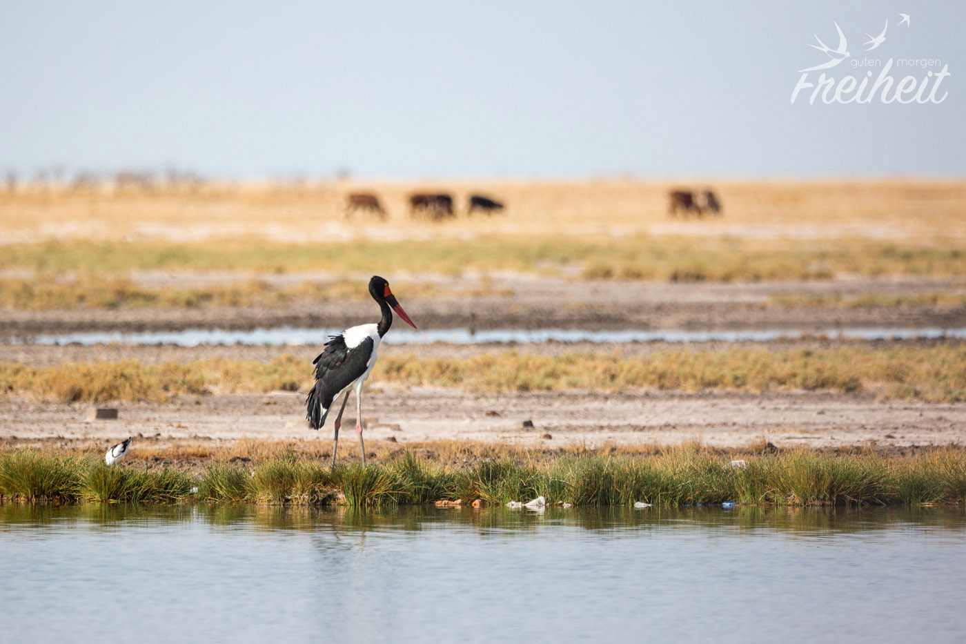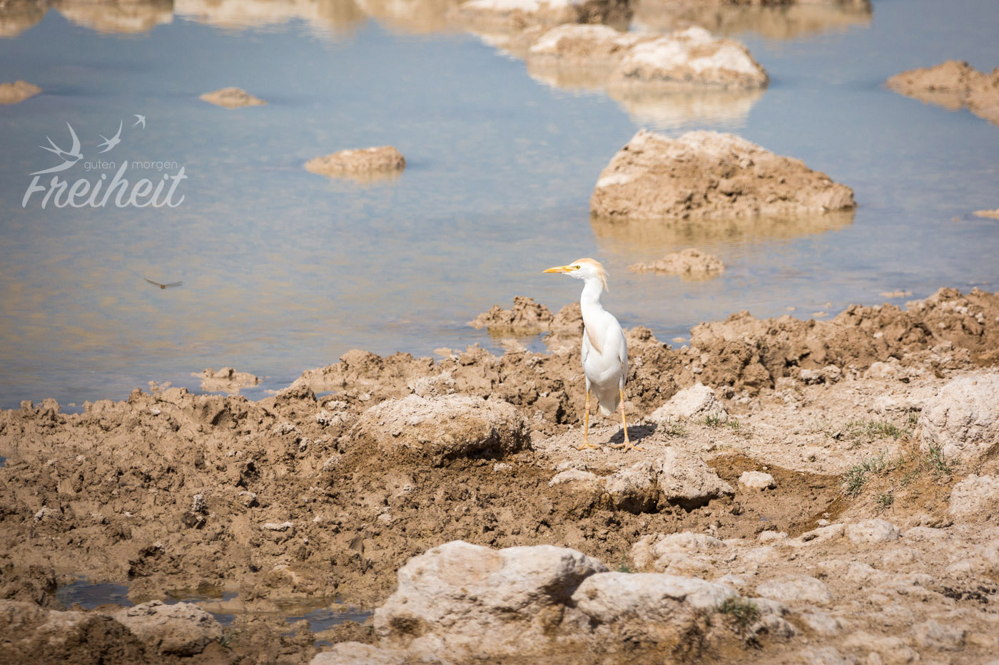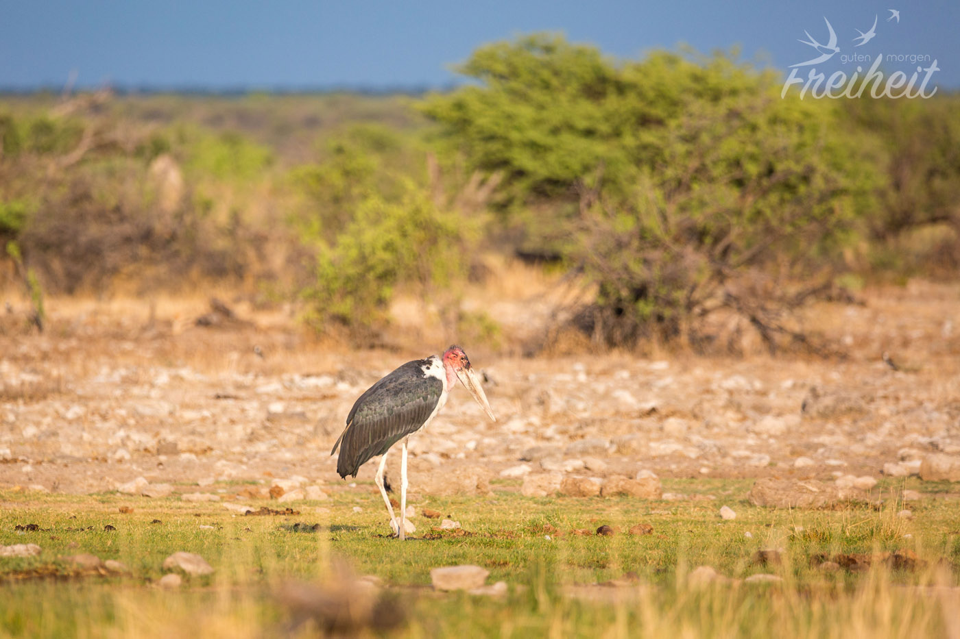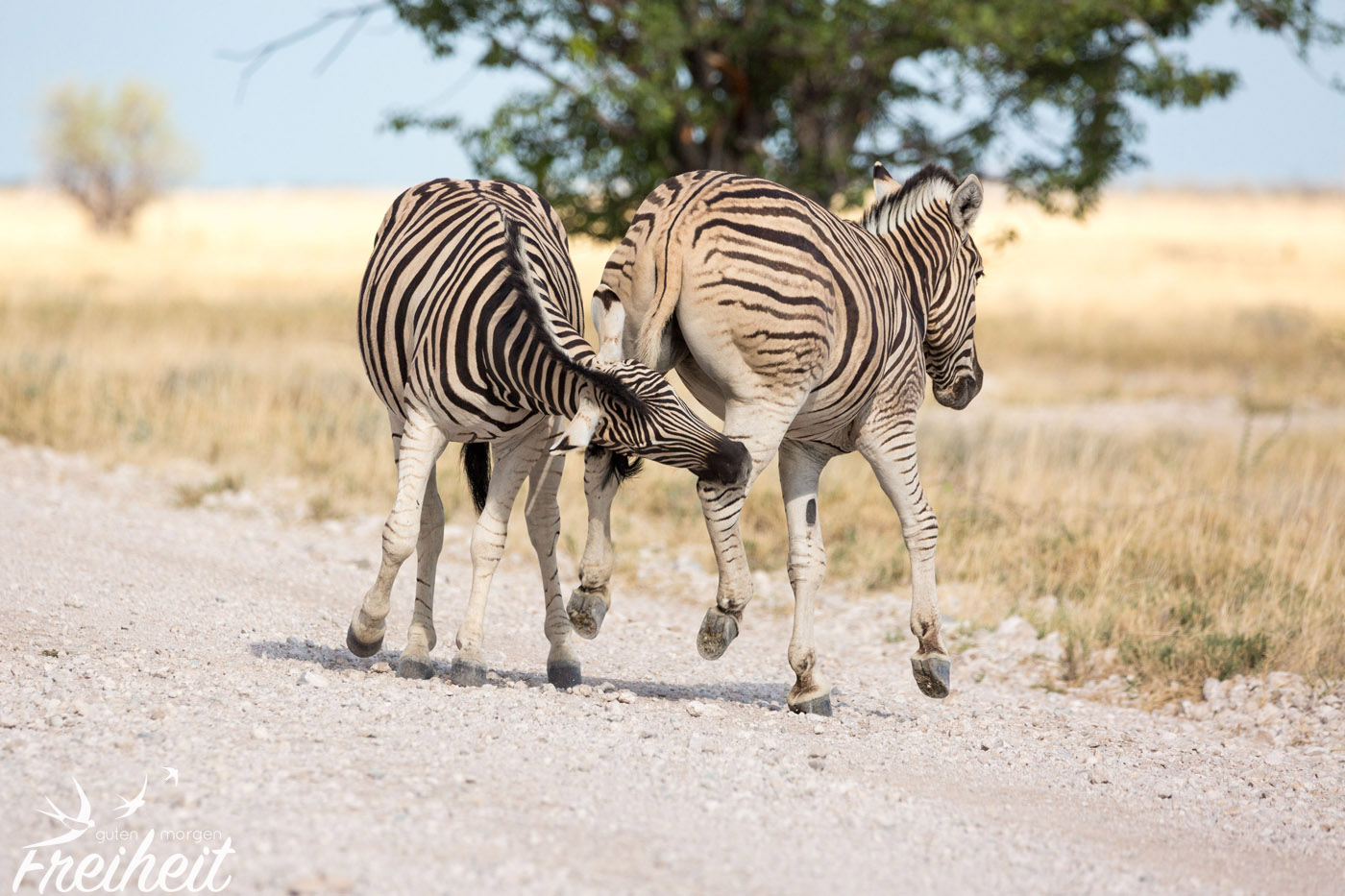 Es gibt natürlich neben den großen Säugetieren auch reichlich verschiedene Vogelarten zu beobachten. Besonders imposant sind natürlich die Raubvögel und die großen Geier, die lauernd in der Luft schweben und nur darauf warten, dass was für sie übrig bleibt. Aber auch die Riesentrappe mit ihrem stolzen Gang und der Sekretär, der eigentlich zu den Greifvögeln gehört, obwohl er mit seinen langen Beinen eher an einen Kranich erinnert, sind Vögel, die man immer wieder zu Gesicht bekommt. Aber ausgerechnet ein eher „langweiliger“ Vogel wird uns im Gedächtnis bleiben. Es war ein Rabe. Während wir eigentlich mitten beim Fotografieren von einer ganzen Schar von Tieren am Wasserloch waren, sehen wir im Augenwinkel einen Raben vor unserem Wagen. Ein Rabe, der sich gerade ein Maus schnappt. Beziehungsweise es versucht. Denn die Maus wehrt sich natürlich aus Leibeskräften und fällt immer wieder aus seinem Schnabel und versucht zu flüchten. Irgendwann fliegt er aber doch mit der Maus davon. Ob sie es noch geschafft hat? Das Beste aber ist: wir konnten ein Foto von dem Kampf machen. Zwar nicht ganz scharf, weil es durch die schräge Frontscheibe vom Auto war, aber immerhin. In der Galerie findest du das Bild 🙂