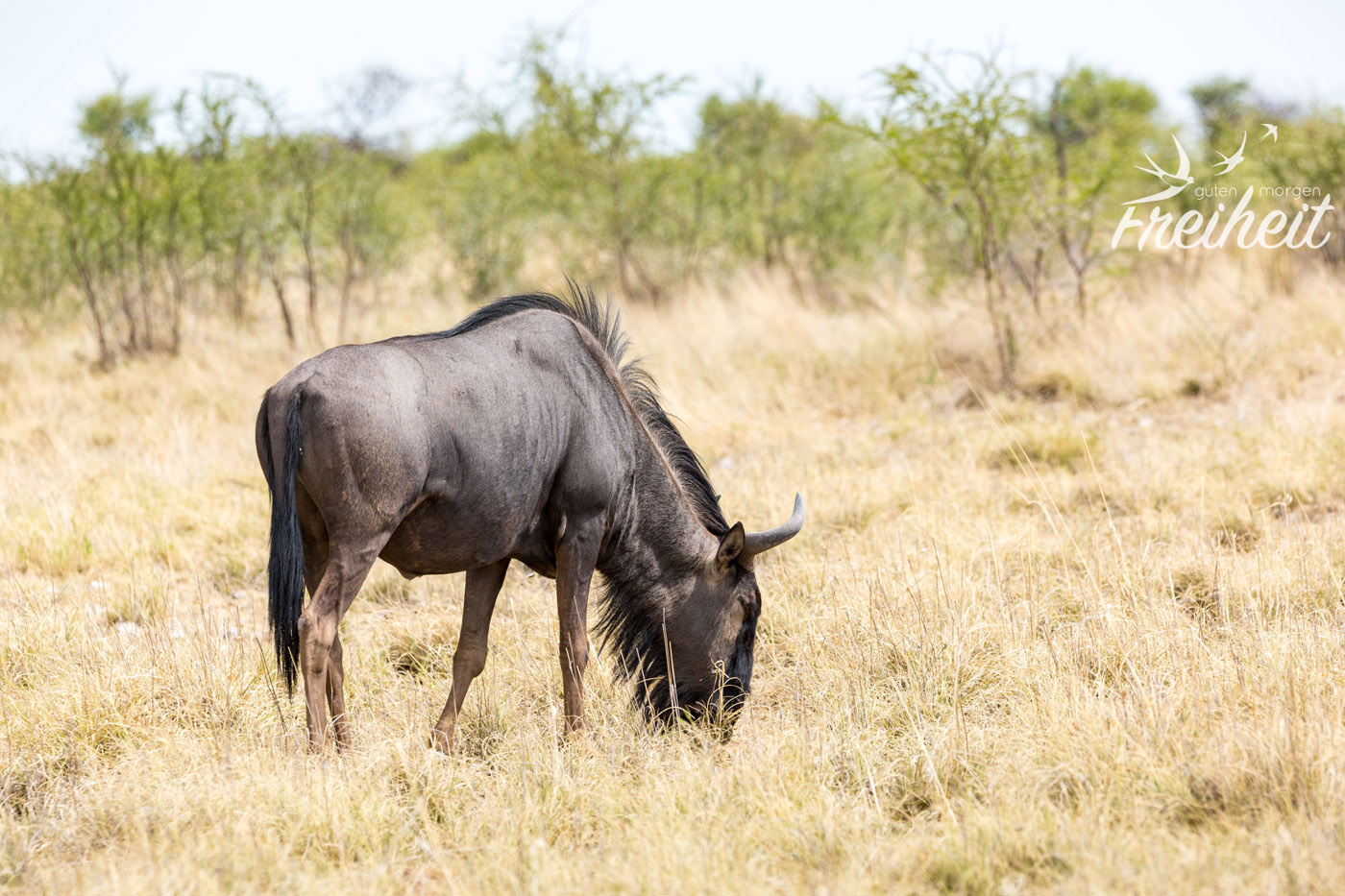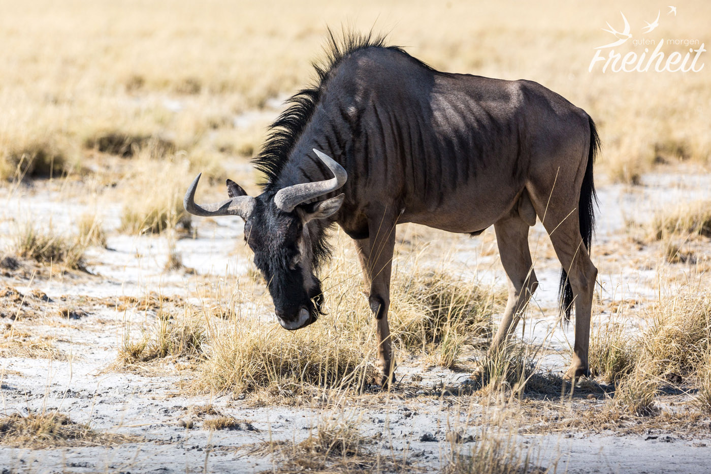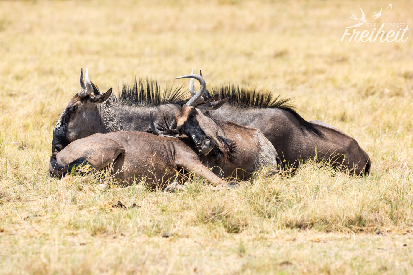 Gnus gehören zu den Kuh-Antilopen und das passt ganz gut, denn ihre Hörner erinnern an die von einigen Rinderarten. Männchen wie Weibchen tragen Hörner und sind auch sonst fast gleich groß und schwer. Oft gibt es ja bei vielen Tieren gravierende Unterschiede was die Körpergröße und das Gewicht zwischen beiden Geschlechtern betrifft. In dem Fall vermutet man, liegt es daran, dass es so innerhalb der Herde zu weniger Aggressivität zwischen den männlichen Tieren kommt. Also nicht das übliche Gehabe: wer ist größer, stärker, schneller oder so 😉