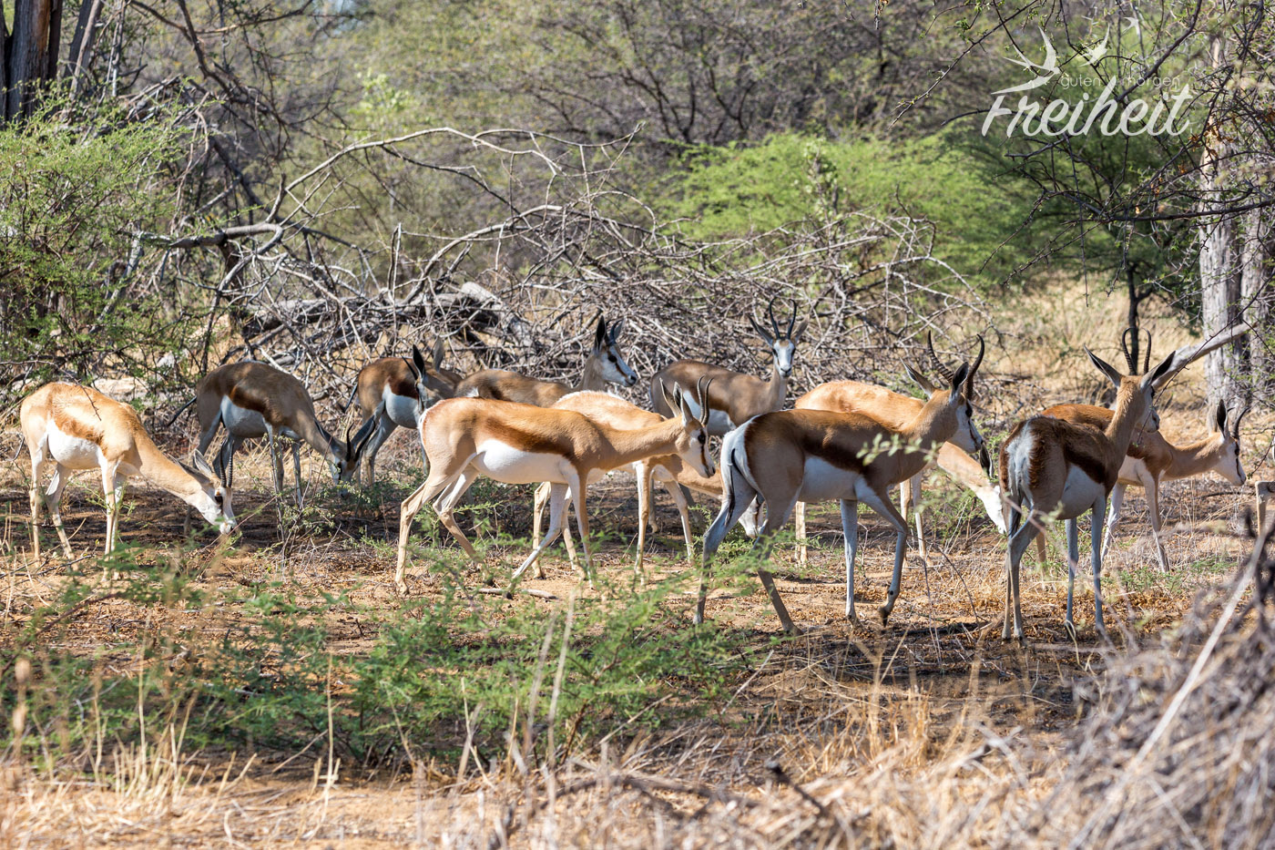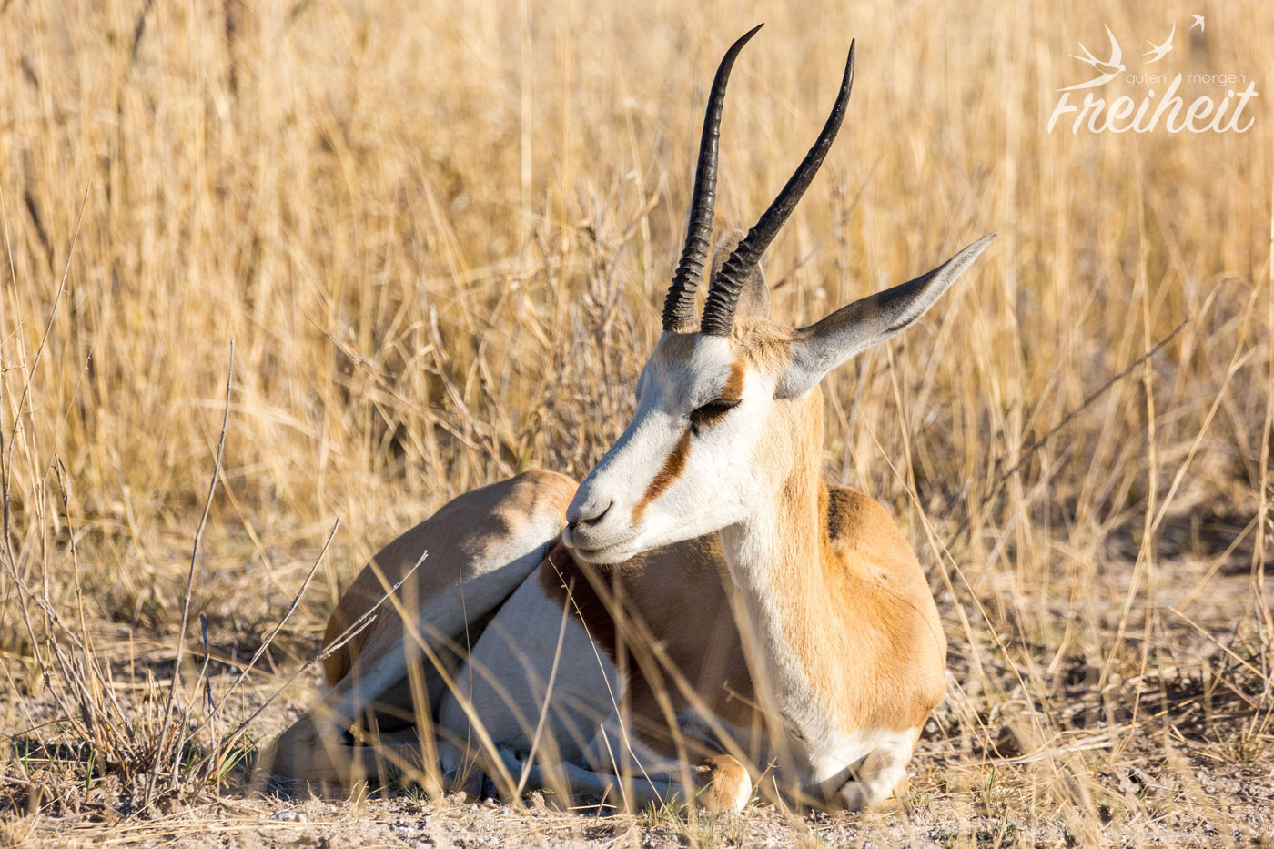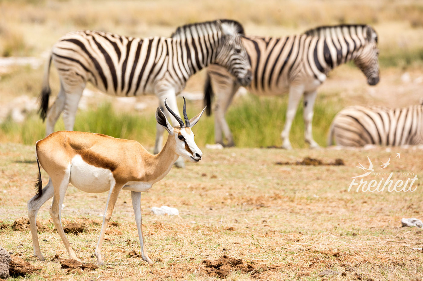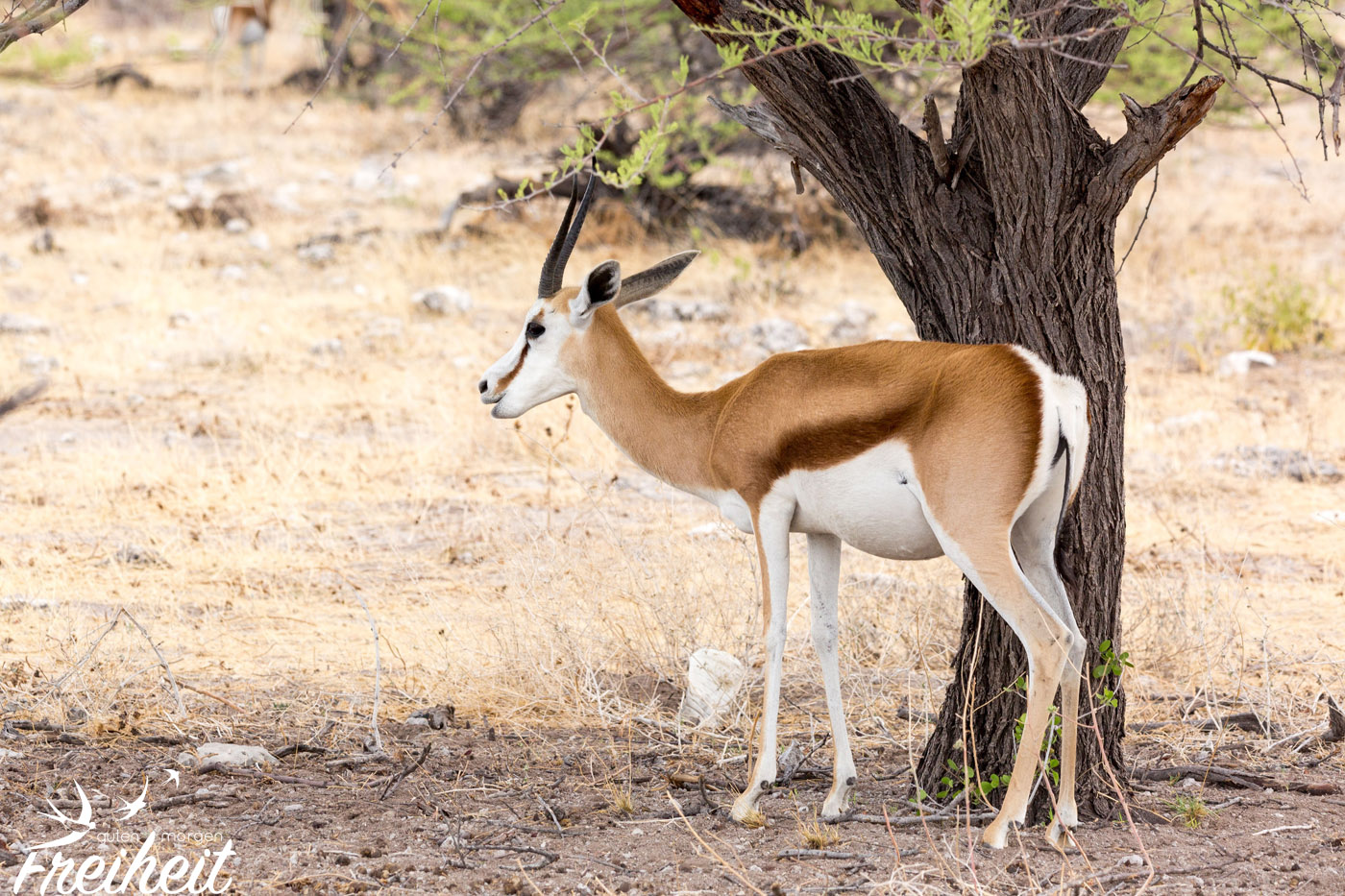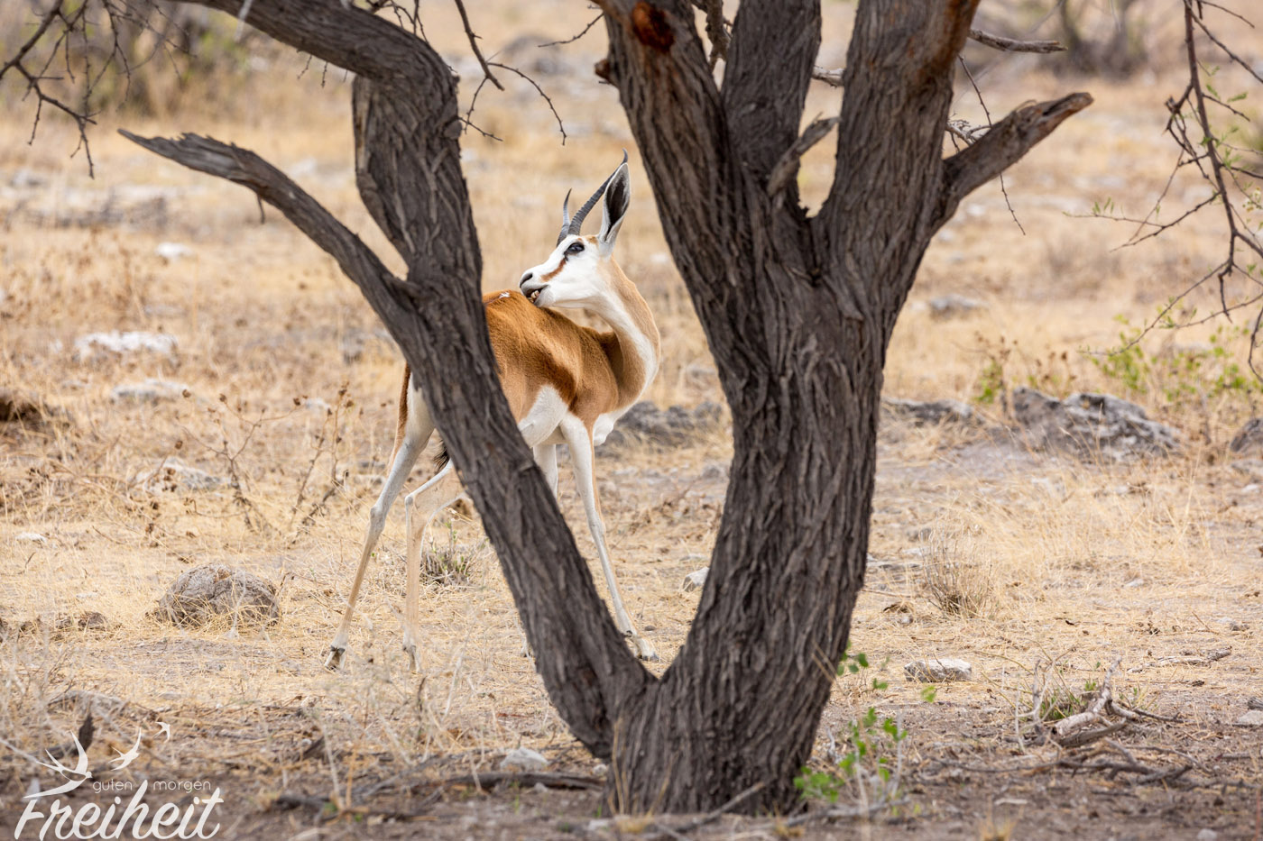 Von allen Tieren in Namibia, haben wir am häufigsten Springböcke gesehen. Sie sind einfach überall da finden, wo auch Steppenlandschaft ist. Die zierlichen Antilopen haben eine bemerkenswerte Stärke. Sie können lange Zeit ohne etwas zu trinken überleben. Sie können aus Gräsern, Kräutern und Knollen genügend Flüssigkeit aufnehmen. Ein echter Survival in langen Trockenzeiten! Eine zweite bemerkenswerte Eigenschaft der Springböcke: sie sind mit bis zu 90km/h (!!) die schnellsten Antilopen und gehören mit dieser Spitzengeschwindigkeit neben Geparden zu den schnellsten Tieren der Welt! Von 0 auf 62km/h in zwei Sekunden! Traut man den kleinen Geschöpfen gar nicht zu 🙂