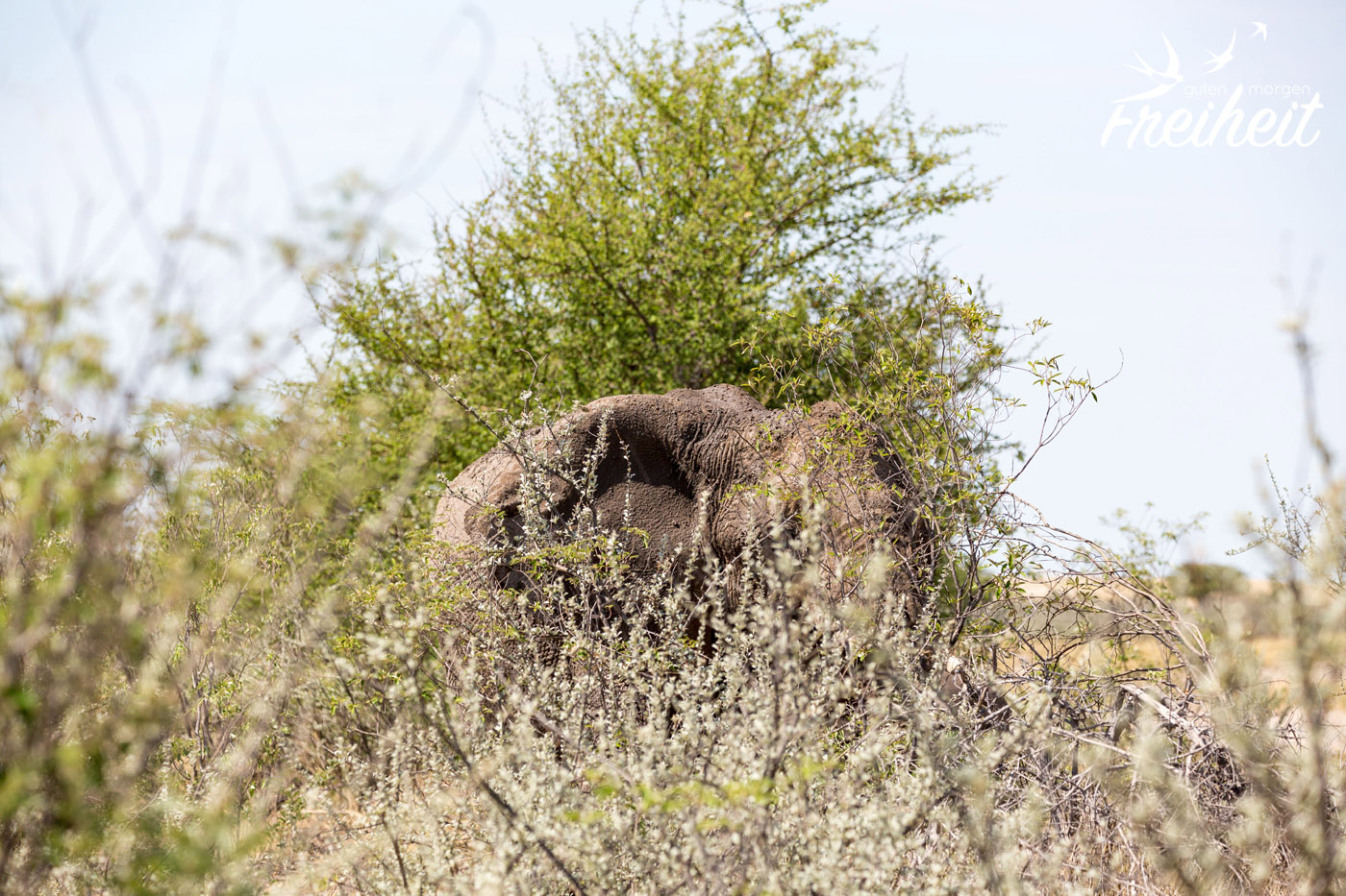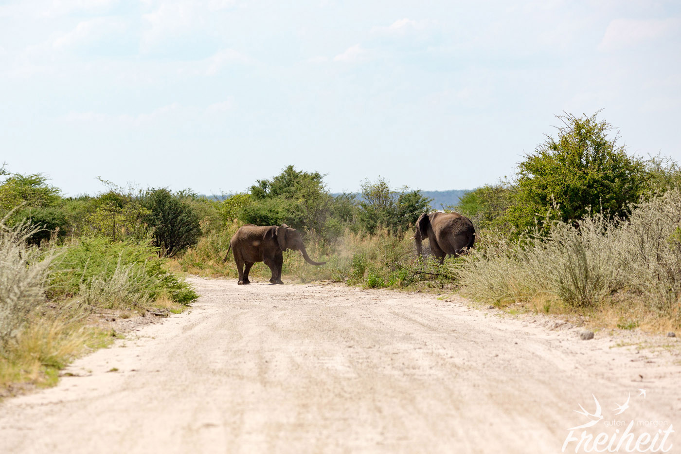Mit der Karte in der Hand, den Fotoapparaten auf dem Schoss und unseren Augen weit geöffnet stehen wir an einer Kreuzung. Links oder rechts? Wir entscheiden uns für den schmaleren Weg und nach ein paar hundert Metern sehen wir tatsächlich schon unsere ersten zwei Afrikanischen Elefanten im Dickicht. Mega! Unglaublich wie gut getarnt diese riesigen Dickhäuter sind. Und schon tauchen noch weitere Elefanten auf. Zwei kämpfen ein wenig direkt vor uns auf dem Weg und schieben sich auch gleich schon wieder ins Gebüsch. Wir legen vorsichtshalber den Rückwärtsgang ein und bemühen uns um ein wenig Abstand. Auch wenn wir gerne Fotos aus der direkten Nähe hätten, mit Elefanten, die kämpfen oder vielleicht noch Nachwuchs dabei haben ist nicht zu spaßen. Während die einen Elefanten an uns vorbei gehen ist der Weg vor uns wieder frei. Also los, langsam und wachsam fahren wir weiter und sehen noch weitere Elefanten links und rechts von uns im Dickicht. Obwohl sie wirklich groß sind, sehen wir meistens nur ihre Köpfe oder Hintern 😉 Unglaublich, nach nur ein paar Minuten erleben wir solch ein Highlight. Damit hätten wir nie gerechnet und wir sind wirklich aufgeregt, ob das noch zu toppen ist 🙂
