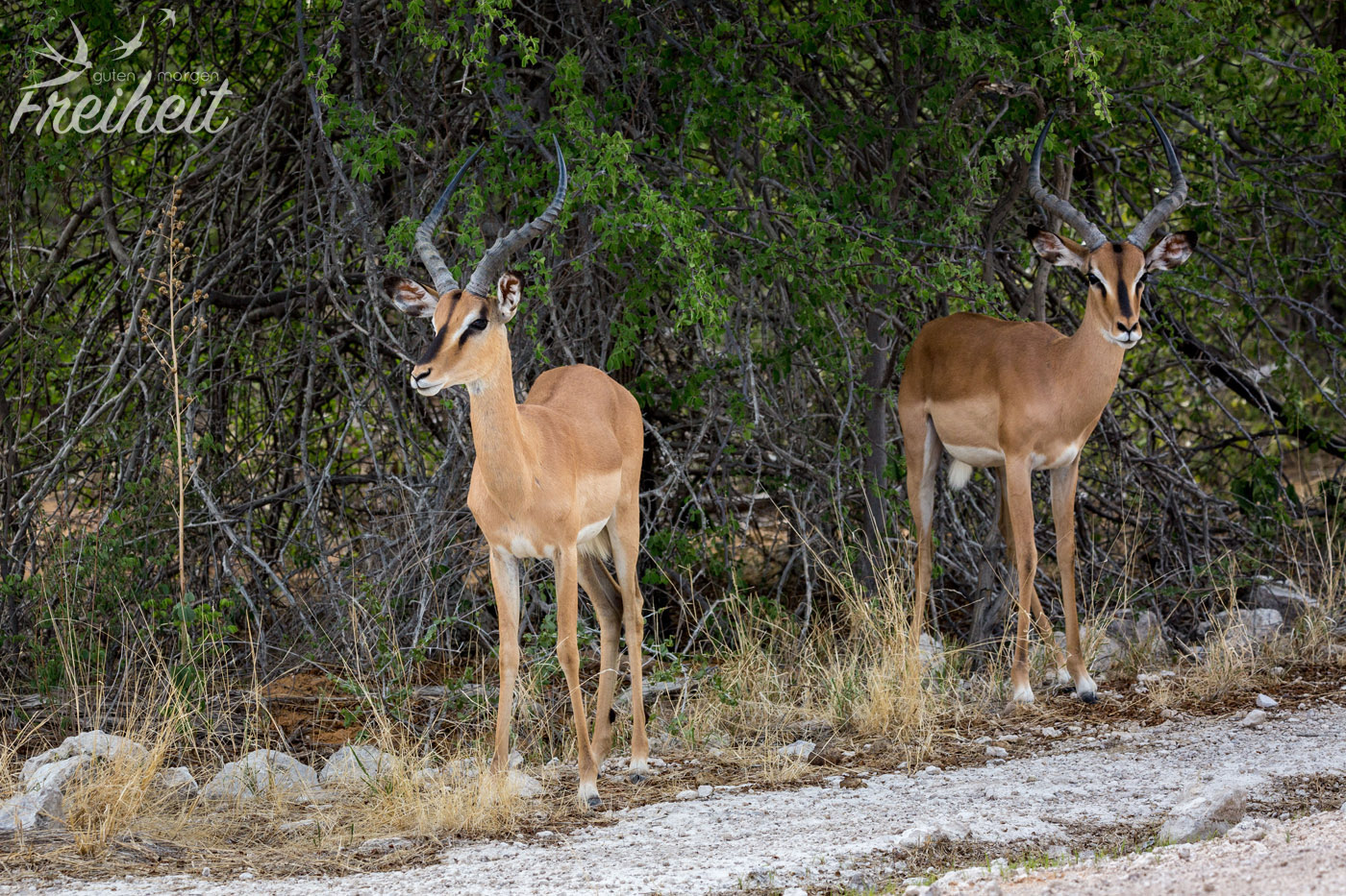 Impalas werden gerne fotografiert. Sie haben einfach ein sehr hübsches Äußeres. Dazu die kunstvoll verdrehten Hörner der Männchen und ein rehbraunes Fell mit schöner Gesichtsbemalung – fertig ist das Schwarznasenimpala. Ebenso wie die Springböcke (kommen noch weiter unten) können sie weite Sprünge vollführen. Bis zu 9 Meter! Und auch Farmzäune können sie leicht überspringen. Wir haben ein Impala beobachtet, dass in der Nähe eines Wasserlochs stand und dann mit einem Male einen riesigen Satz vollführte, zwischendrin noch einen hohen Sprung in die Luft machte und dann weg war. Wir dachten ja erst, es hätte Raubtiere gerochen oder gesehen. Aber es kam niemand aus dem Gebüsch gesprungen. Vielleicht reine Lebensfreude?