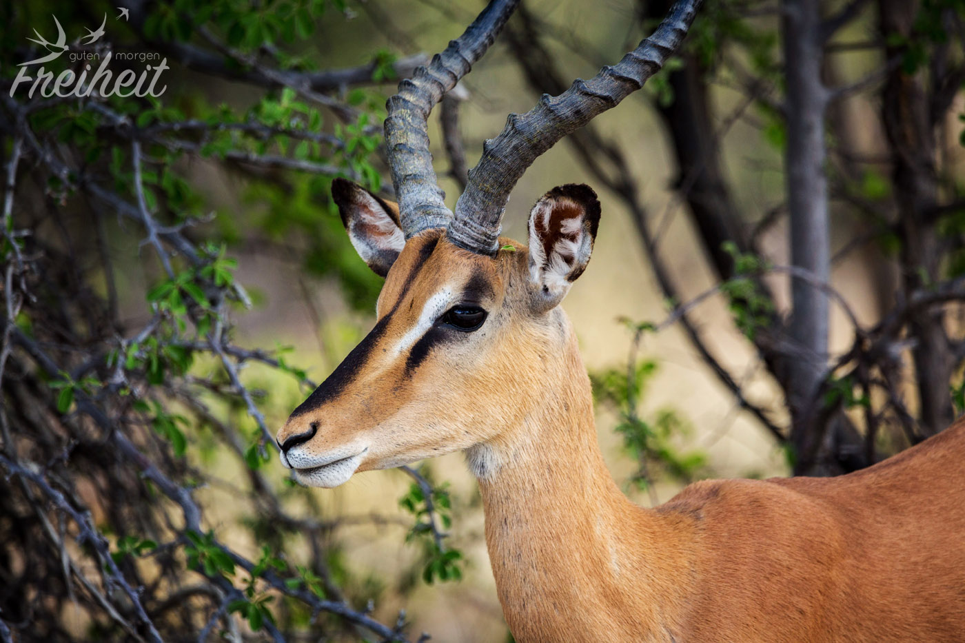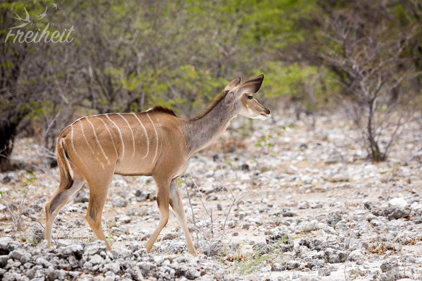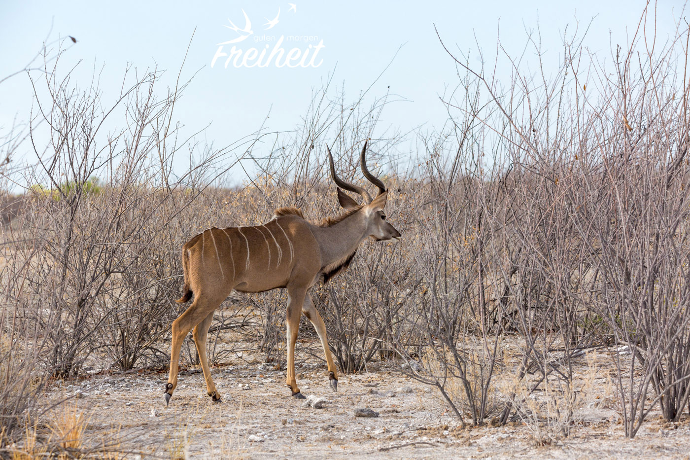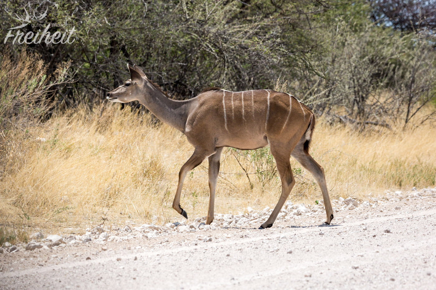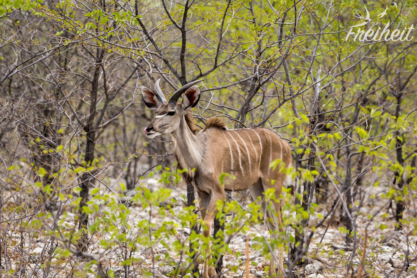 Die Männchen der zweitgrößten Antilopenart der Welt bilden ein beeindruckendes Schraubengehörn aus. Es kann bis zu 1,8m lang werden (inkl. aller Drehungen, versteht sich 😉 ). Bei der Nahrung bevorzugen sie Laub und junge Zweige. Allerdings sind sie nicht wählerisch und vertragen sogar Pflanzen, die andere Tiere wegen ihrer Giftigkeit nicht fressen wollen. Ein riesiger Vorteil von den weißgestreiften Tieren ist ihre enorme Sprungkraft. Obwohl Männchen eine Schulterhöhe von 1,5m und ein Gewicht von bis zu 350kg haben, schaffen sie es bis zu 3m hohe Farmzäune zu überspringen. Neben ihren großen Ohren, fällt der weiße Streifen zwischen ihren Augen auf.