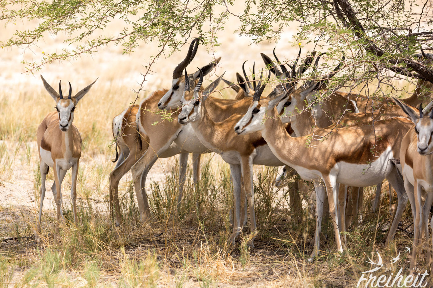 Männlein wie Weiblein tragen geringelte Hörner – die der Frauen sind etwas schlanker. Sie sind sehr gesellig und kommen fast immer in Gruppen vor. Zur Regenzeit mit bis zu 1000 Individuen! Aber das ist noch nichts zu früheren Jahrhunderten, wo eine Gruppengröße bis zu einer Million (laut Wikipedia) erreicht wurde. Wahnsinn.