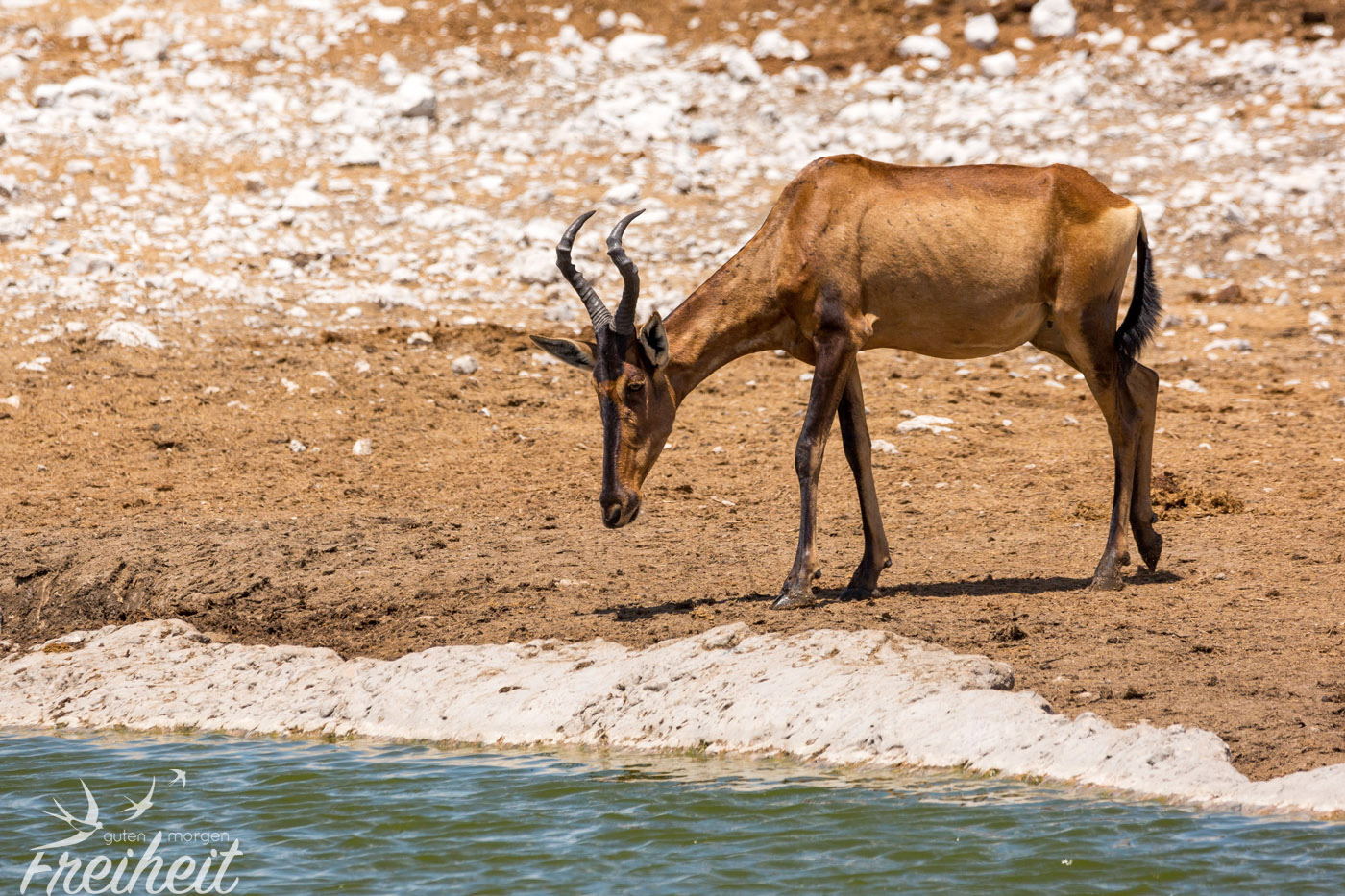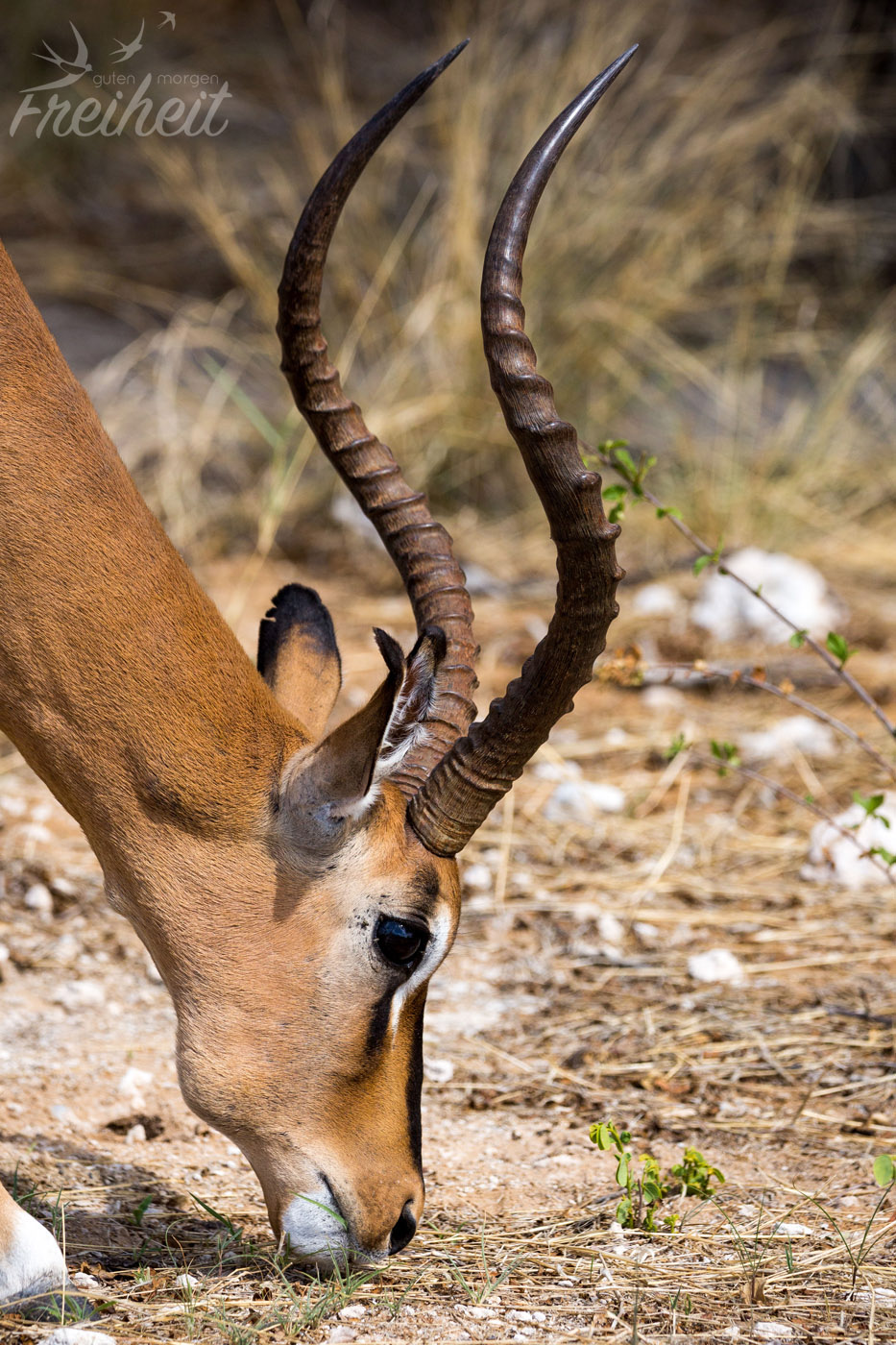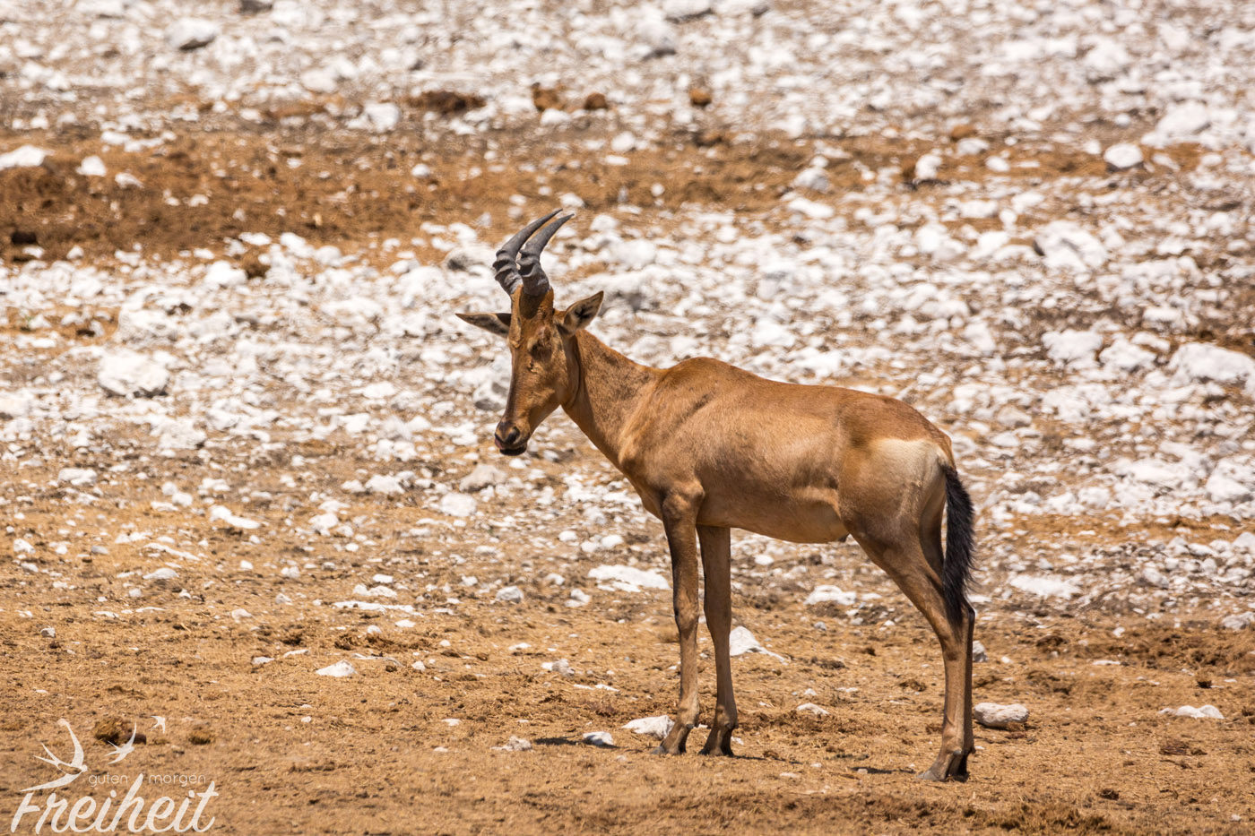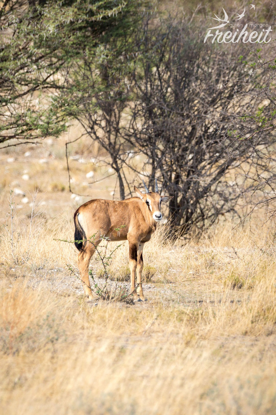 Diese Antilopenart haben wir nur zweimal Mal gesehen. Einmal waren ein paar der Tiere am Wasserloch und einmal sahen wir ein Mutttertier mit ihrem Jungen. Das Junge war zwischen dem hoch gewachsenen Gras gut getarnt und es war gar nicht so einfach den Fokus mit der Kamera zu finden 😉