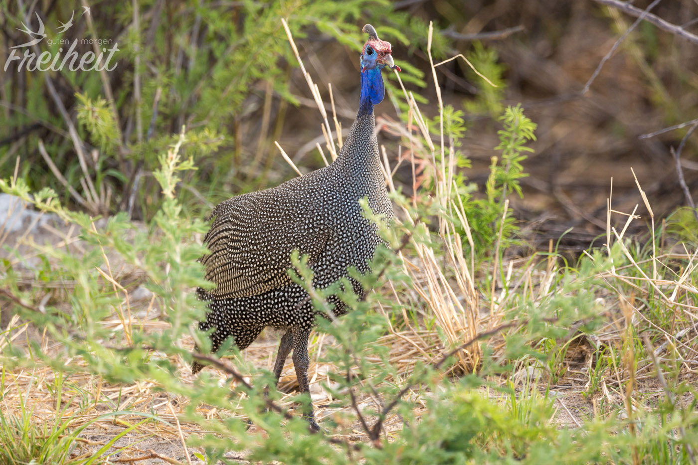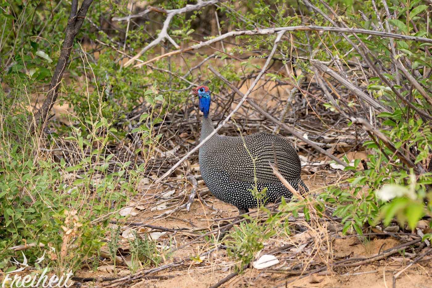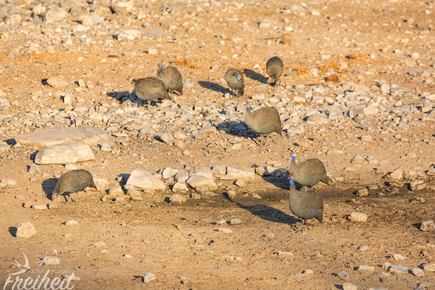 Das Helmperlhuhn begleitet uns nun schon seit wir durch Namibia fahren, aber so richtig viele sehen wir erstmals im Etosha Nationalpark. Die lustig anzuschauenden Vögel kommen vor allem in offenen Lebensräumen vor und so überrascht es auch nicht, dass sie gerne am Wegesrand oder an jeglicher Straße vorkommen. Hauptsache es ist weitläufig genug, warm und es herrscht kein Mangel an Wasser. An Wasserlöchern können wir sie in Scharen beobachten und sind überrascht, wie flink sie mal eben los fliegen können. Je nach Körperhaltung erinnert uns ihr schönes Federkleid an eine wandelnde Handtasche, was natürlich total unfair und von uns nicht böse gemeint ist 😉 Sie sind einfach toll anzuschauen und ihre Bewegungen machen jeden Tag etwas schöner 🙂