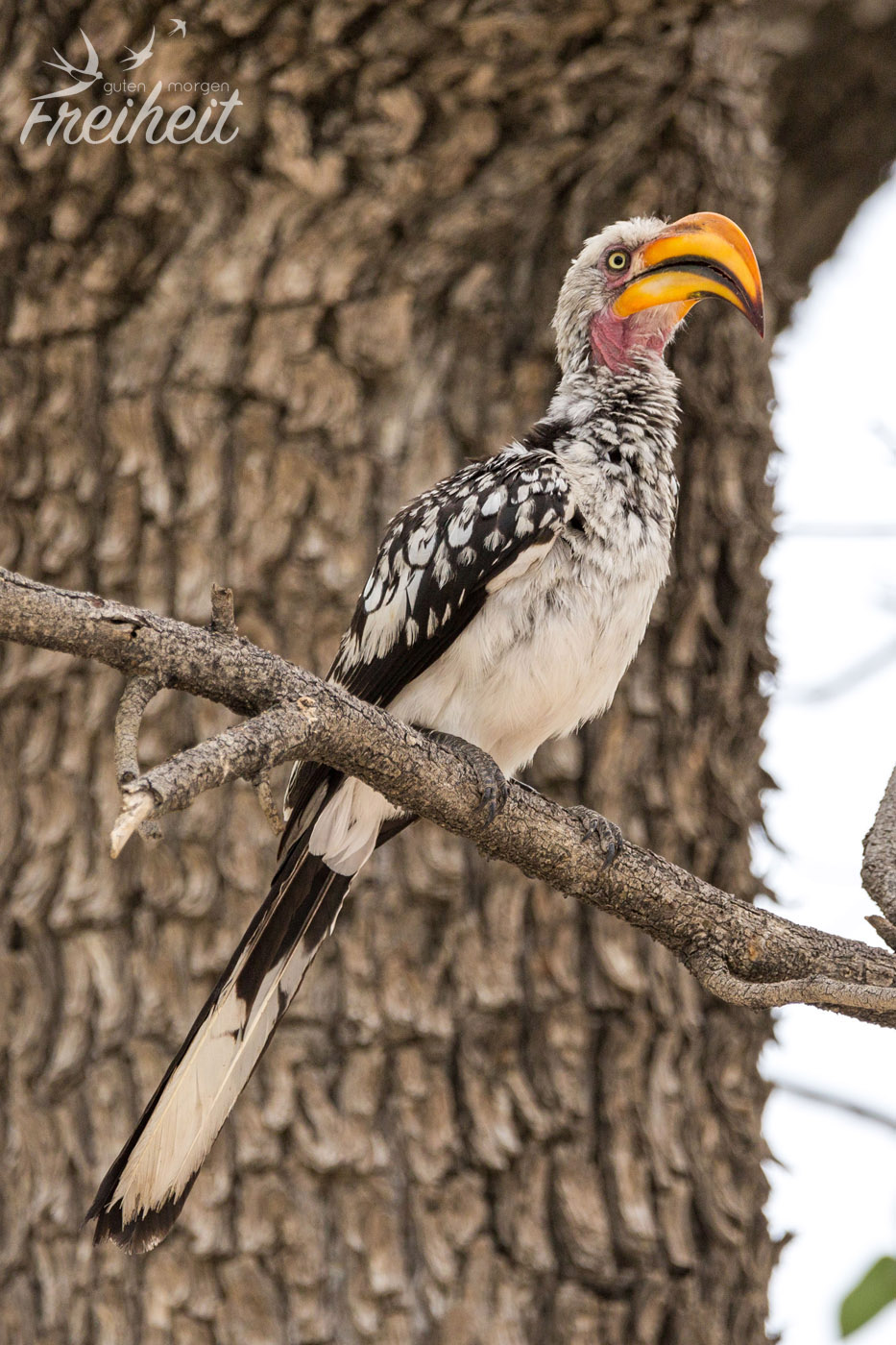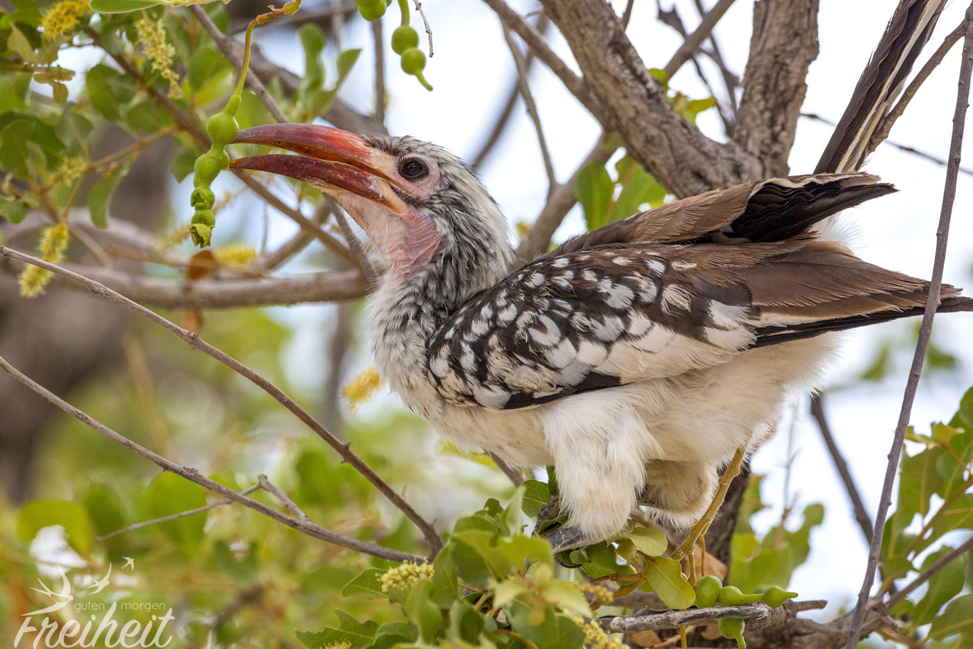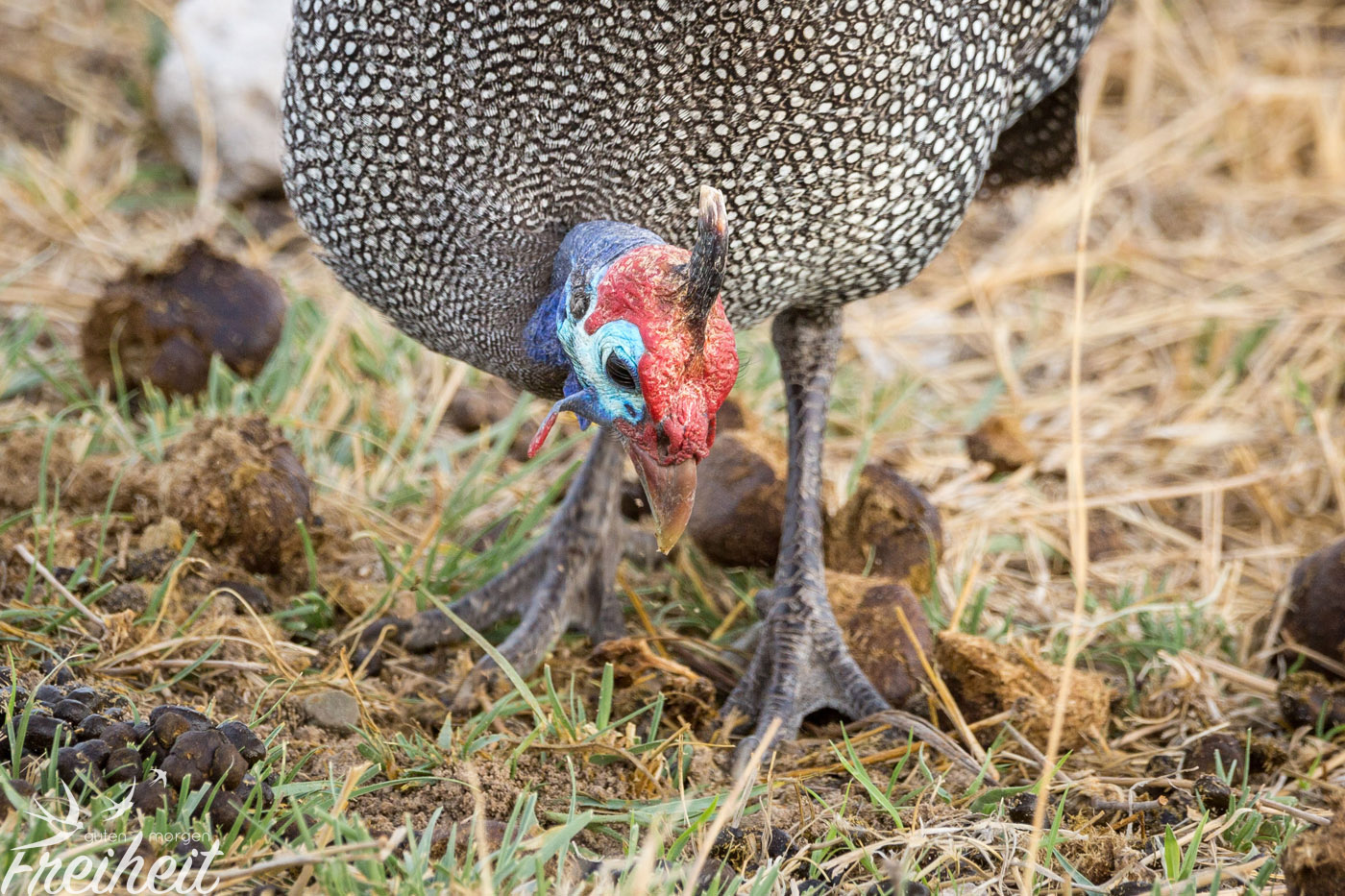 Das Helmperlhuhn begleitet uns nun schon seit wir durch Namibia fahren, aber so richtig viele sehen wir erstmals im Etosha Nationalpark. Die lustig anzuschauenden Vögel kommen vor allem in offenen Lebensräumen vor und so überrascht es auch nicht, dass sie gerne am Wegesrand oder an jeglicher Straße vorkommen. Hauptsache es ist weitläufig genug, warm und es herrscht kein Mangel an Wasser. An Wasserlöchern können wir sie in Scharen beobachten und sind überrascht, wie flink sie mal eben los fliegen können. Je nach Körperhaltung erinnert uns ihr schönes Federkleid an eine wandelnde Handtasche, was natürlich total unfair und von uns nicht böse gemeint ist 😉 Sie sind einfach toll anzuschauen und ihre Bewegungen machen jeden Tag etwas schöner 🙂