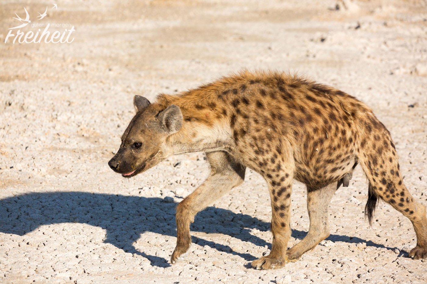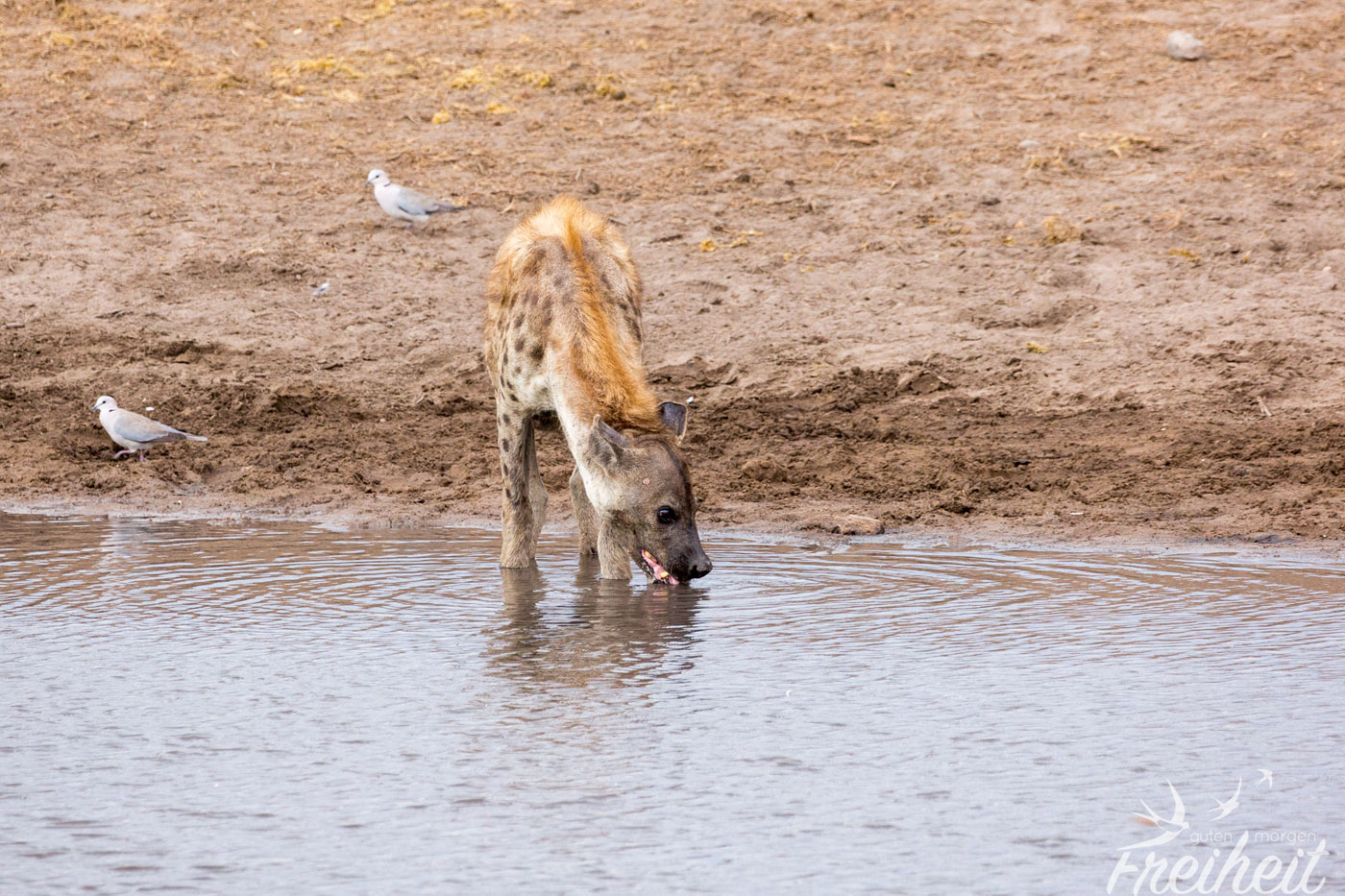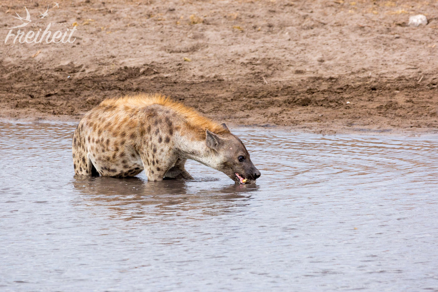 Hyänen gehören zu den Raubtieren, die sich sowohl von Aas, als auch wie bei den Tüpfelhyänen üblich von der aktiven Jagd ernähren. Tüpfelhyänen leben in großen Verbänden bis zu 80 Tieren, die von miteinander verwandten Weibchen gebildet werden. Ihr Sozialverhalten gilt unter Raubtieren als einzigartig, gleicht es in weiten Teilen den Altweltaffen, wie z.B. den Pavianen. Die Weibchen sind ca. 10% größer als die Männchen und haben optisch ähnlich geformte Geschlechtsteile, was bei der Geschlechtsbestimmung aus der Ferne wenig hilfreich ist 😉 Die Tüpfelhyäne ist die einzige ihrer Gattung, die verschiedene Laute zur Kommunikation nutzt. Der Hauptlaut, ein lautes „wuup“ ist kilometerweit zu hören und dient der Kontaktaufnahme mit anderen Gruppenmitgliedern. Das Territorium der Tüpfelhyäne kann riesige Ausmaße annehmen, im südlichen Afrika sogar bis über 1000 Quadratkilometer. Aus der Sicht der Menschen nehmen Hyänen verschiedenste Rollen ein. Von positiv bis negativ besetzt ist alles dabei. Ihre äussere Erscheinung ist wenig kuschelig und anmutig, doch wenn sie baden gehen und einen anschauen, als ob sie kein Wässerchen trüben könnten, erinnern sie ein wenig an den großen Hund von Nebenan beim Plantschen – und wenn der kein Futter bekäme, wäre er sicher auch nicht mehr so lieb 🙂