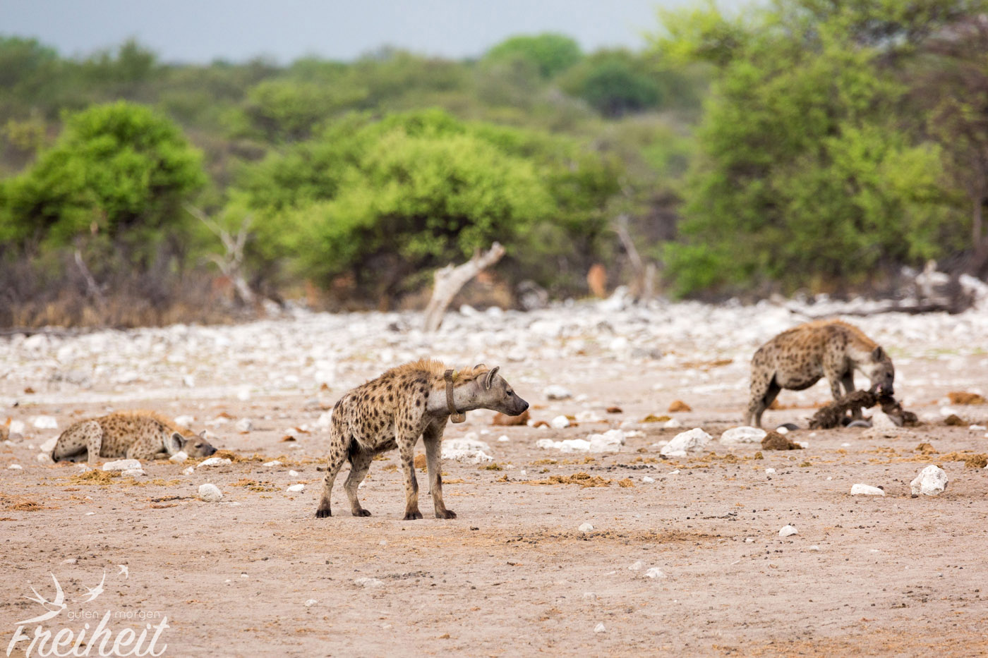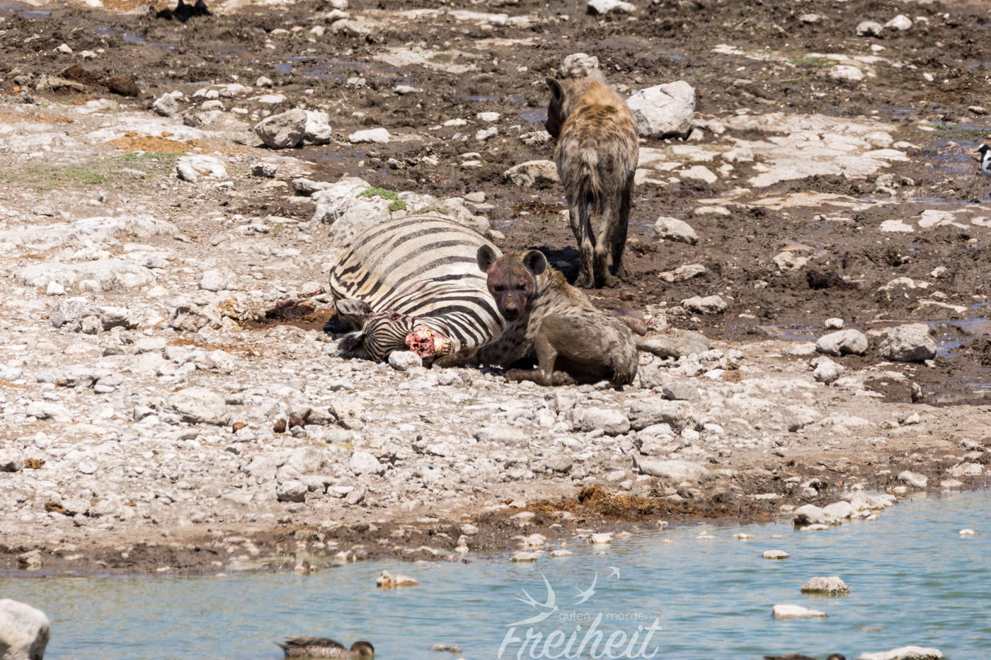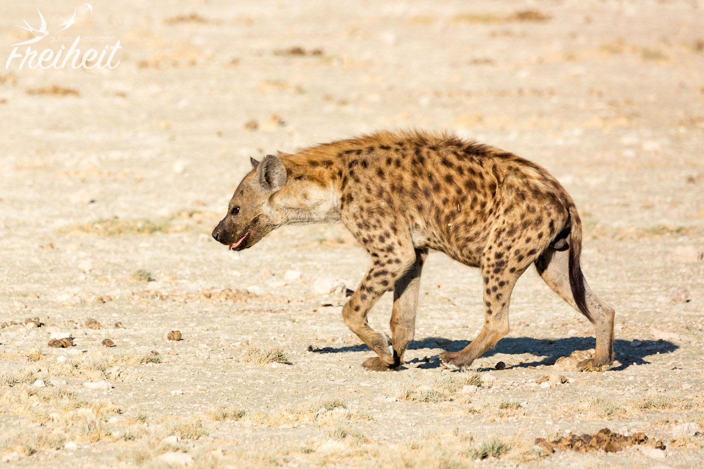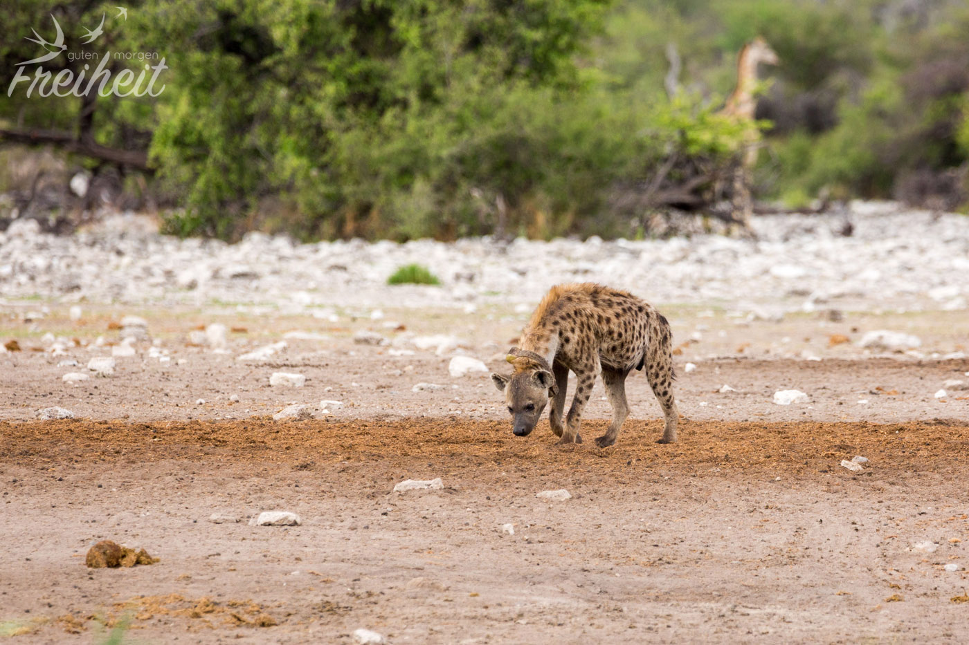 Hyänen gehören zu den Raubtieren, die sich sowohl von Aas, als auch wie bei den Tüpfelhyänen üblich von der aktiven Jagd ernähren. Tüpfelhyänen leben in großen Verbänden bis zu 80 Tieren, die von miteinander verwandten Weibchen gebildet werden. Ihr Sozialverhalten gilt unter Raubtieren als einzigartig, gleicht es in weiten Teilen den Altweltaffen, wie z.B. den Pavianen. Die Weibchen sind ca. 10% größer als die Männchen und haben optisch ähnlich geformte Geschlechtsteile, was bei der Geschlechtsbestimmung aus der Ferne wenig hilfreich ist 😉 Die Tüpfelhyäne ist die einzige ihrer Gattung, die verschiedene Laute zur Kommunikation nutzt. Der Hauptlaut, ein lautes „wuup“ ist kilometerweit zu hören und dient der Kontaktaufnahme mit anderen Gruppenmitgliedern. Das Territorium der Tüpfelhyäne kann riesige Ausmaße annehmen, im südlichen Afrika sogar bis über 1000 Quadratkilometer. Aus der Sicht der Menschen nehmen Hyänen verschiedenste Rollen ein. Von positiv bis negativ besetzt ist alles dabei. Ihre äussere Erscheinung ist wenig kuschelig und anmutig, doch wenn sie baden gehen und einen anschauen, als ob sie kein Wässerchen trüben könnten, erinnern sie ein wenig an den großen Hund von Nebenan beim Plantschen – und wenn der kein Futter bekäme, wäre er sicher auch nicht mehr so lieb 🙂
