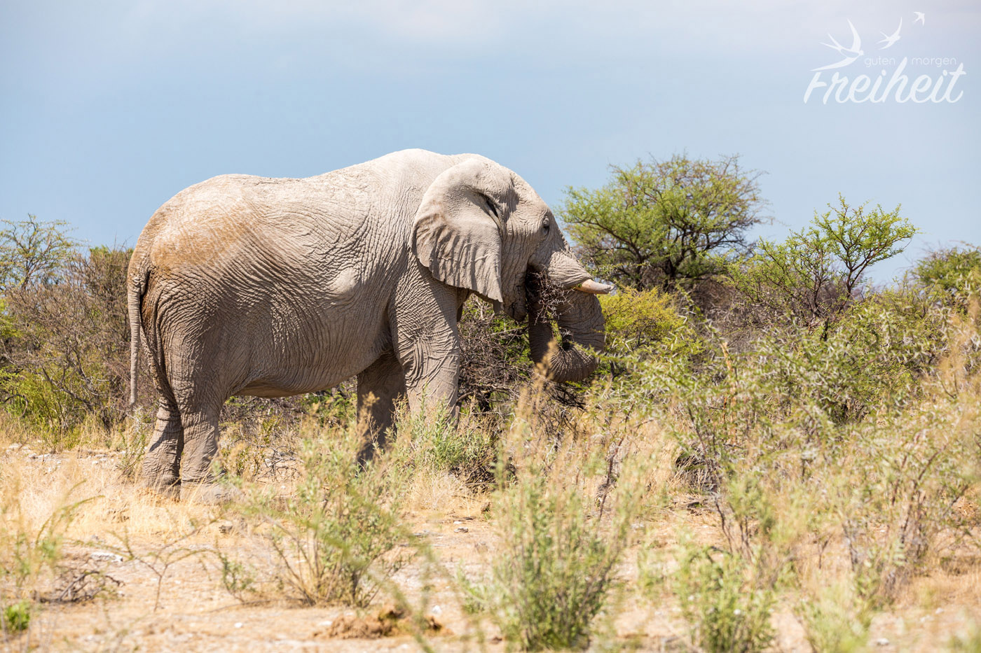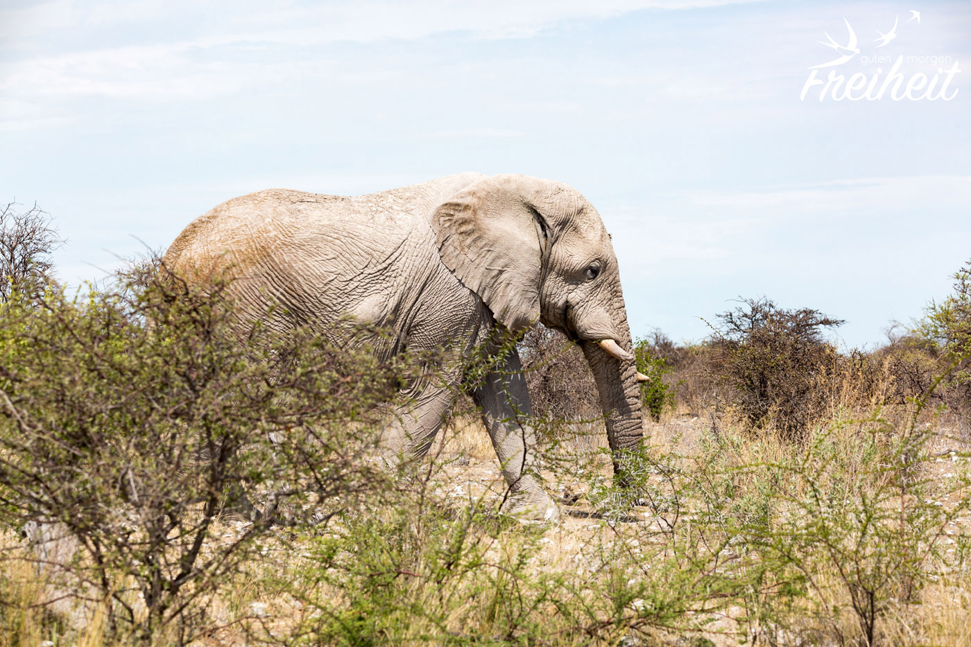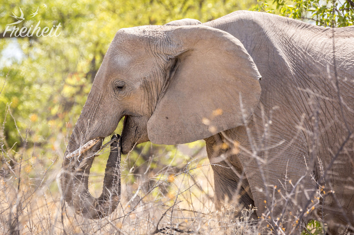 Im Etosha Nationalpark zählt man rund 2500 Afrikanische Elefanten. Die Chance hier einen anzutreffen, ist also gar nicht mal so gering. Wir haben jeden Tag mindestens einmal Elefanten getroffen. Die erste Begegnung haben wir ganz oben schon erzählt, die zweite Begegnung war mit einem großen Bullen, der sich Unmengen an dornigen Sträuchern ins Maul stopfte. Das dritte Mal sahen wir eine Familie beim Grasen im Dickicht zu. Dabei war auch ein richtig winziges Junges im Getümmel. Vermutlich nur wenige Wochen alt. Und die letzte Begegnung war am Wasserloch vom Campingplatz. Auch hier war eine ganze Familie aus ca. 12-15 Elefanten da. Einer hat sogar laut trompetet, während die Jungen fröhlich im Wasser plantschten und die Erwachsenen ihren Durst löschten. Eine Begegnung mit den Elefanten ist einfach immer wieder ein Highlight 🙂