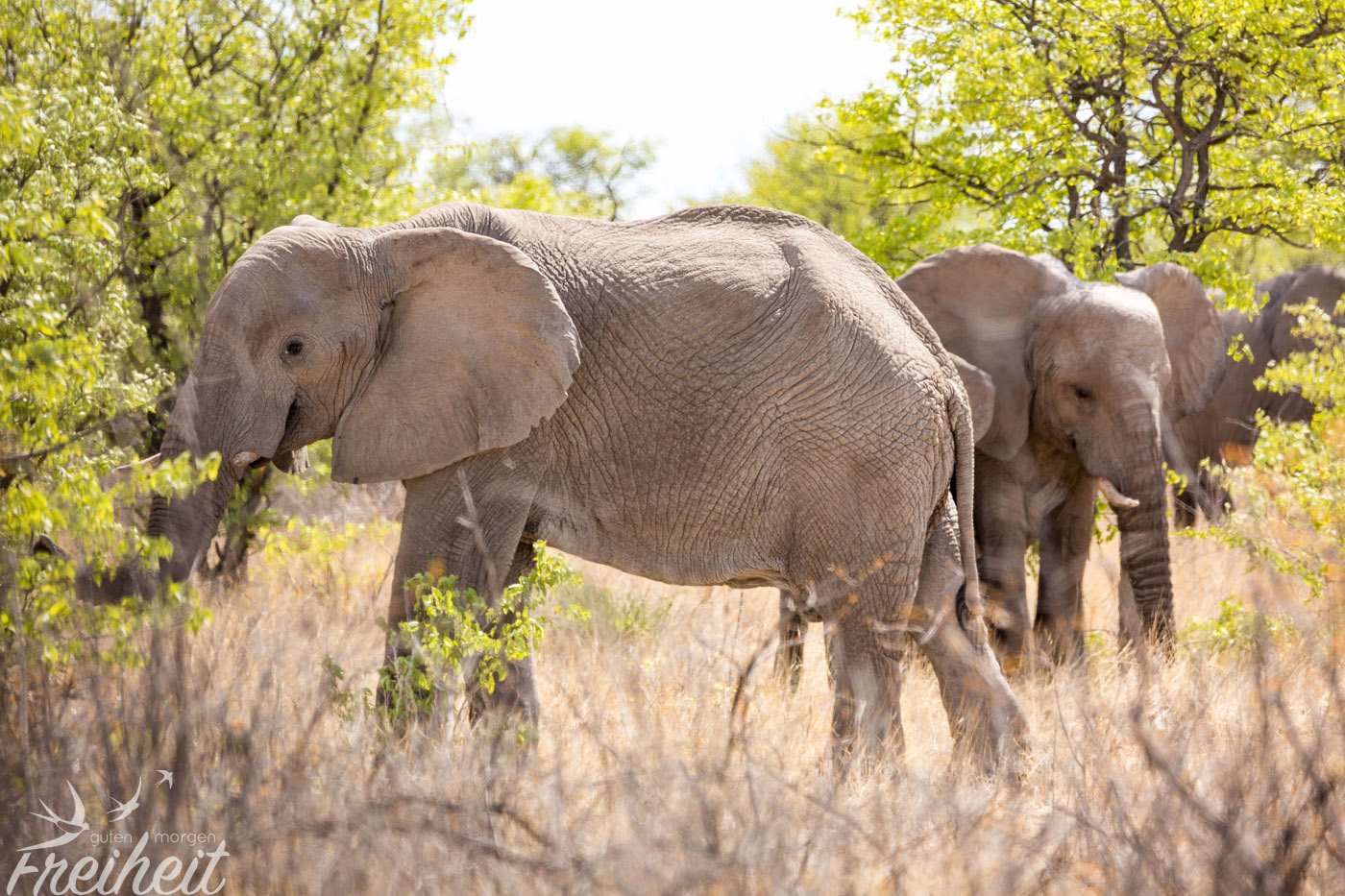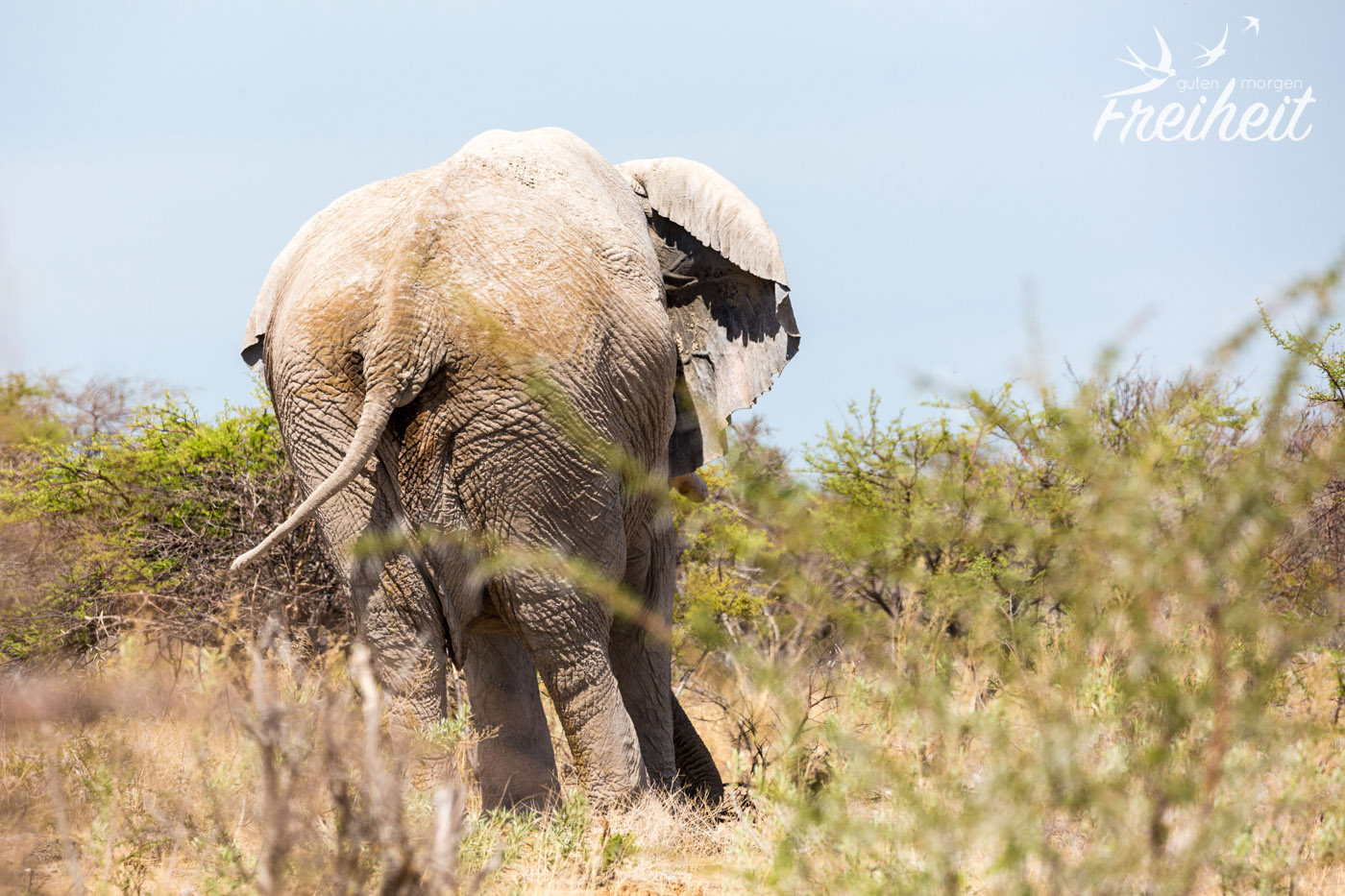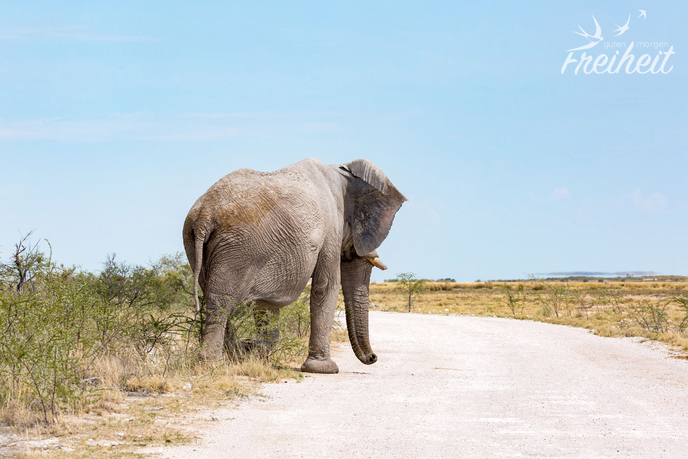 Im Etosha Nationalpark zählt man rund 2500 Afrikanische Elefanten. Die Chance hier einen anzutreffen, ist also gar nicht mal so gering. Wir haben jeden Tag mindestens einmal Elefanten getroffen. Die erste Begegnung haben wir ganz oben schon erzählt, die zweite Begegnung war mit einem großen Bullen, der sich Unmengen an dornigen Sträuchern ins Maul stopfte. Das dritte Mal sahen wir eine Familie beim Grasen im Dickicht zu. Dabei war auch ein richtig winziges Junges im Getümmel. Vermutlich nur wenige Wochen alt. Und die letzte Begegnung war am Wasserloch vom Campingplatz. Auch hier war eine ganze Familie aus ca. 12-15 Elefanten da. Einer hat sogar laut trompetet, während die Jungen fröhlich im Wasser plantschten und die Erwachsenen ihren Durst löschten. Eine Begegnung mit den Elefanten ist einfach immer wieder ein Highlight 🙂