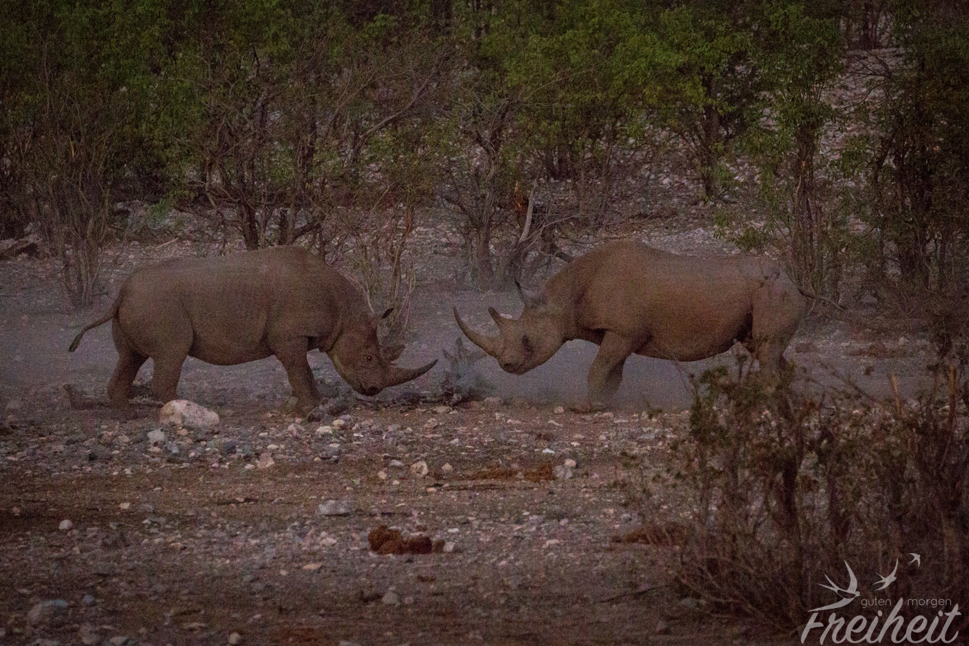 Wir hatten das Glück Nashörner im Nationalpark anzutreffen. Das ganze allerdings nicht auf Safari, sondern an einem künstlich angelegten Wasserloch, das direkt am Halali Camingplatz liegt. Abends und morgens sollte man nicht die Chance verpassen und die Wasserlöcher aufsuchen, denn es tummeln sich gerne im Dämmerlicht viele Tiere rund um das Wasser. Man selbst sitzt erhöht hinter dem umzäunten Campingplatz und kann den Tieren beim Trinken, Fressen oder Kämpfen zusehen. Oder beim Paaren! Wir waren noch vor Sonnenaufgang da und konnten zwei Nashörner dabei beobachten, wie sie um ein Weibchen kämpften (leider war es da noch zu dunkel zum Fotografieren). Der Verlierer zog von dannen und der Gewinner warb um das Weibchen. Alles versteckt hinter dem niedrigen Gebüsch. Irgendwann hatte das Männchen Erfolg und fing an sich mit dem Weibchen zu paaren. Und das ging laaaaaang. Und hat auch einen zweiten Versuch erfordert. So einfach scheint es für das Männchen nicht zu sein sich mit seinen glatten Hufen oben zu halten. Aber gut Ding will Weile haben 😉 Wir hatten übrigens doppelt Glück. Schon am nächsten Tag am Abend waren wieder zwei Rhinos am Wasserloch. Diesmal eine Mutter mit ihrem größeren Sohnemann. Spannend wurde es, als ein Bulle dazu kam. Auch wenn das Jungtier eigentlich noch keinen Konkurrenten für ihn darstellt, spielte er sein übliches Verhalten ab. Einen echten Kampf gab es nicht, aber es brodelte gewaltig und die Mutter gab dem Bullen irgendwann zu verstehen, dass jetzt genug sei. Klingt zwar nicht nach einem Actionfilm, aber diese schon seit 50 Mio. Jahre existierenden Tiere in freier Wildbahn beobachten zu können, ist spannender als ins Kino zu gehen 😉