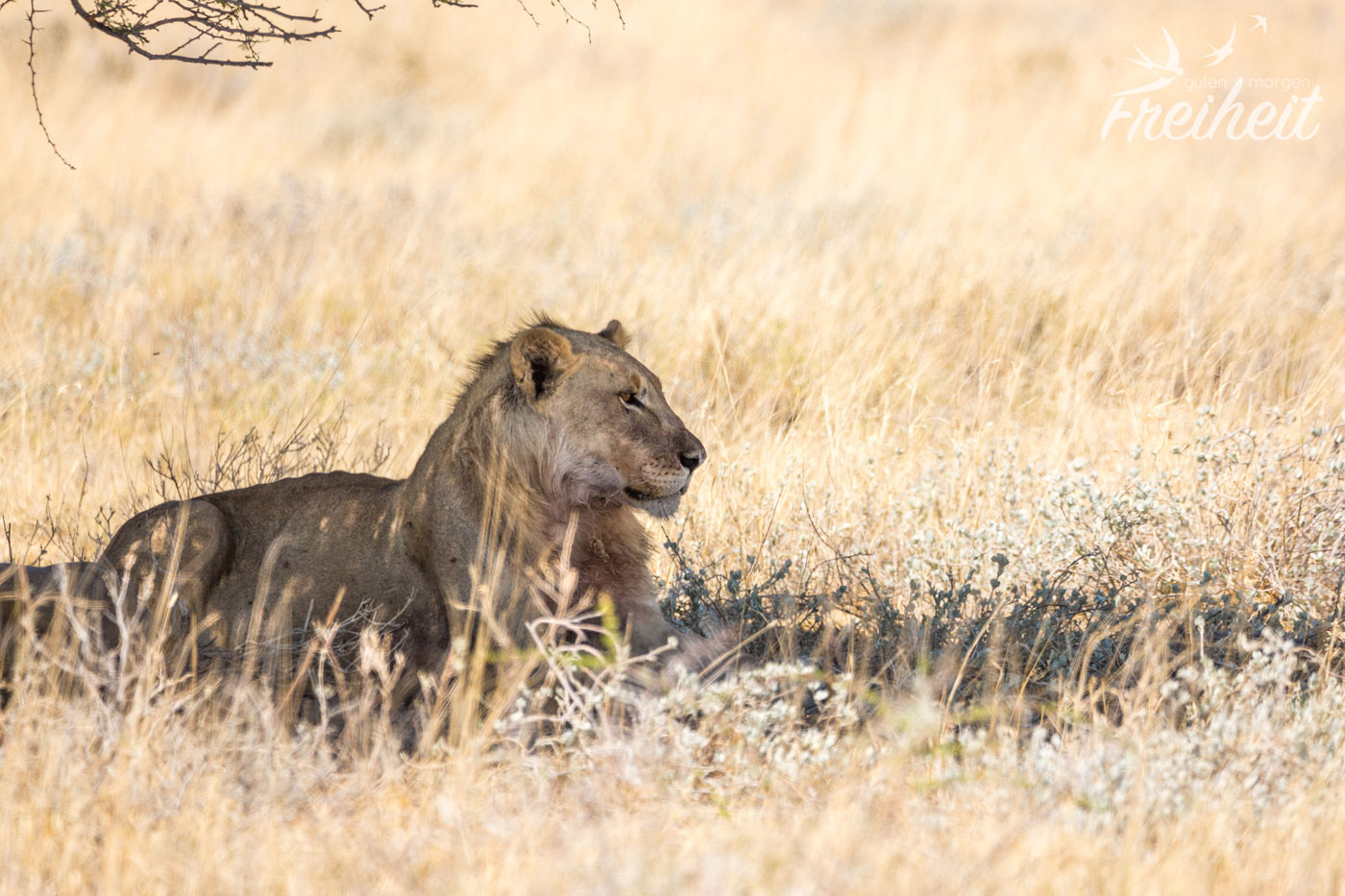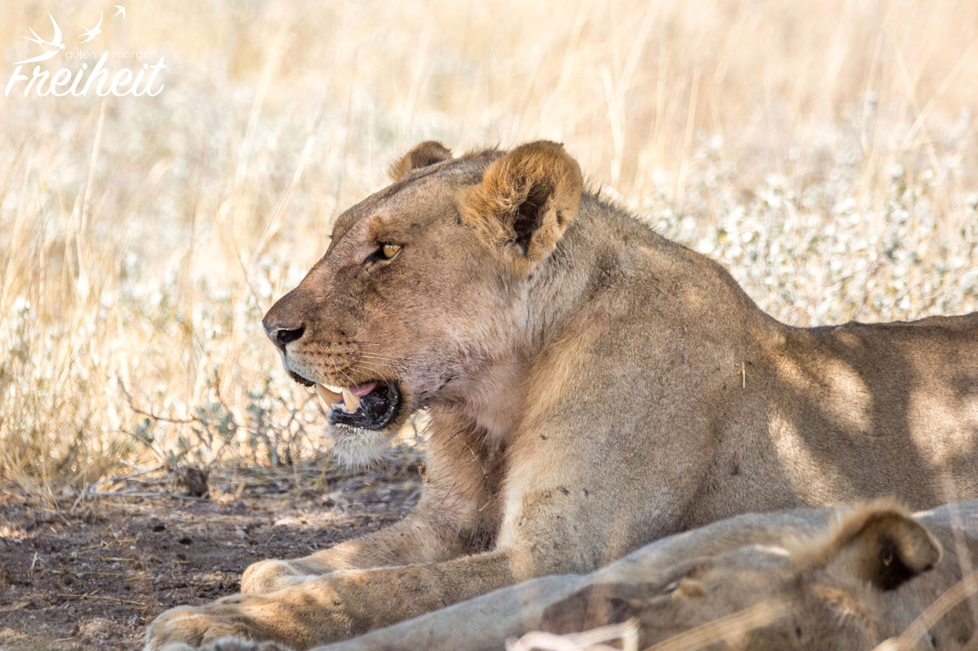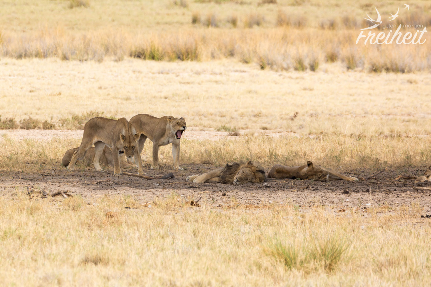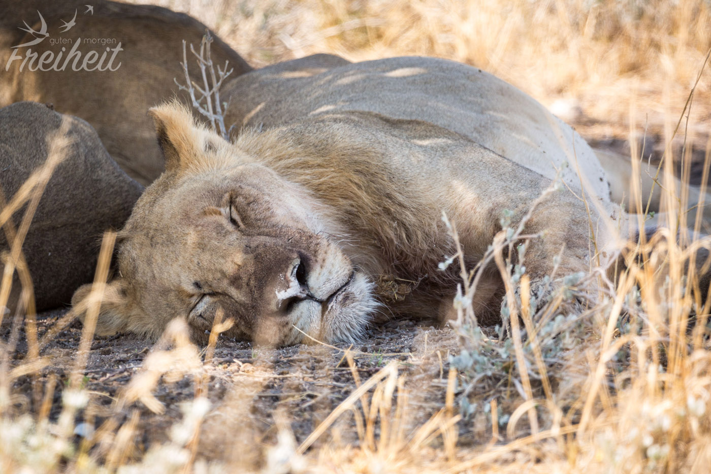Der König der Tiere. Laut Disney 😉 Aber definitiv eins der Highlights auf Safari! Insgesamt hatten wir dreimal das Glück diese stolzen Katzen anzutreffen. Das erste Mal war es allerdings nur ein Weibchen von hinten – mitten im Gebüsch und gaaanz weit weg. Das zweite Mal war immer noch seeeehr weit weg, so dass wir mit bloßen Auge erst mal selbst keine Löwen gesehen haben. Sie lagen wirklich gut versteckt in geduckter Haltung im dunklen Schatten eines großen Baumes. Zum Glück haben wir einen super Feldstecher dabei und unser 600mm Objektiv – wobei letzteres an seine Grenze kam. Wie soll es die richtige Schärfe finden, wenn das Objekt unserer Begierde so weit weg ist? Versucht haben wir es trotzdem und ein paar Aufnahmen waren dann doch brauchbar 🙂 Sogar zwei junge Simbas waren dabei! Die dritte Begegnung war – fototechnisch – die beste. Hier lagen zwei Weibchen und ein mähnenloses Männchen „nur“ noch 10m entfernt unter einem Baum. Da sie tagsüber eher „faul“ sind, gab es nicht viel zu beobachten. Als sie sich dann auch noch zum Schlafen hinlegten, war das Schauspiel schnell vorbei.