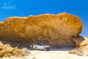Angekommen: dieser Ort heißt Tinkas und wir sind schon mal schwer begeistert von dem riesigen Schatten mitten in der Mittagshitze…Prost!