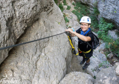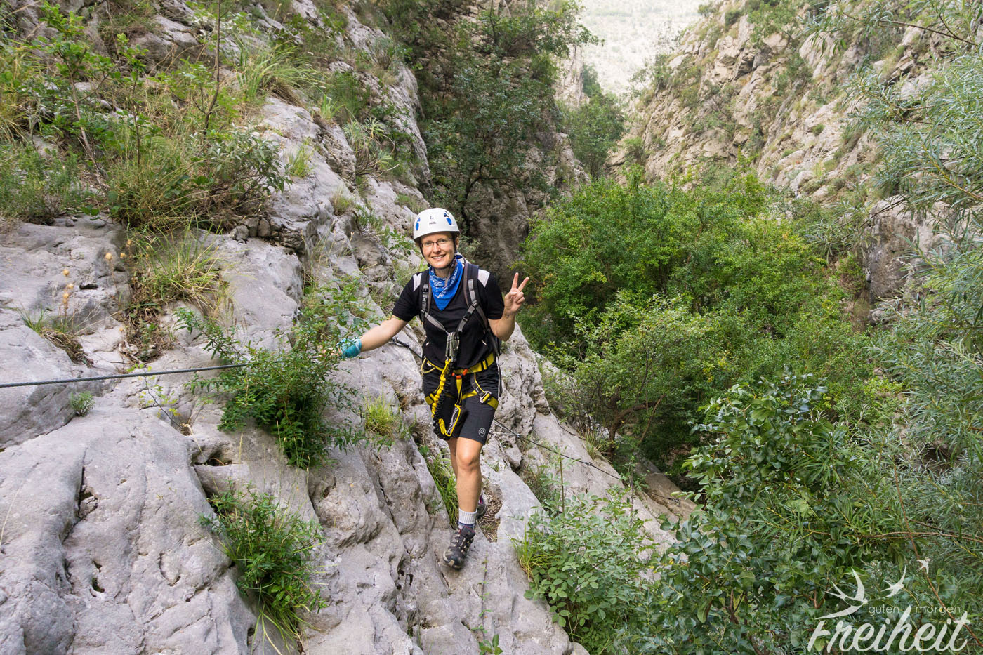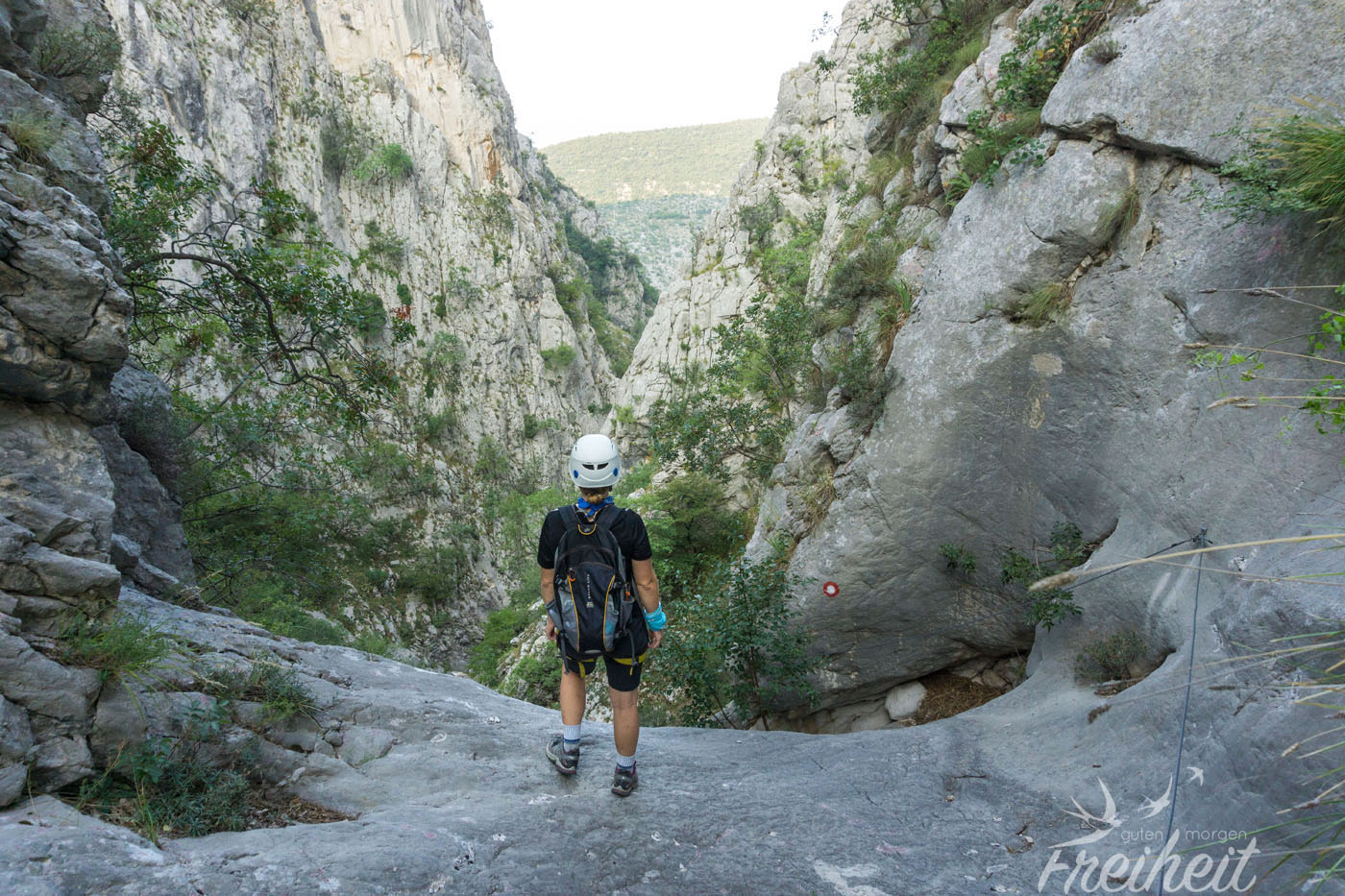Weiter geht es über eine aus Eisenklammern gebaute Leiter, die uns flott in die Senkrechte bringt und viel Luft unter den Popo bringt. Schneller als erwartet sind die 1,5h rum und wir erreichen das Ende des Steigs und stehen um kurz vor 8 Uhr auf einer Anhöhe. Ein Blick zurück zeigt uns die Schlucht durch die wir aufgestiegen sind.
